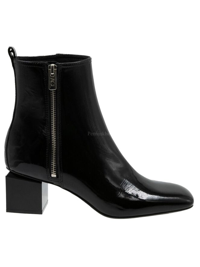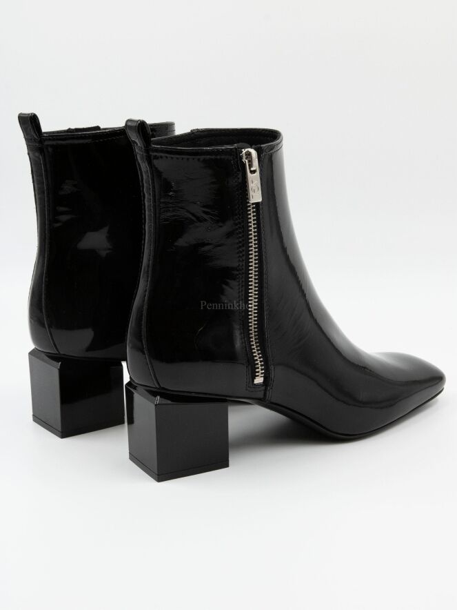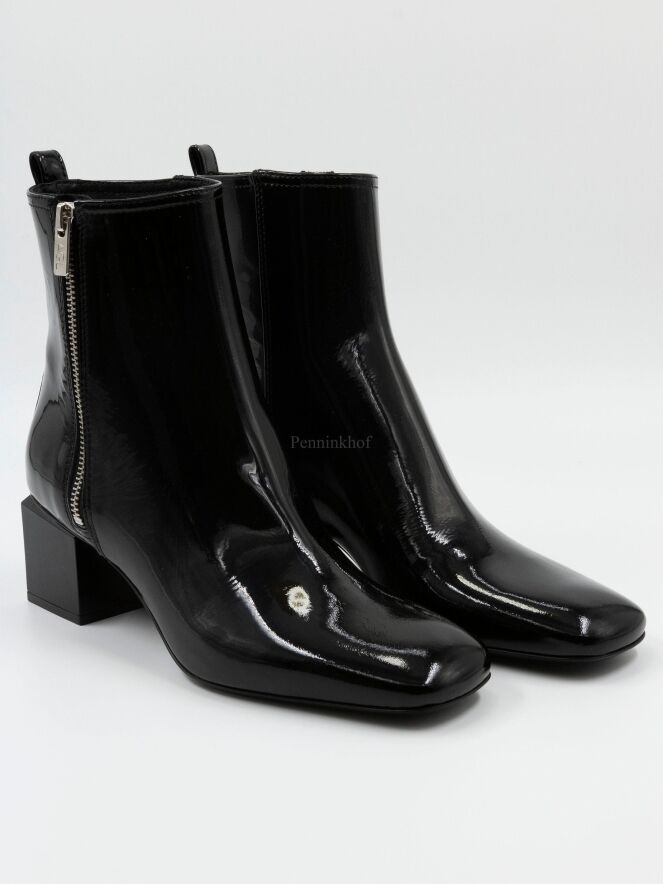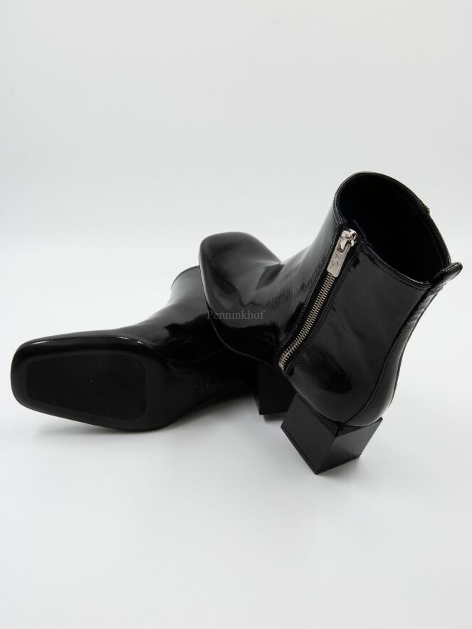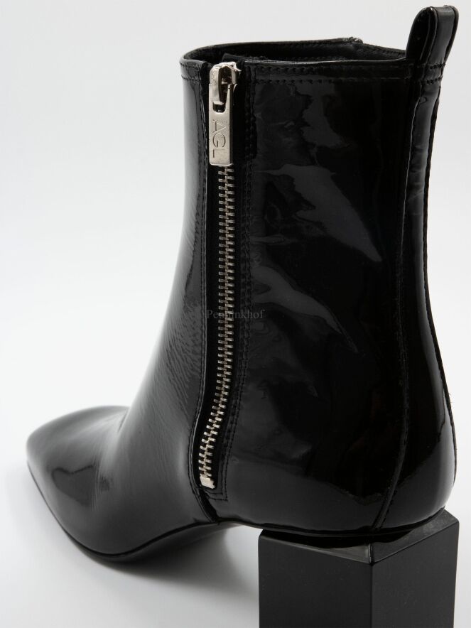 Ein Lackstiefel von AGL in der Farbe schwarz. Der Stiefel hat einen quadratischen Designabsatz. Die Schuhspitze ist quadratisch und an der Innenseite befindet sich ein silberfarbener Reißverschluss. Die Innenseite des Schafts ist mit Leder gefüttert.