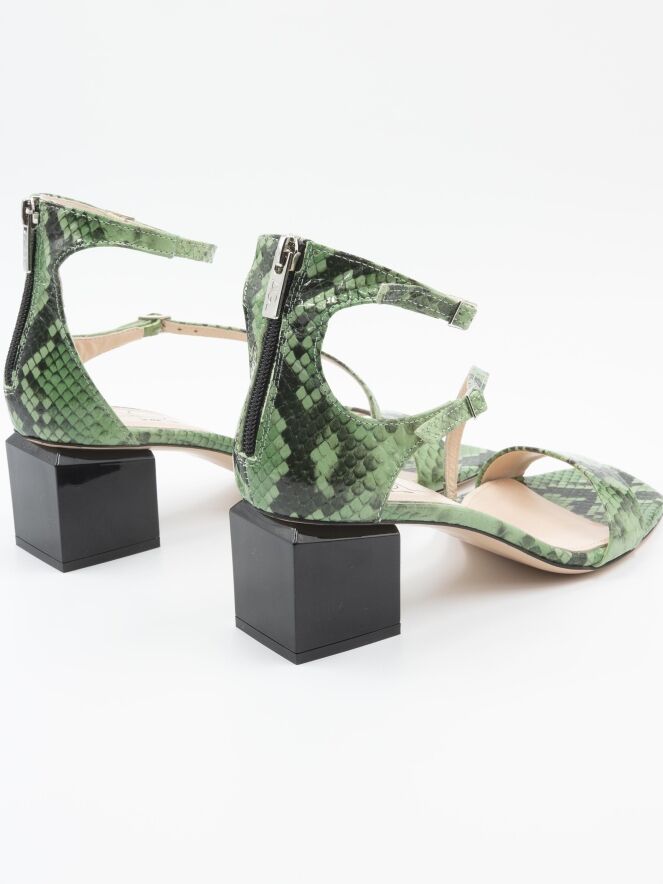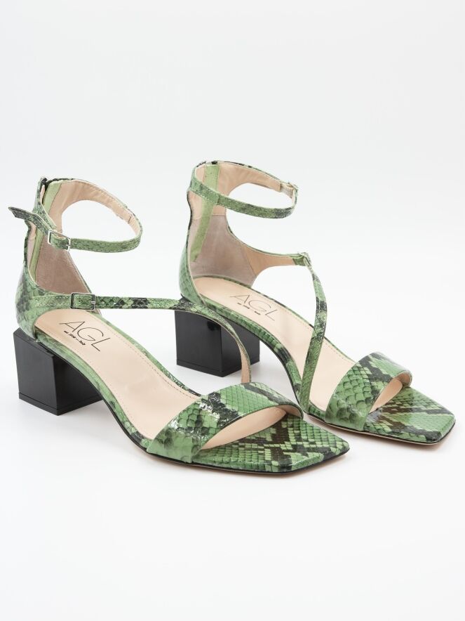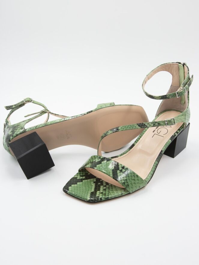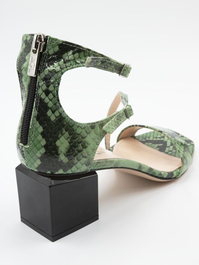 Eine offene Sandale oder Pumps von AGL in einem Krokodil-Print mit mehreren Grün-Tönen. Über den Vorderfuß verläuft ein Riemen mit einem schmalen Besatz, der diagonal von diesem Riemen über den Vorderfuß zur Seite der Ferse geht. Das Fersenband ist verstellbar, und an der Ferse befindet sich ein kurzer Reißverschluss. Der schwarze Designabsatz hat eine glänzende quadratische Form. Das Leder ist innen gefüttert.