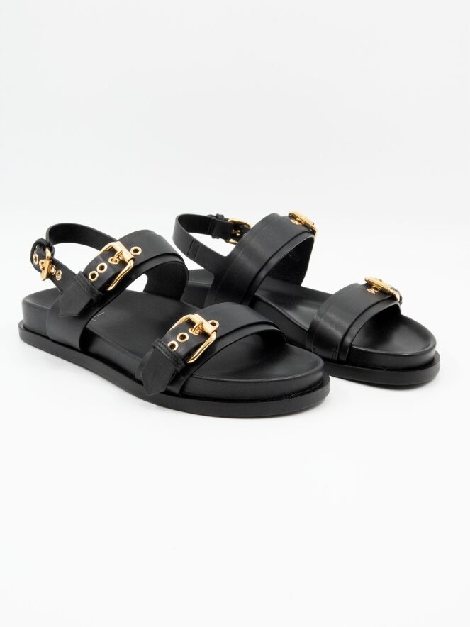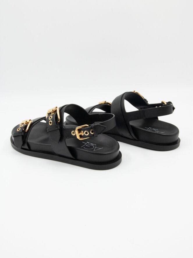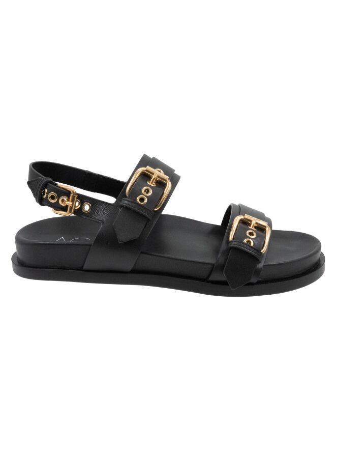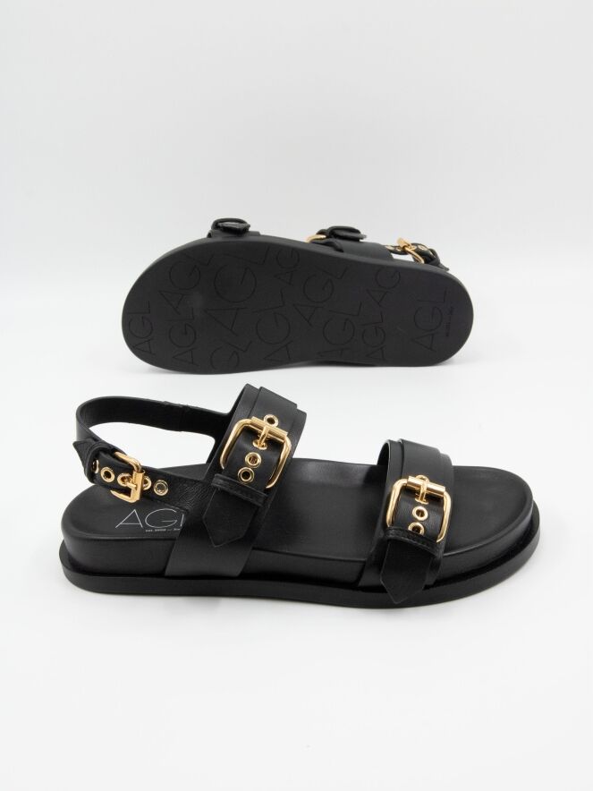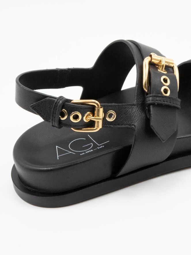 Eine Sandale von AGL in Schwarz. Zwei Riemen verlaufen über den Vorderfuß und sind mit einer dekorativen goldfarbenen Schnalle versehen. Der Fersenriemen ist verstellbar. Die Sohle und das Fußbett sind in Schwarz gehalten.