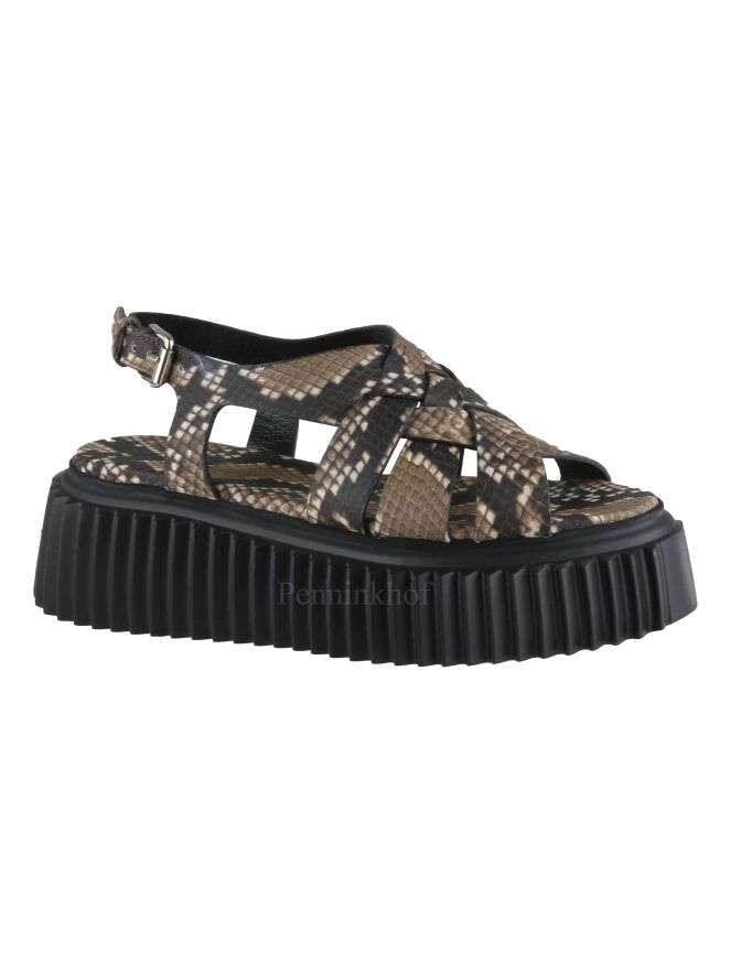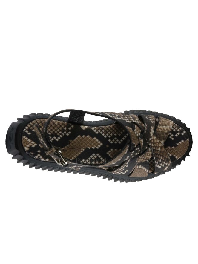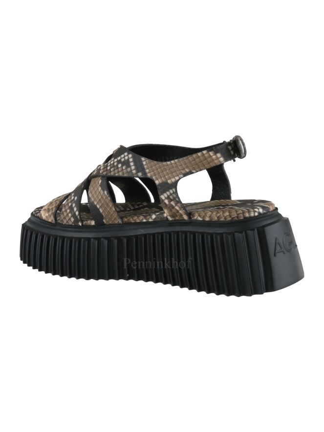Eine Sandale der Schuhmarke AGL mit Python-Print in Schwarz, Cremeweiß und verschiedenen Brauntönen. Das Leder ist in Paspeln über den Vorfuß gekreuzt. Das Fersenriemchen ist verstellbar. Die robuste Designsohle ist vertikal gezackt.