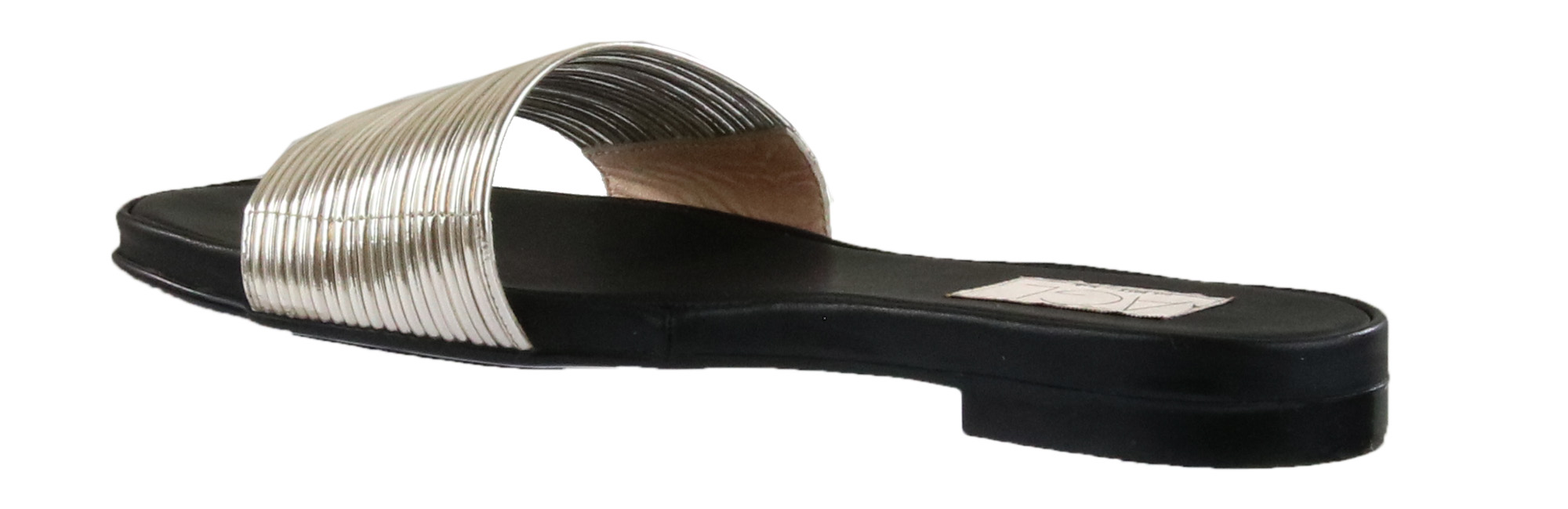 Platinfarbige Sandalette der Damenschuhmarke Attilio Giusti Leombruni. Der vordere Teil ist mit zarten runden Lederbändern auf einer schwarz gefärbten Sohle bedeckt.