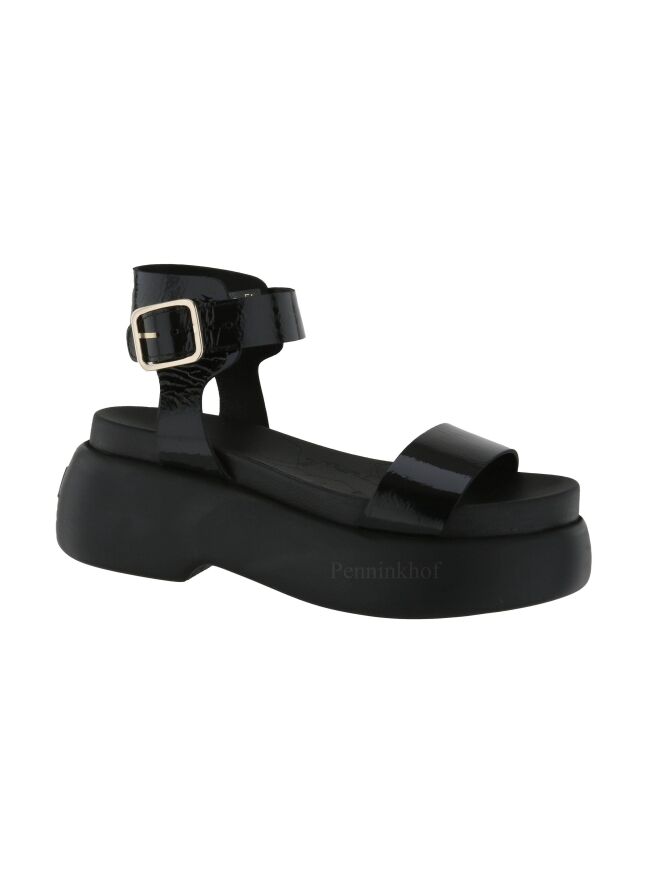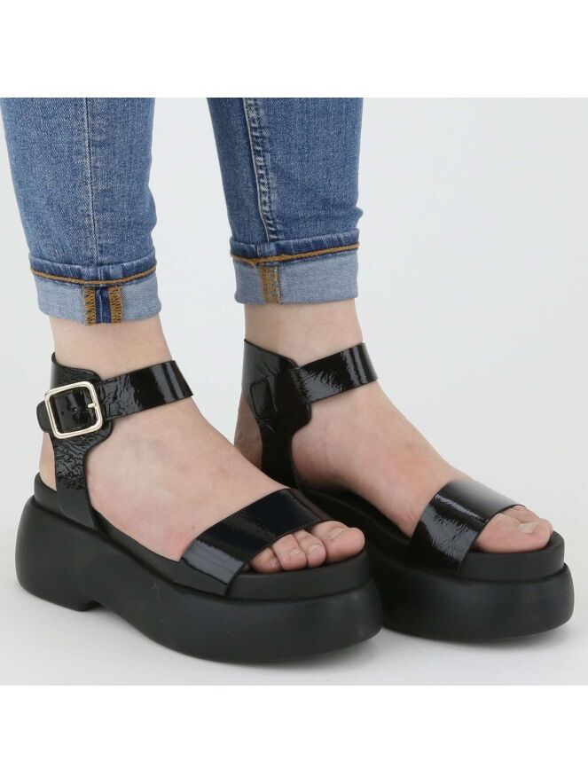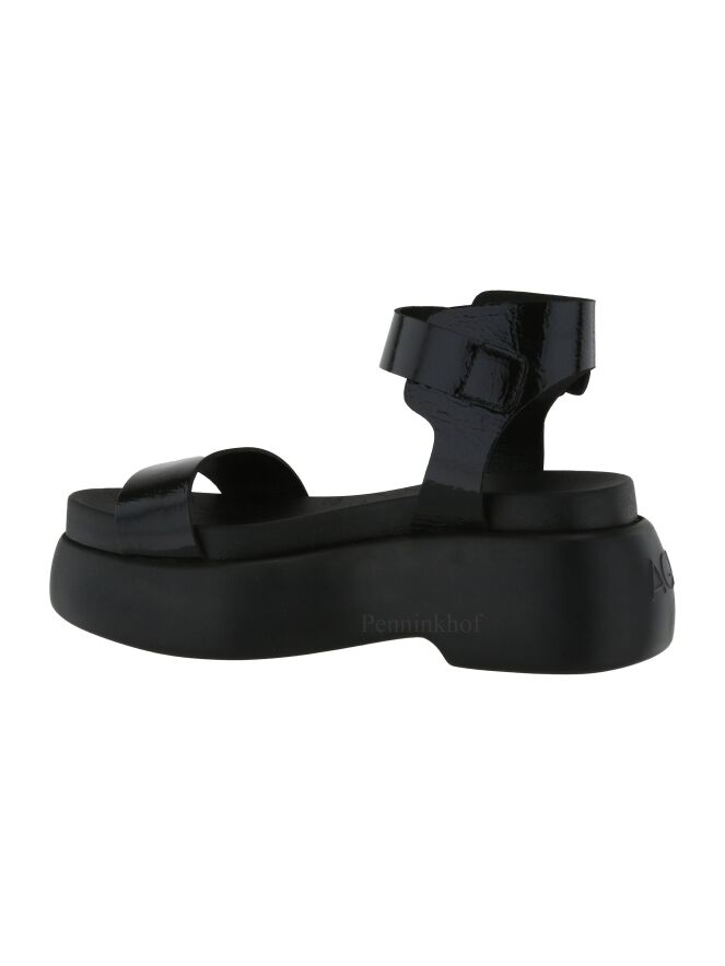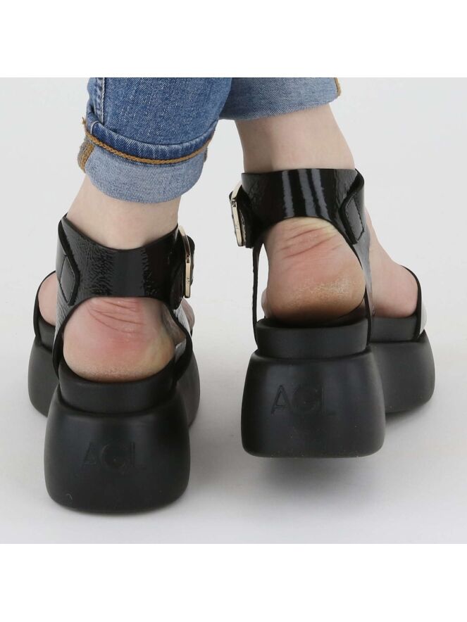 Eine Lackleder-Sandalette in Nude der Designerschuhmarke AGL. Die Sandale hat eine Design-Plateausohle mit einem edlen Fußbett mit grafischem Druck der 3 Töchter von AGL. Auf dem vorderen Fußteil verläuft ein Riemen aus Lackleder. Der Knöchelriemen ist verstellbar.