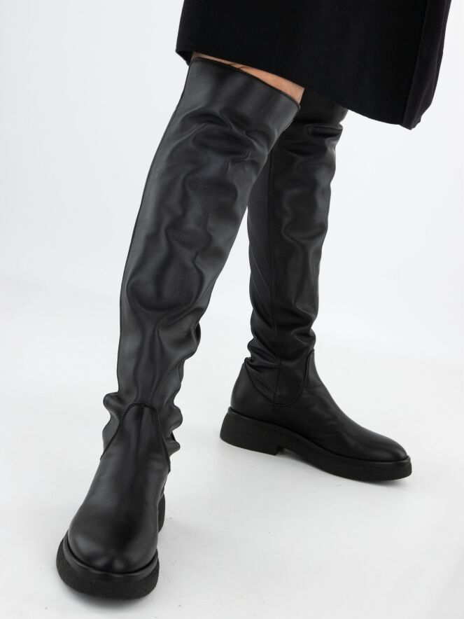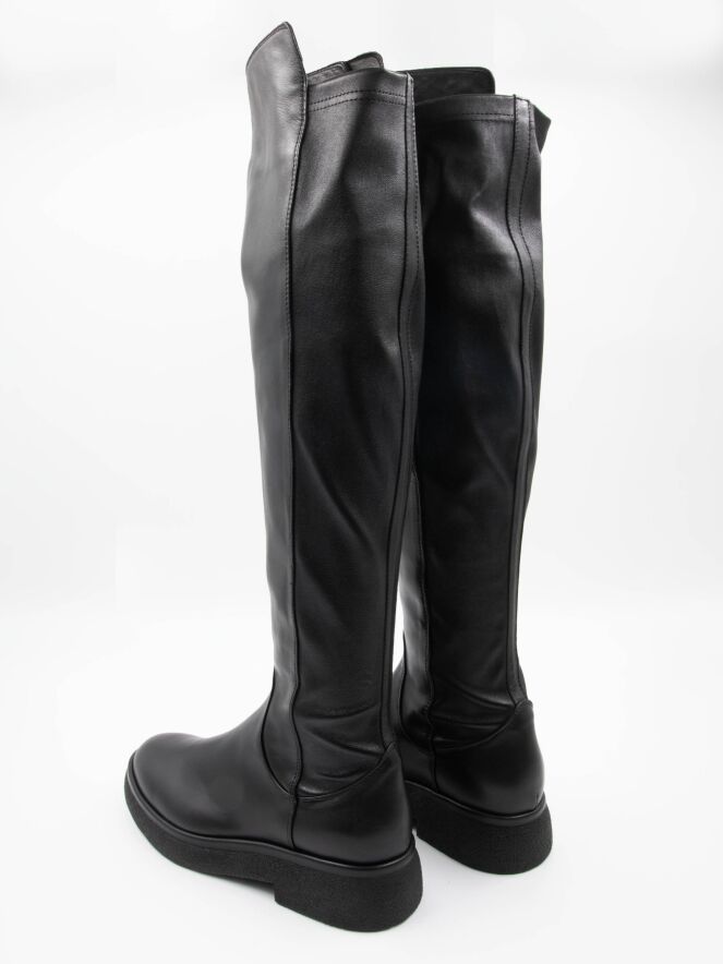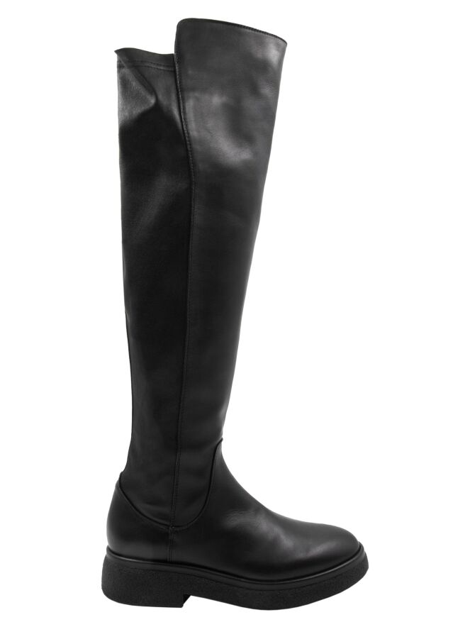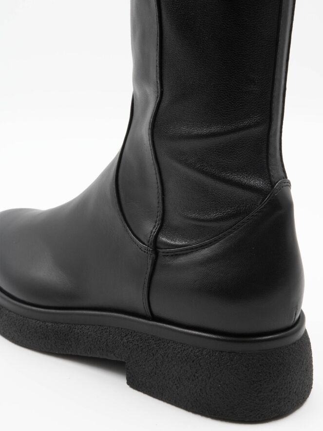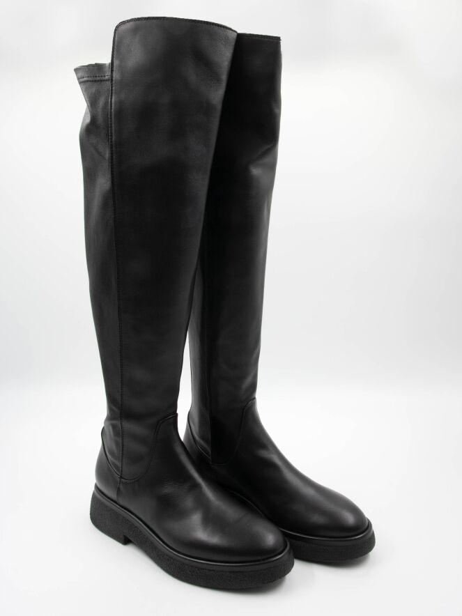 Ein luxuriöser hoher Tube-Stiefel von AGL in Schwarz. Der Vorfuß und die Vorderseite des Schafts sind aus weichem und geschmeidigem Nappaleder, während die Rückseite des Schafts aus einem luxuriösen Stretch-Imitationsleder gefertigt ist.