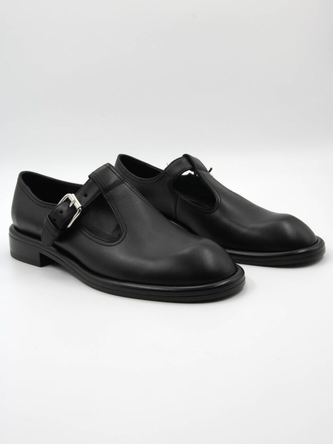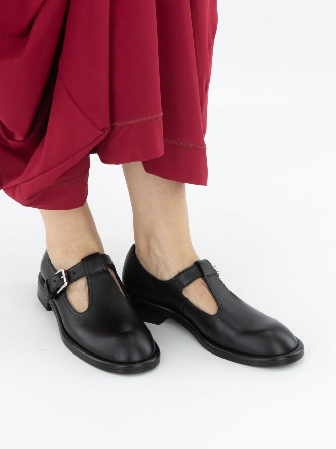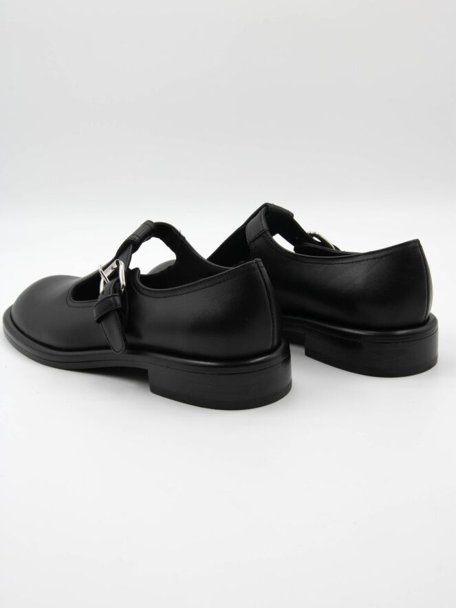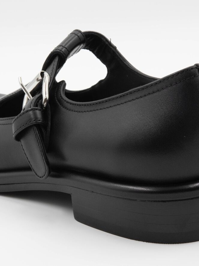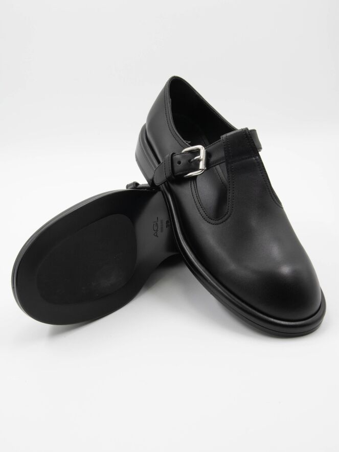 Ein Slipper von AGL im "Mary Jane"-Modell in Schwarz. Der Schuh hat eine runde Zehenpartie und der Riemen über dem Vorderfuß ist verstellbar.