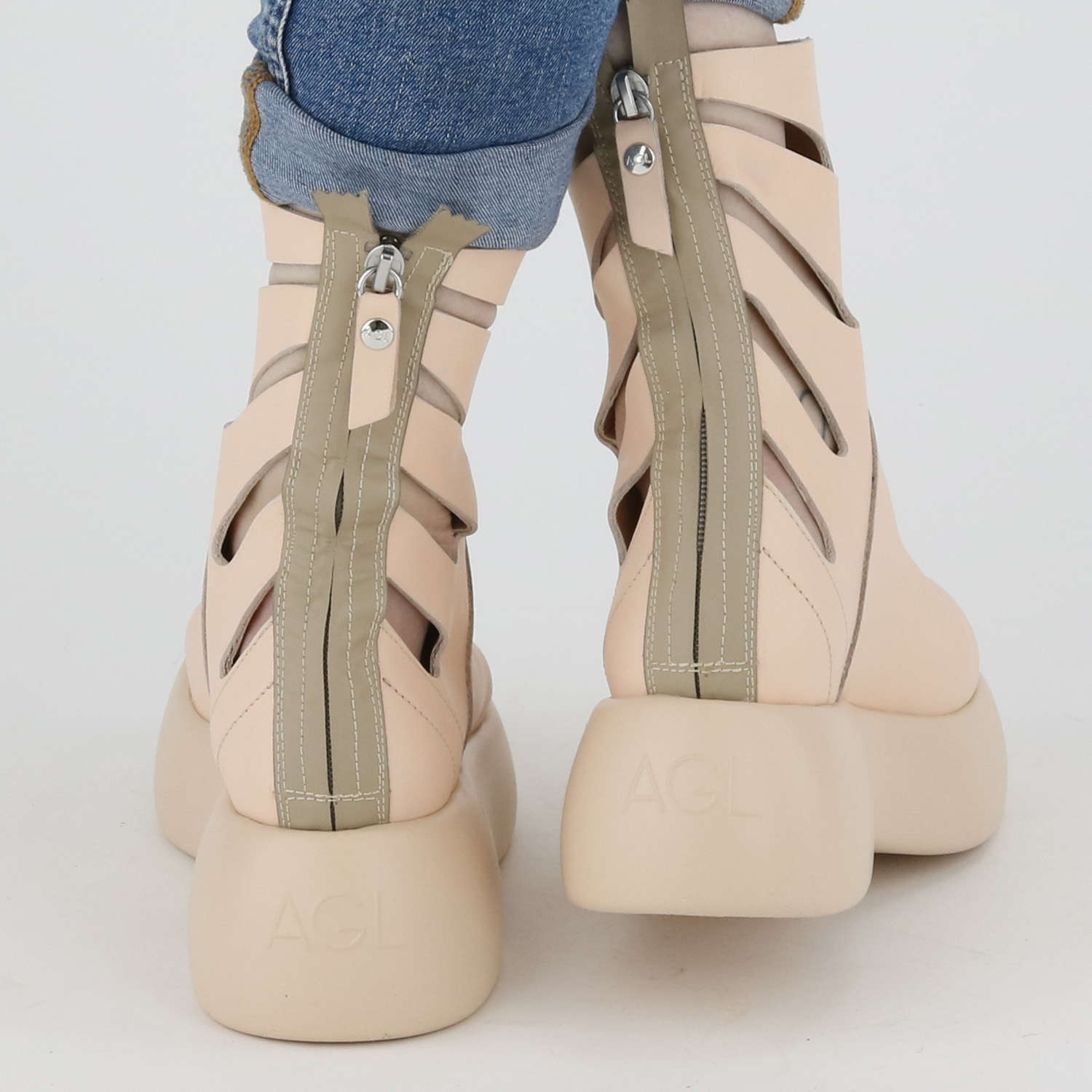 Eine Stiefelette der Schuhmarke AGL in Nude. Der Stiefel hat eine Design-Plateausohle in Pastell-Nude. Die Seiten des Schafts haben längliche Öffnungen. Hinten am Schaft befindet sich ein Reißverschluss.