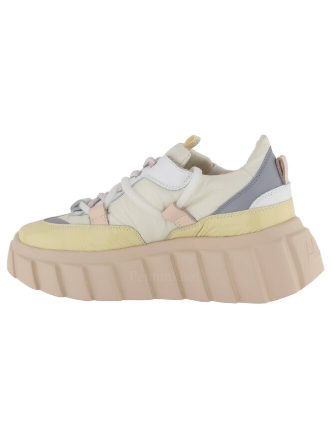 Ein Sneaker der Designerschuhmarke AGL in einer Farbkombination aus einem cremeweißen Fallschirmstoff mit pastellrosa und hellgrauem Leder und pastellgelbem Lackleder. Die vertikal gerippte Sohle ist in Nude gehalten. Entlang der weiß-rosa Schnürung befindet sich weißes Leder. Die Innenseite des Sneakers ist mit Leder gefüttert.