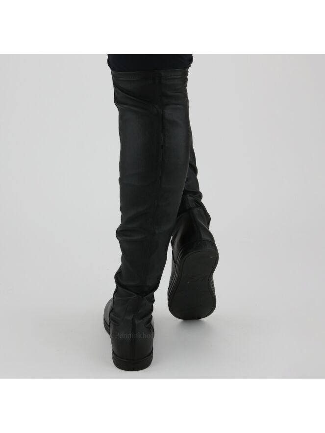 Ein schwarzer Stretch-Overkneestiefel der Designerschuhmarke AGL. Die Vorderseite des Schafts ist aus weichem Nappaleder, die Rückseite aus Stretch-Lederimitat.