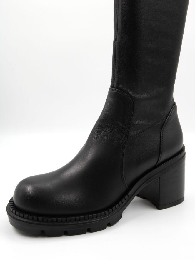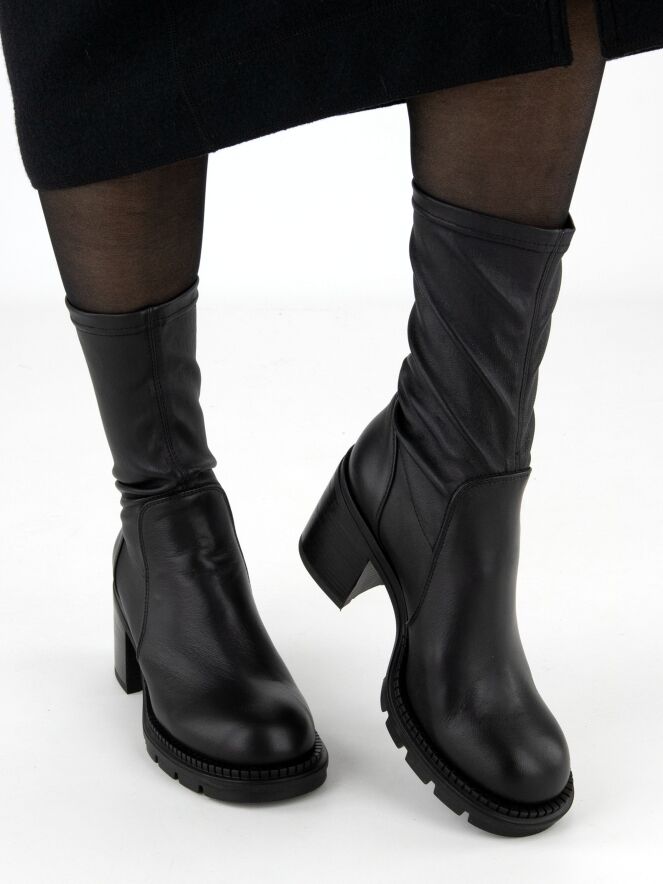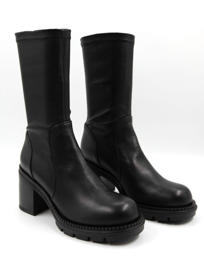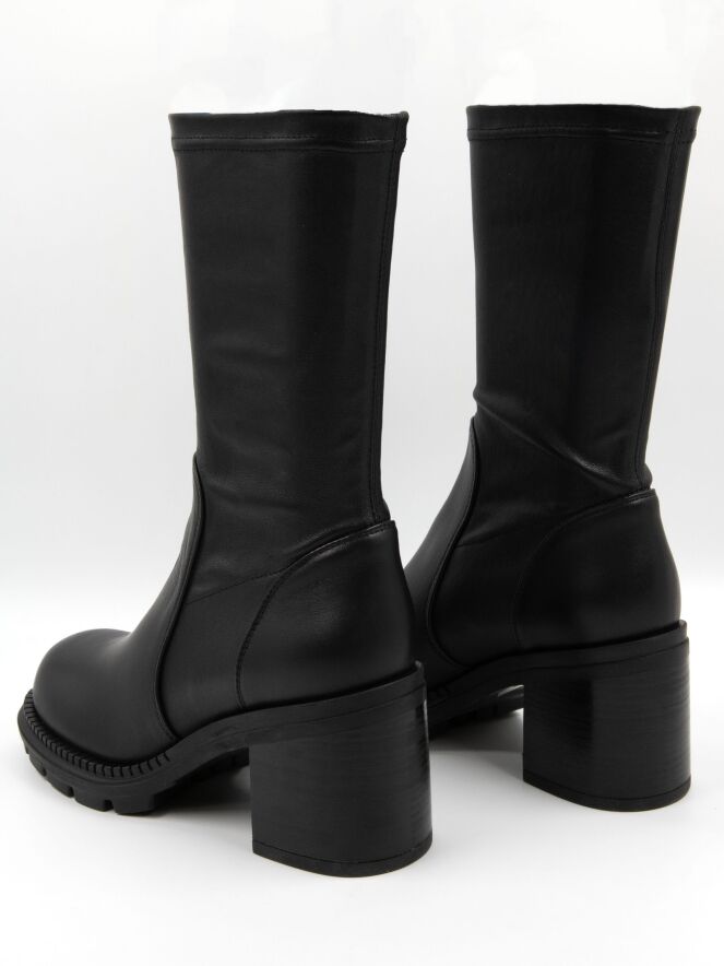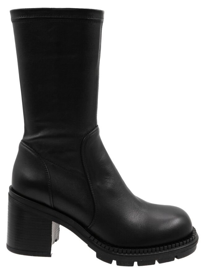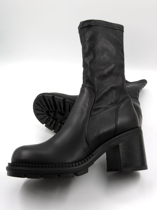 Halbhoher Stiefel von AGL in Schwarz. Der Schaft besteht aus einem elastischen Kunstledermaterial. Der Stiefel hat einen Blockabsatz und eine profilierte Sohle.