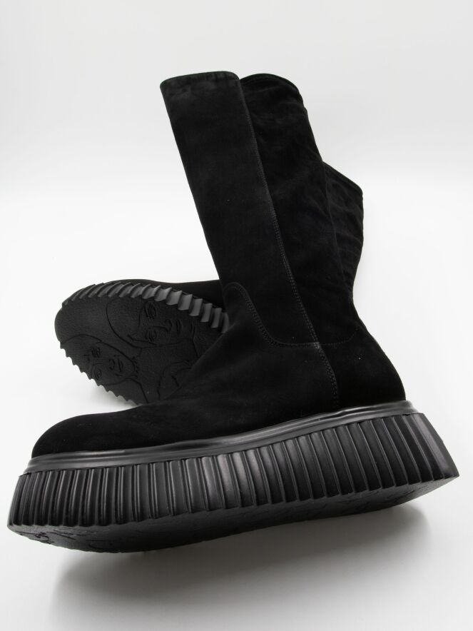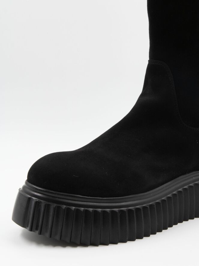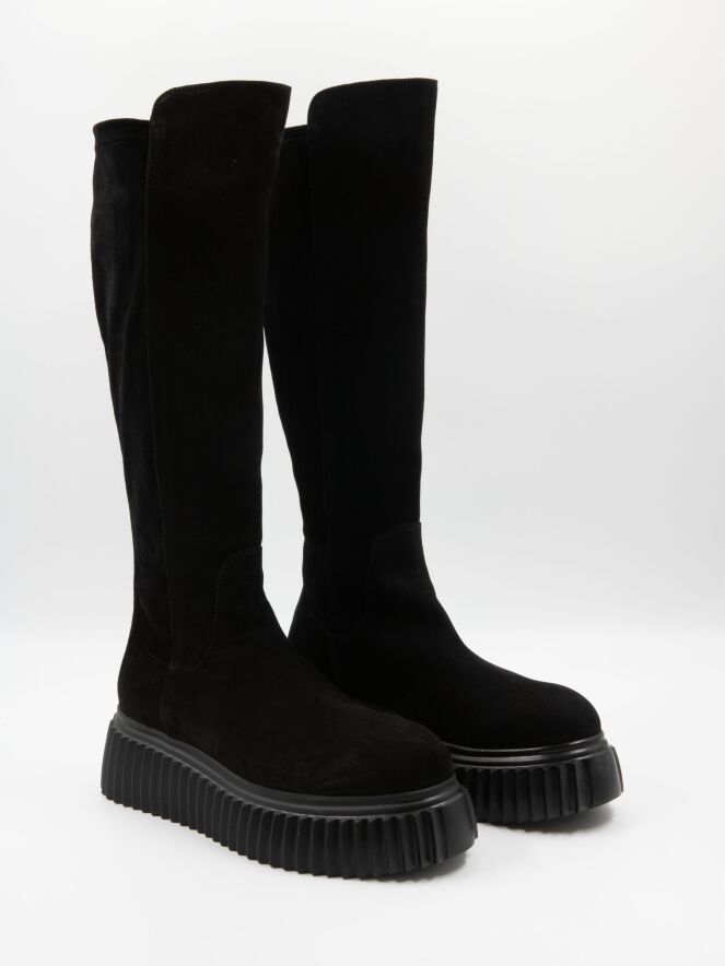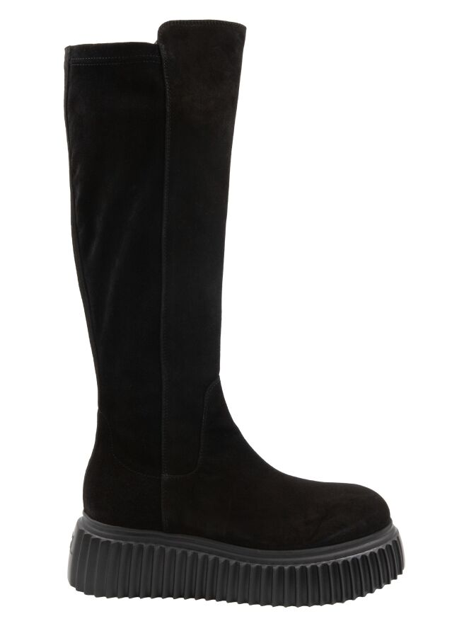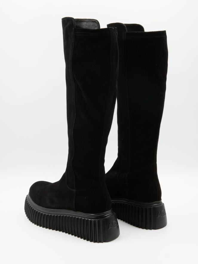 Hoher Stiefel von AGL in der Farbe Schwarz. Die Designsohle ist im Rillenmuster gearbeitet. Der vordere Teil des Schafts und der Fuß sind aus Camoscio-Wildleder gefertigt, während der hintere Teil des Schafts aus elastischem Stoff besteht. Das Innere ist mit Leder gefüttert.