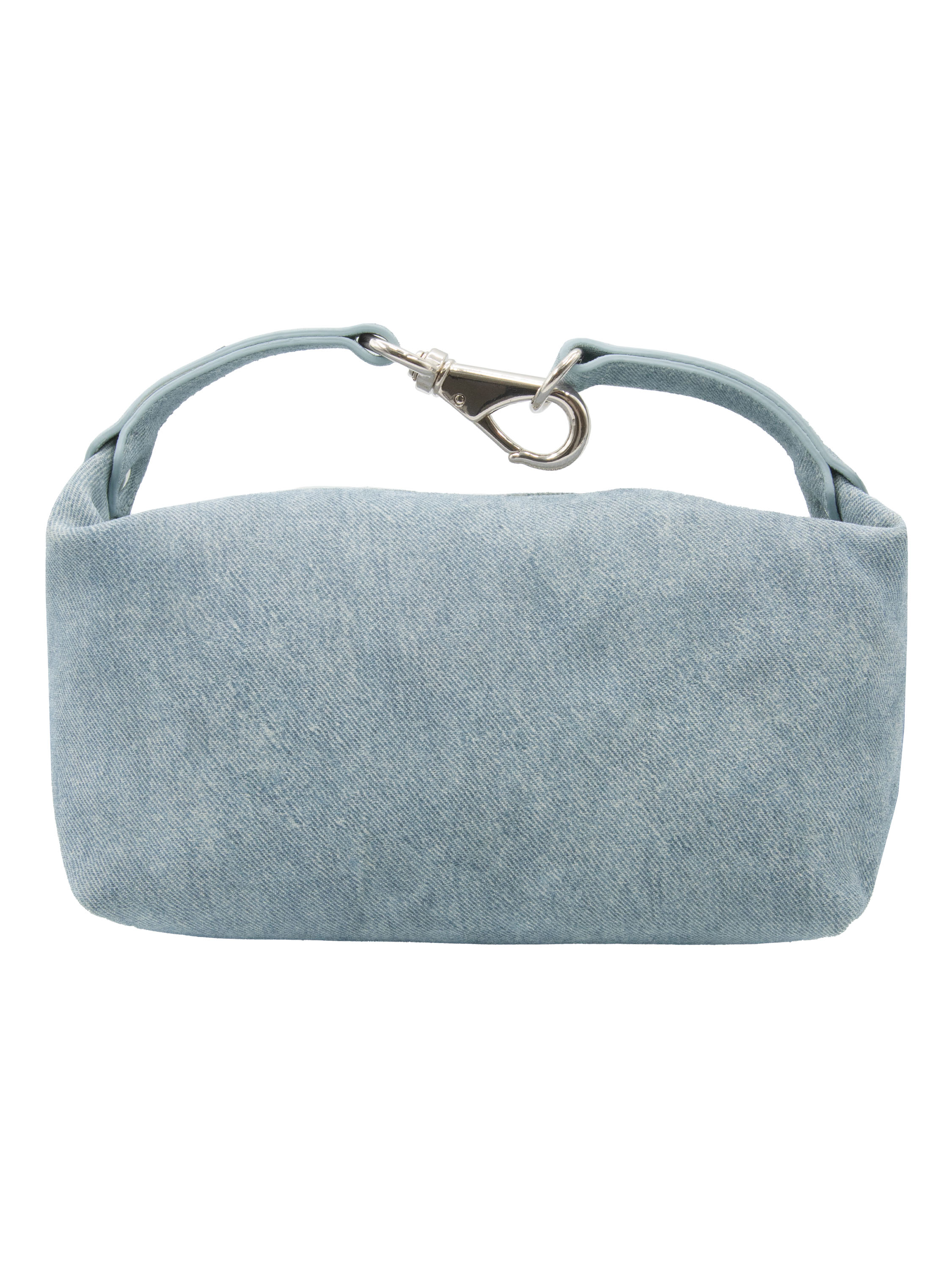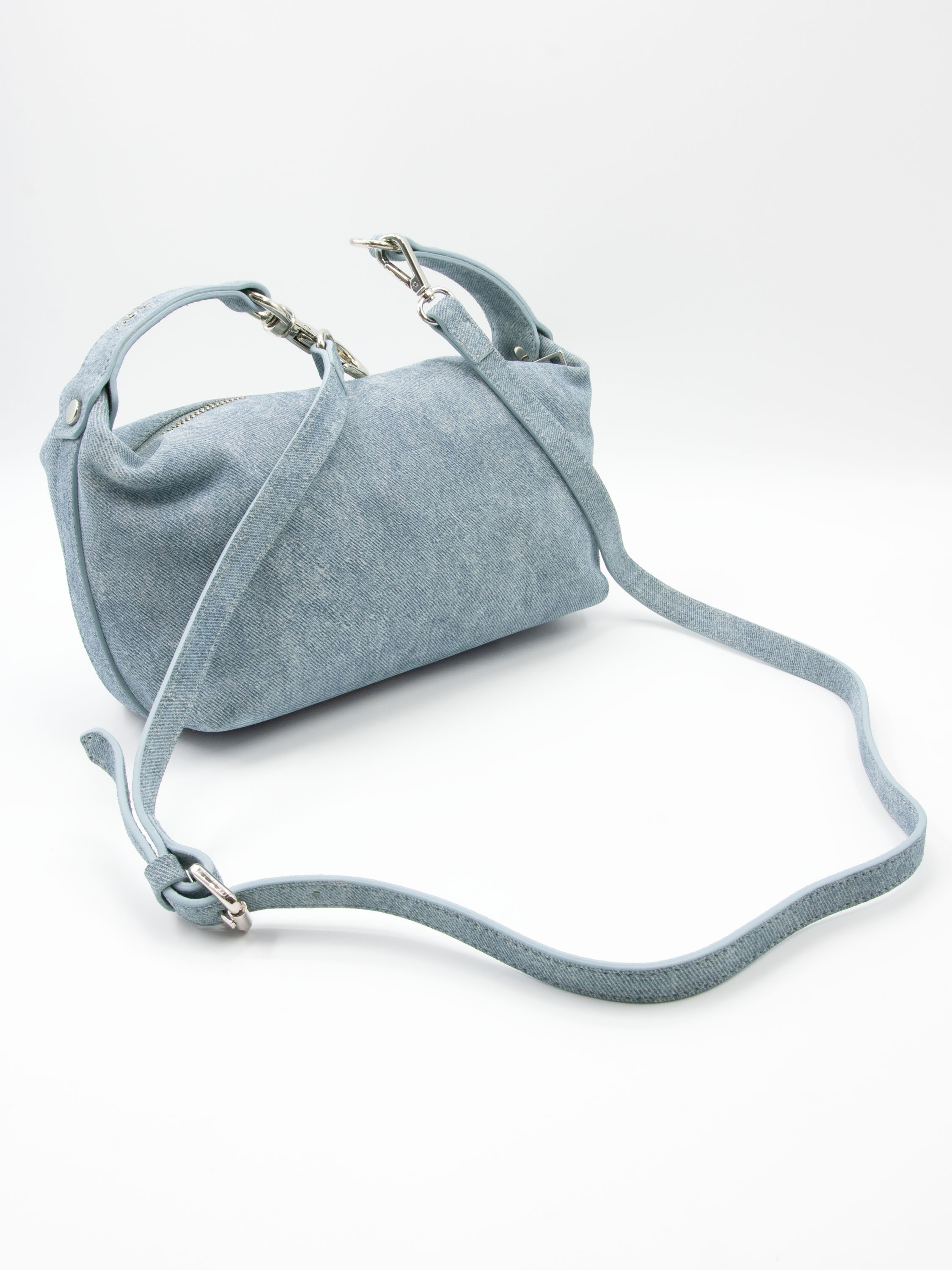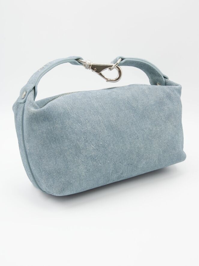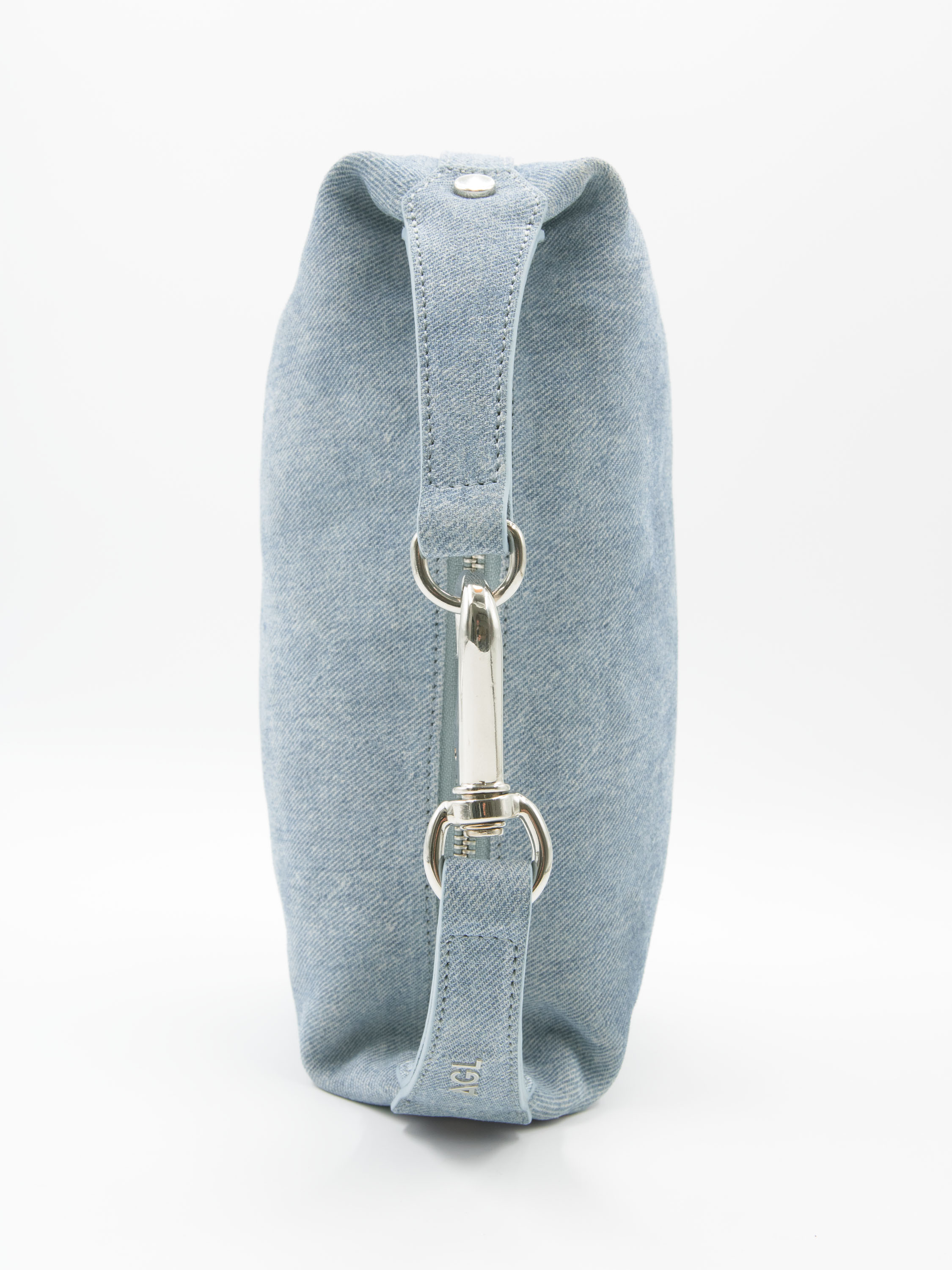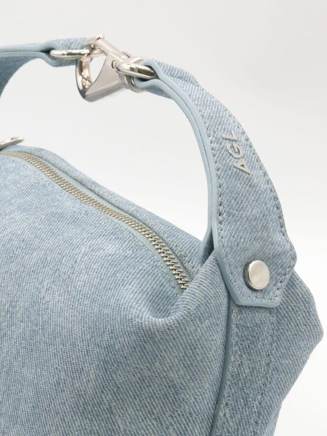 Eine Tasche von AGL in einer Jeansfarbe. Die Tasche verfügt über einen kurzen Henkel mit einer dekorativen Metall-Clip-Verschluss in der Mitte. Zusätzlich ist sie mit einem Reißverschluss ausgestattet.