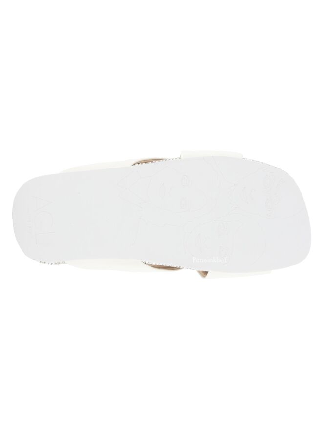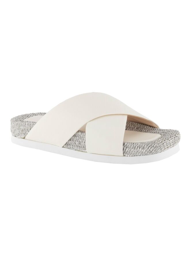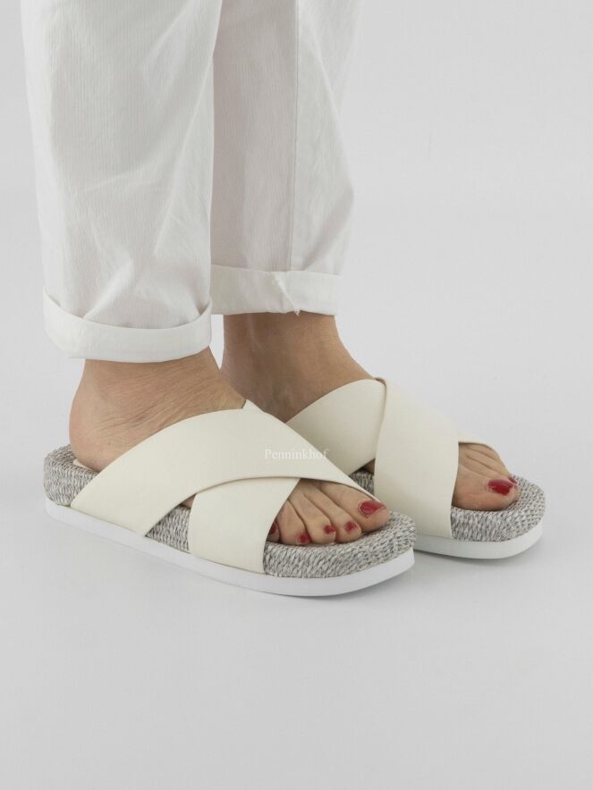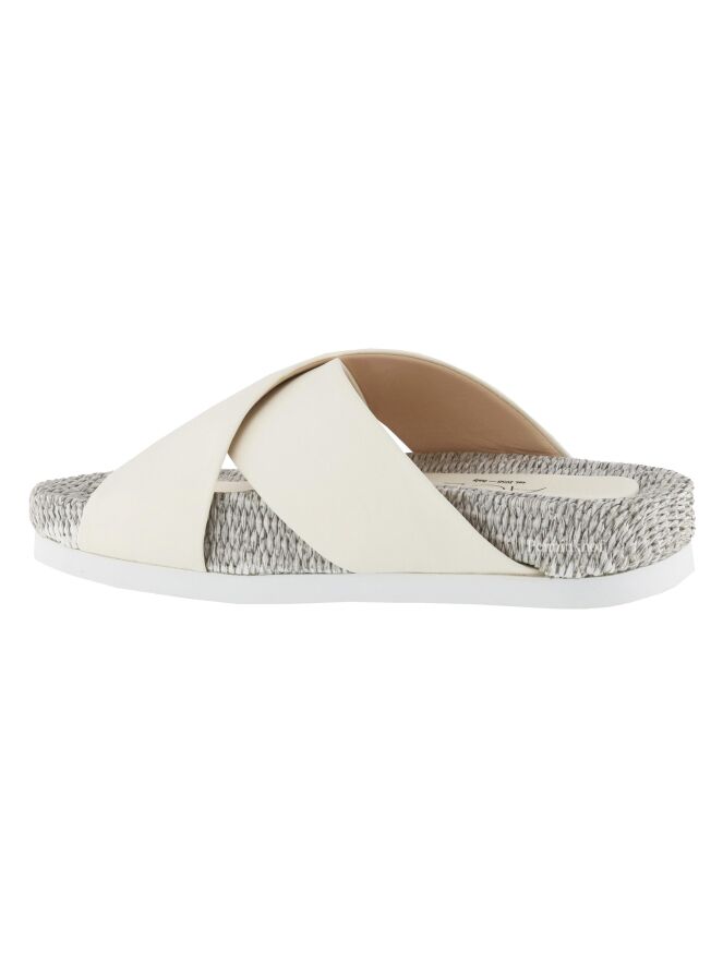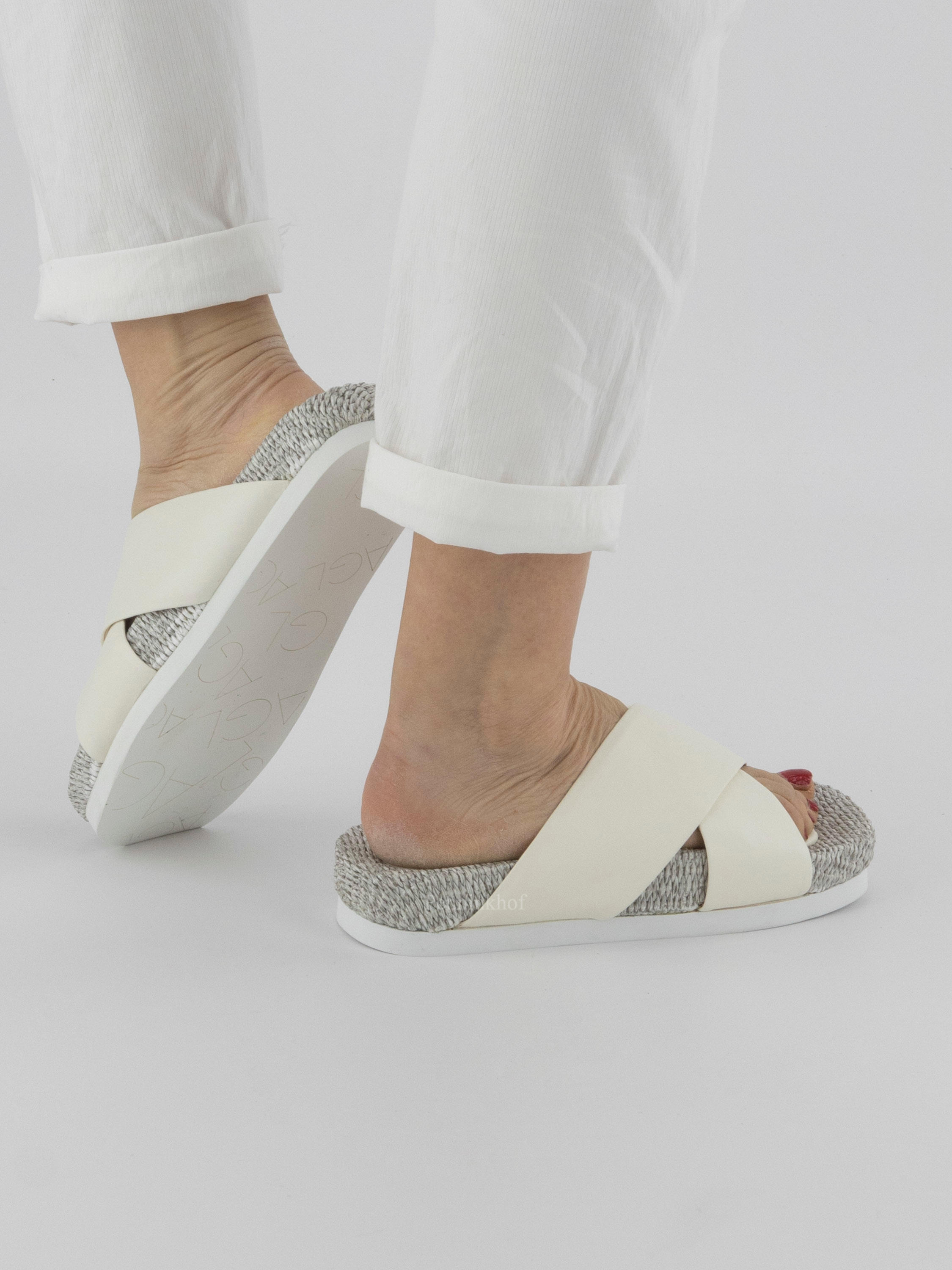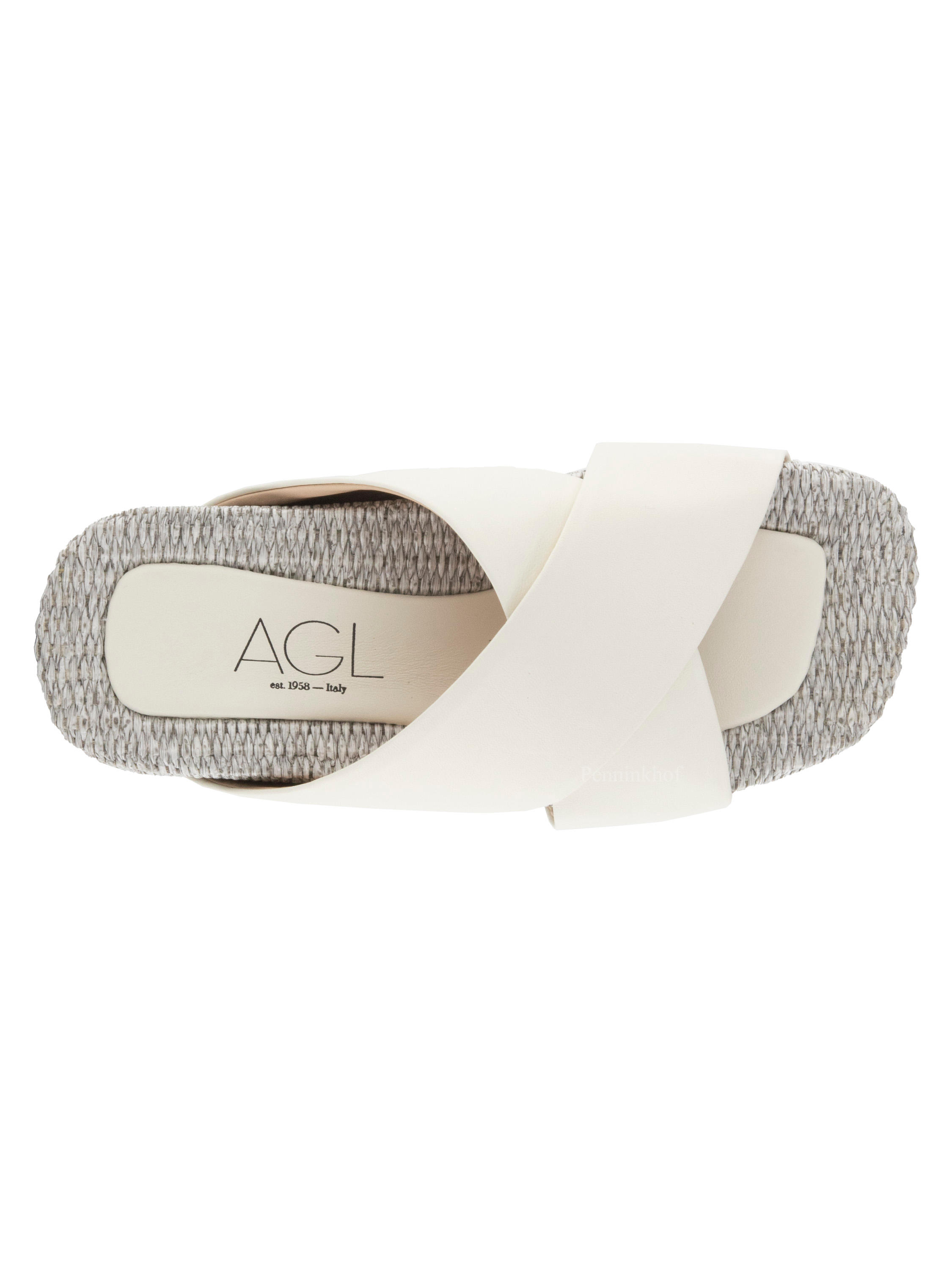 Eine cremeweiße Sandale der Schuhmarke AGL mit gekreuztem Leder. Der Mittelteil des ledernen Fußbetts besteht dieses aus geflochtenem gebleichtem Schilf.