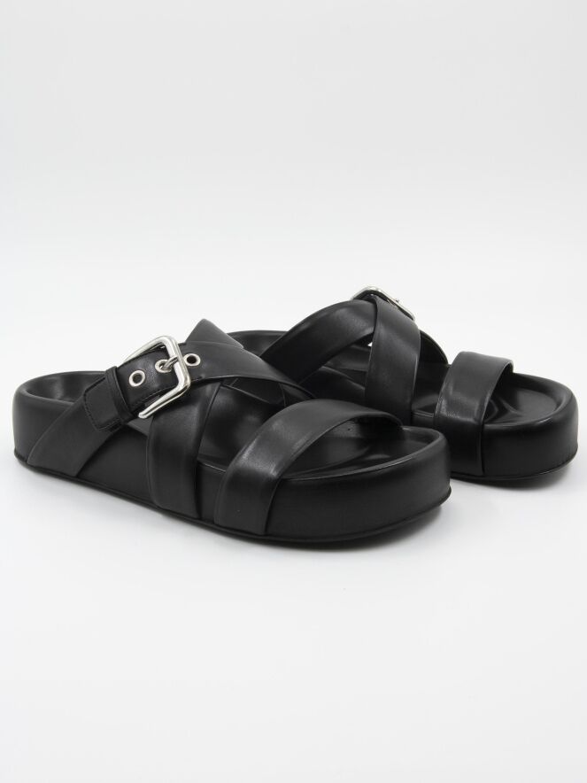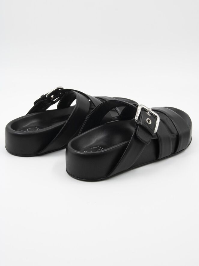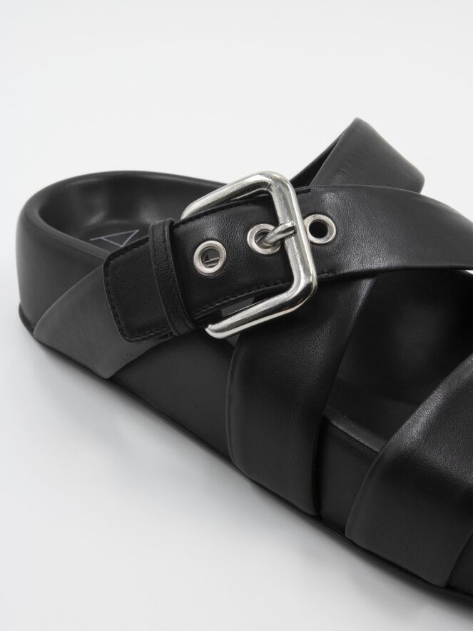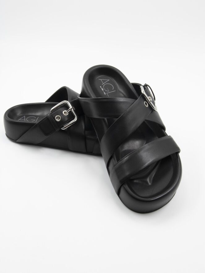 Eine Luxus-Sandale von AGL in Schwarz. Über den Vorderfuß verläuft ein Lederriemen, und davor befindet sich ein gekreuzter Lederriemen, von dem einer verstellbar ist.
