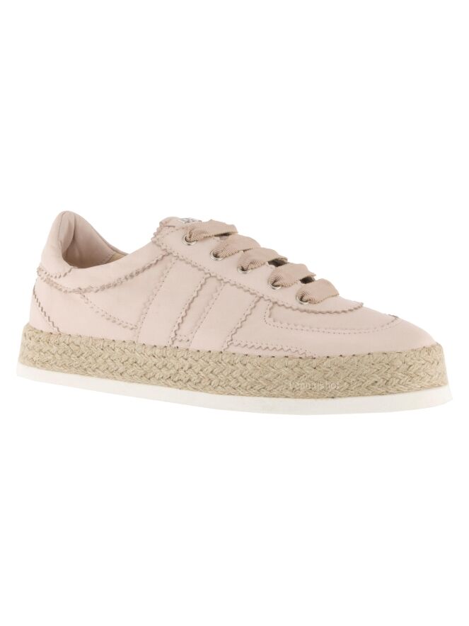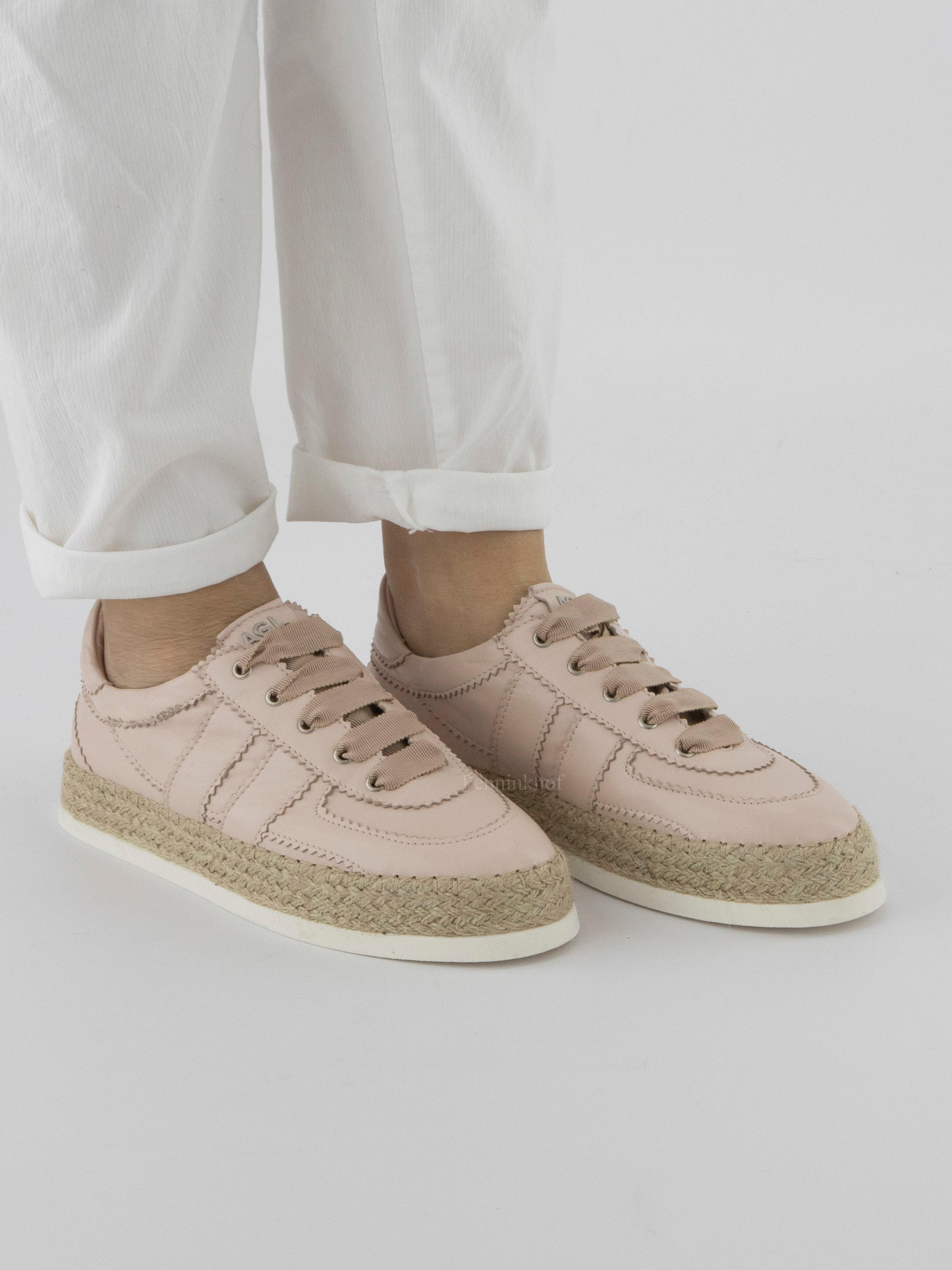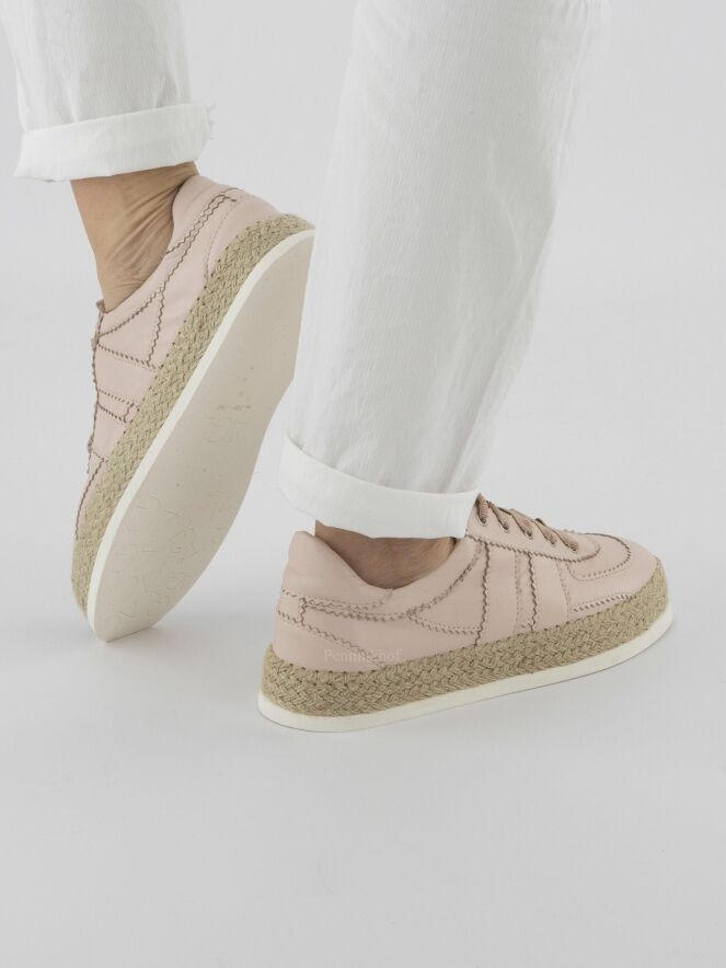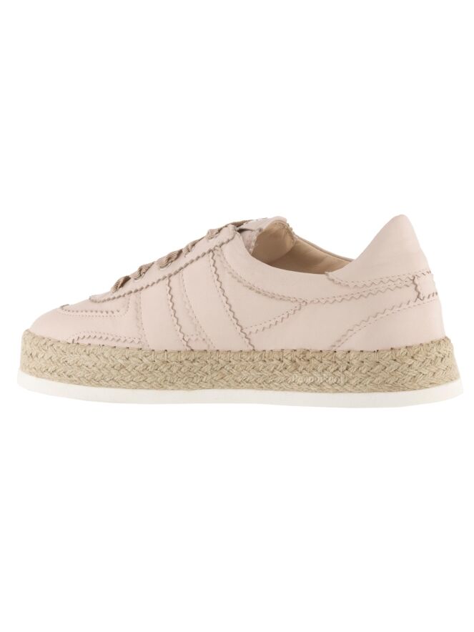 Ein edler hellrosa Sneaker der Designerschuhmarke AGL. Die Steppnähte sind leicht gezackt. Von der cremeweißen Sohle führt ein dekorativer Jutebesatz bis zum Leder. Der Sneaker hat flache, fein gerippte Schnürsenkel. Die Innenseite ist mit Leder gefüttert.