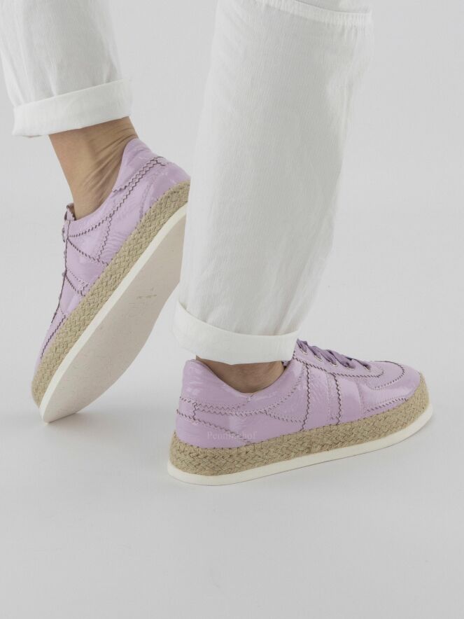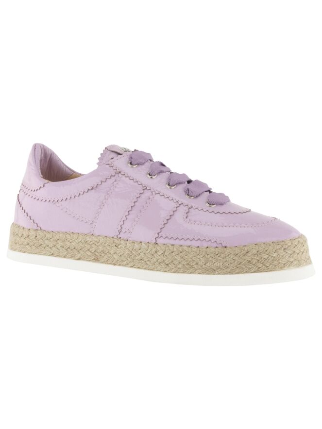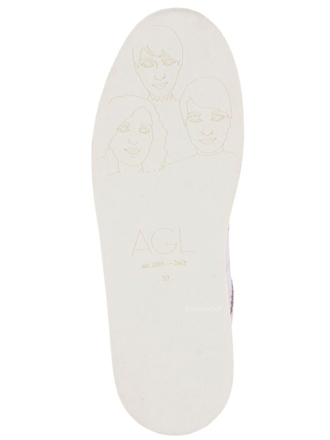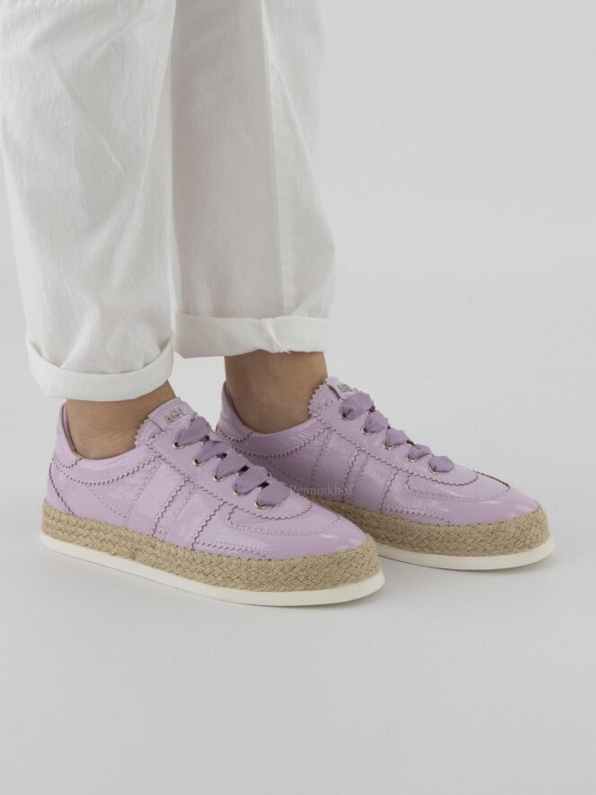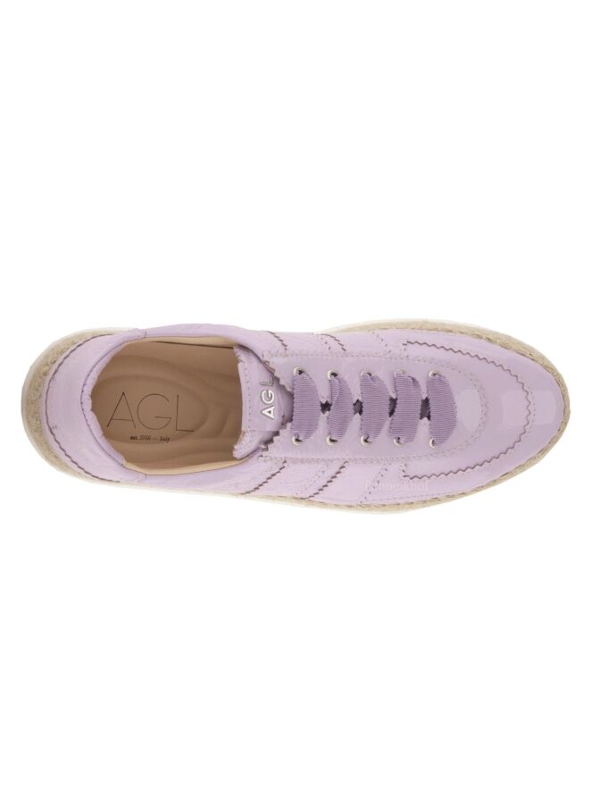 Ein edler Sneaker der Designerschuhmarke AGL in zartem Flieder. Die Steppnähte sind leicht gezackt. Von der cremeweißen Sohle führt ein dekorativer Jutebesatz bis zum Leder. Der Sneaker hat flache, fein gerippte Schnürsenkel. Die Innenseite ist mit Leder gefüttert.