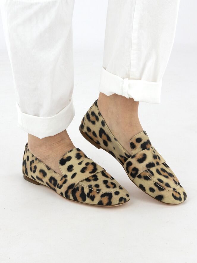 Ein Slipper von AGL (Attilio Giusti Leombruni) im Leopardenprint mit mehreren Taupe-, Cognac- und Schwarztönen. Über dem Vorfuß verläuft ein breiter Riemen. Das Innere ist vollständig mit Leder gefüttert.