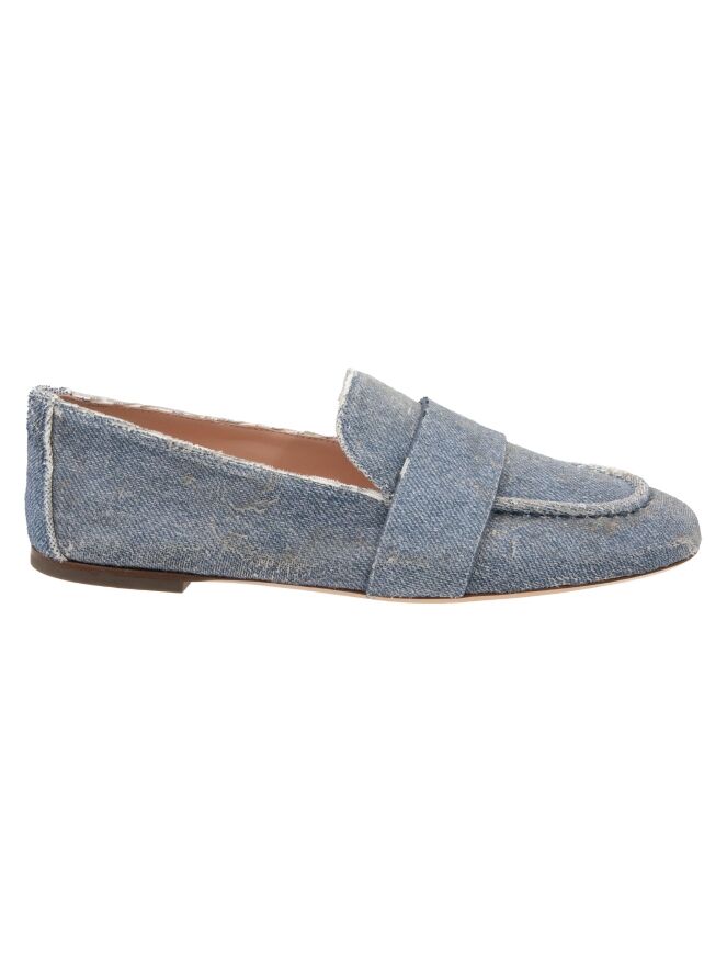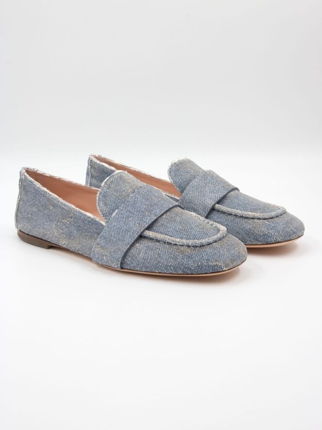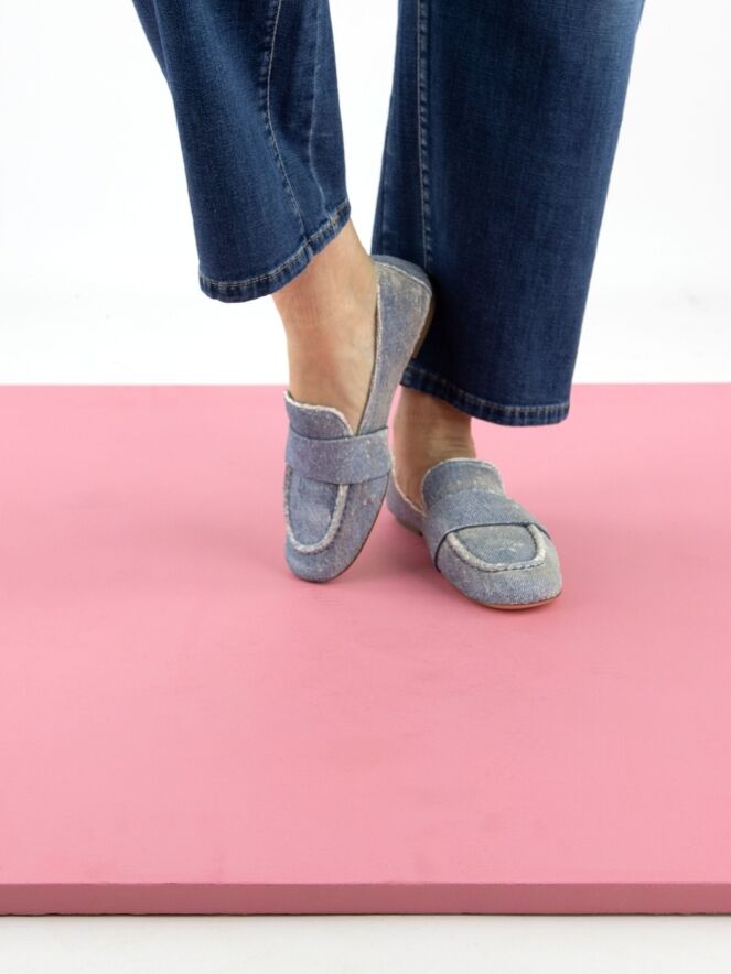 Ein Slipper von AGL aus Veloursstoff in Jeansblau. Über den Vorfuß verläuft ein breiter Riemen. Das Innere ist mit Leder gefüttert.