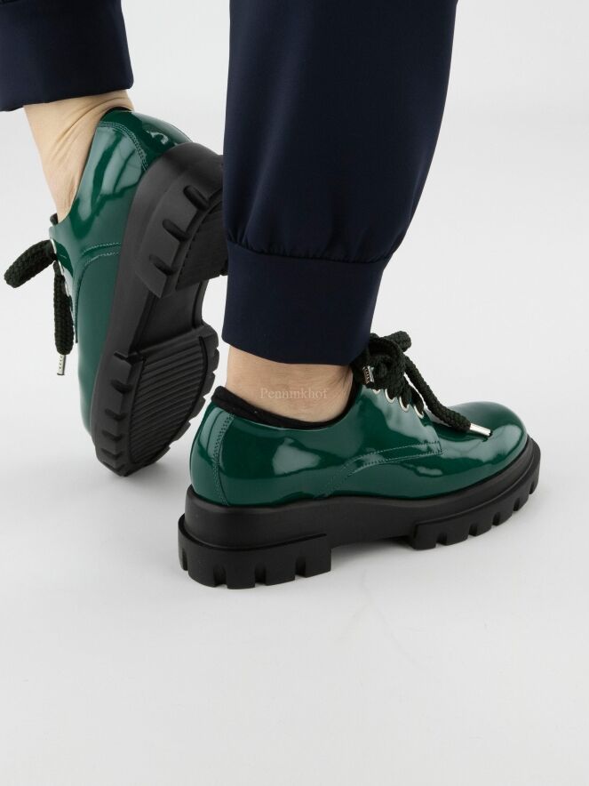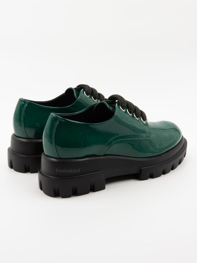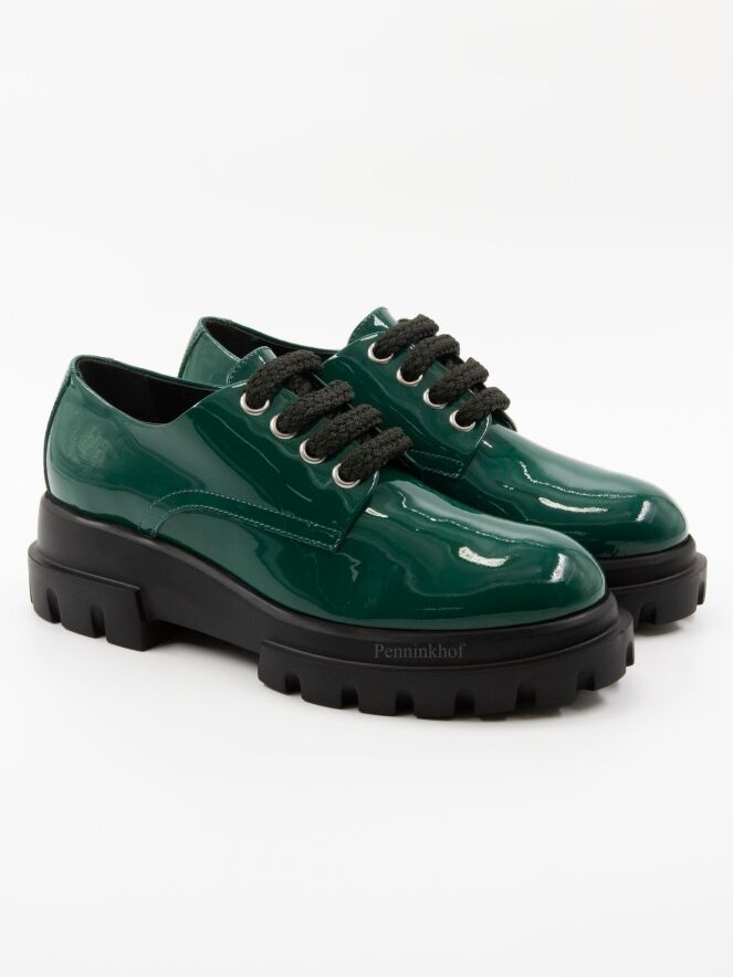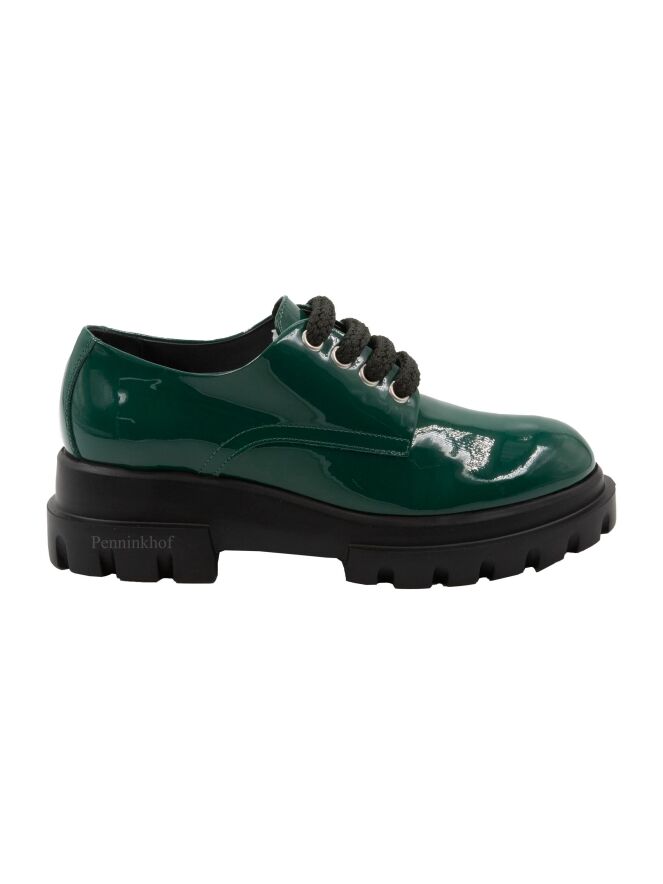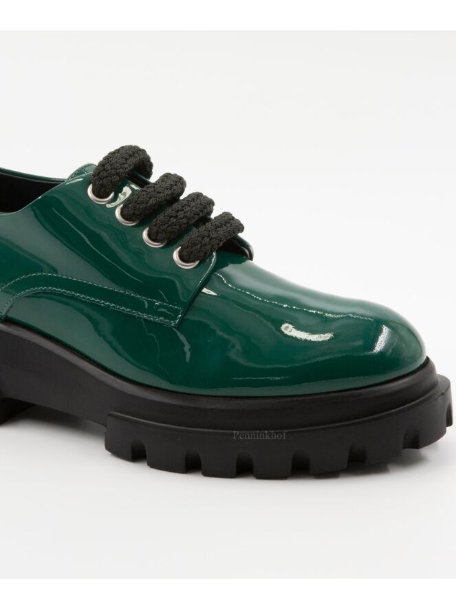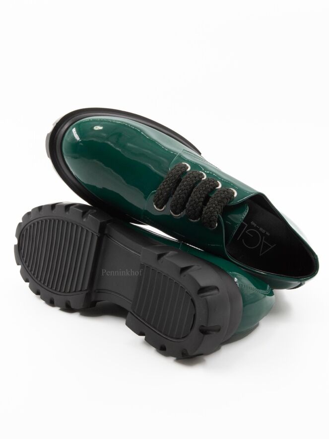 Ein Halbschuh von AGL aus Lackleder in der Farbe Grün. Die Designersohle ist in Schwarz gehalten. Die Innenseite ist mit Leder gefüttert.