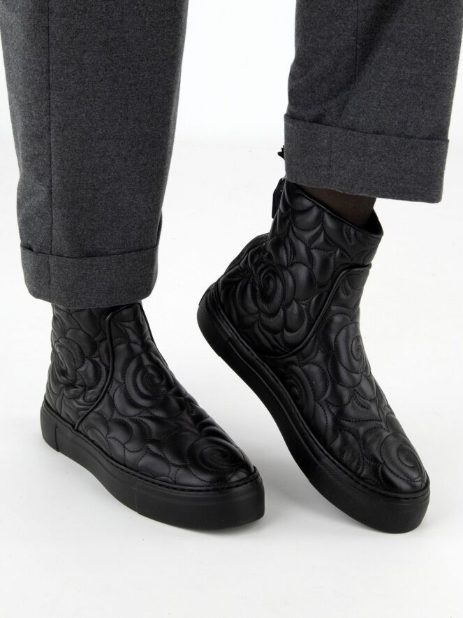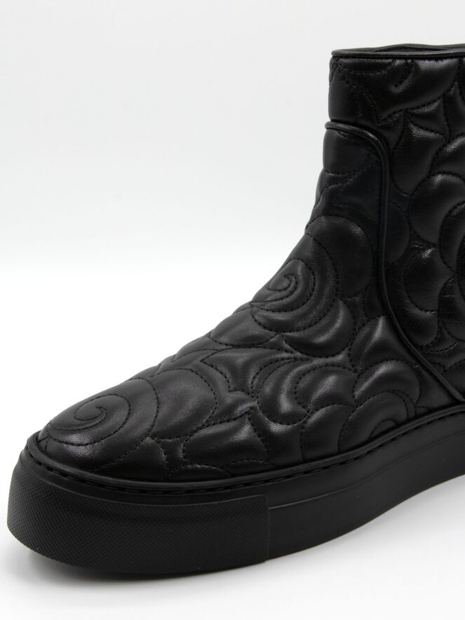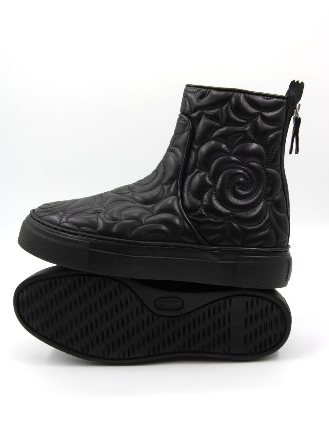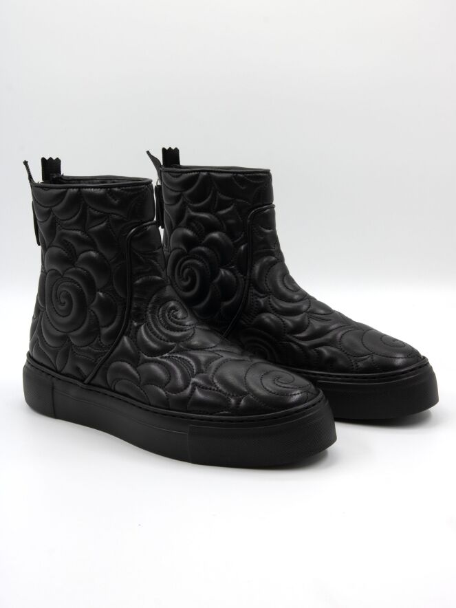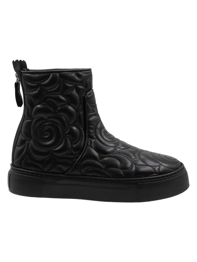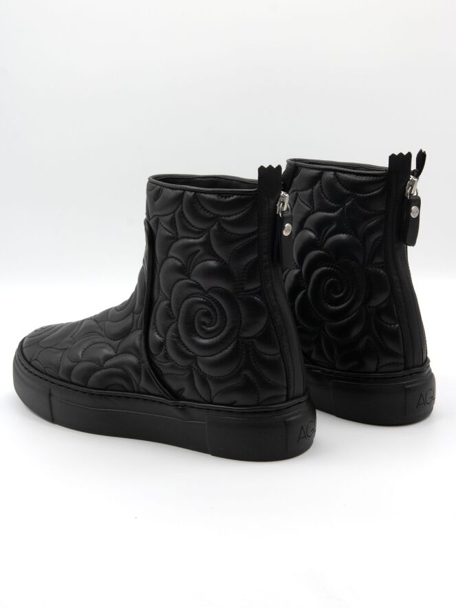 Stiefelette von AGL in Schwarz. Das Leder ist im Broderie-Muster abgesteppt. An der Ferse befindet sich ein Reißverschluss. Die Sohle ist schwarz und das Innere des Schafts ist mit Leder gefüttert.