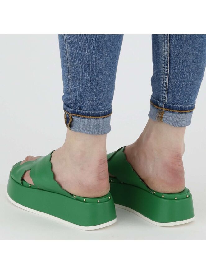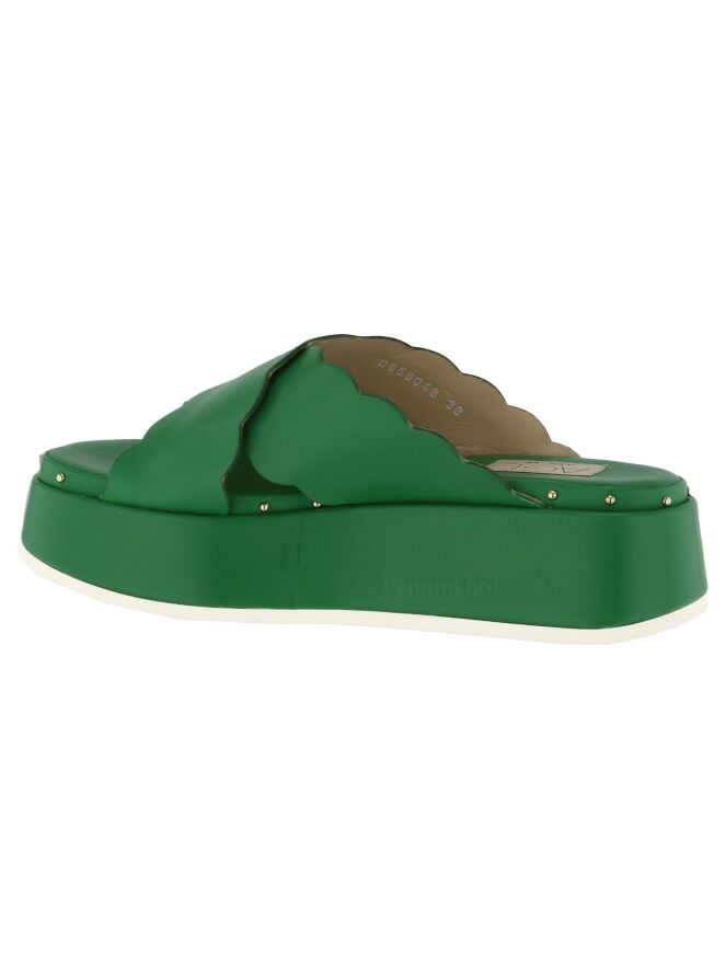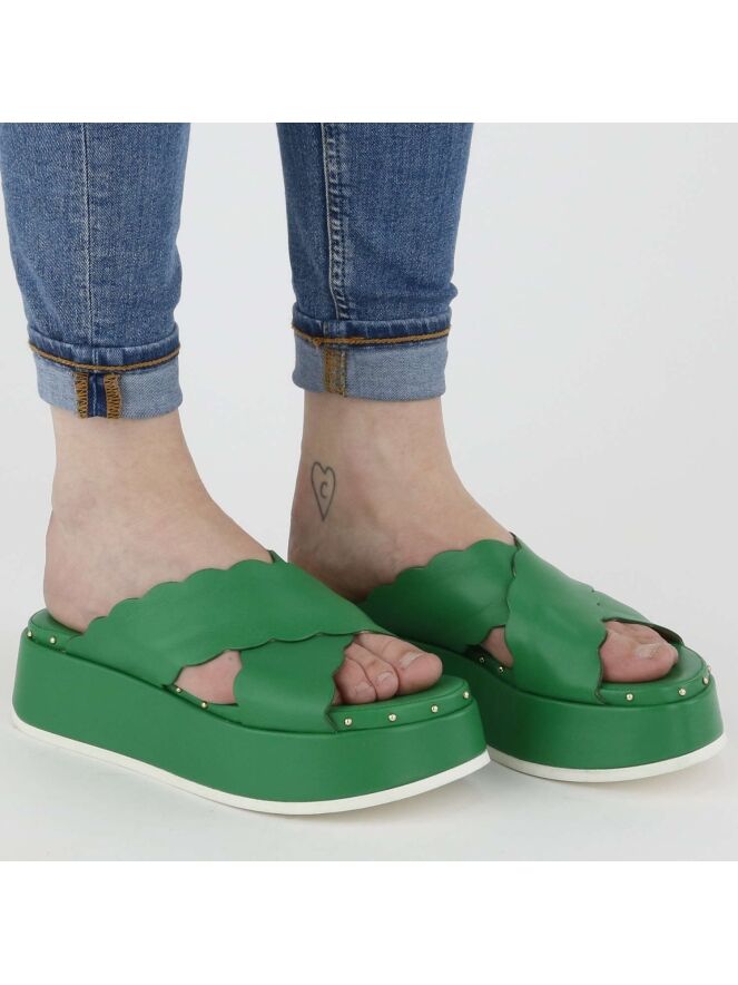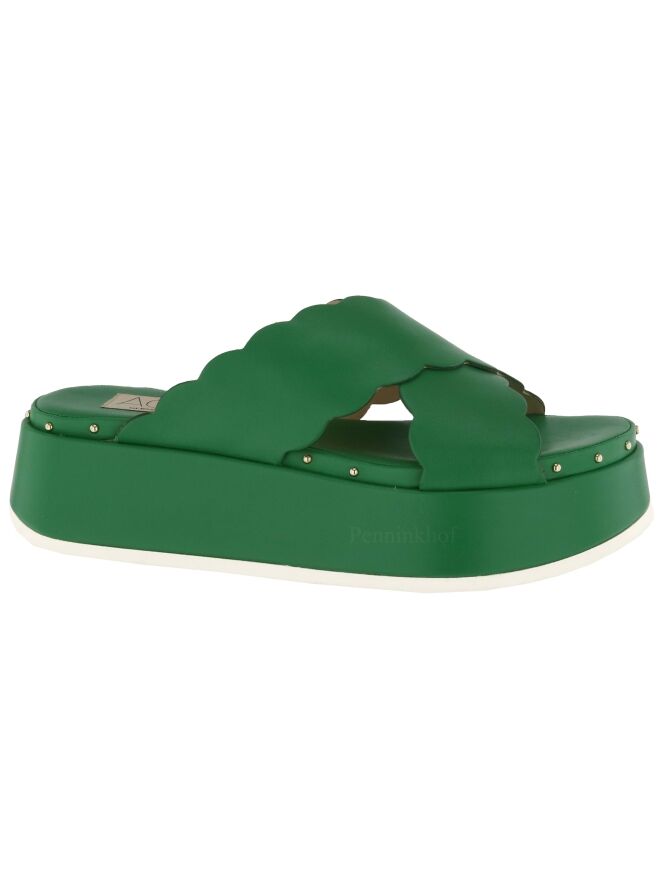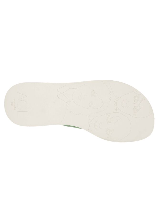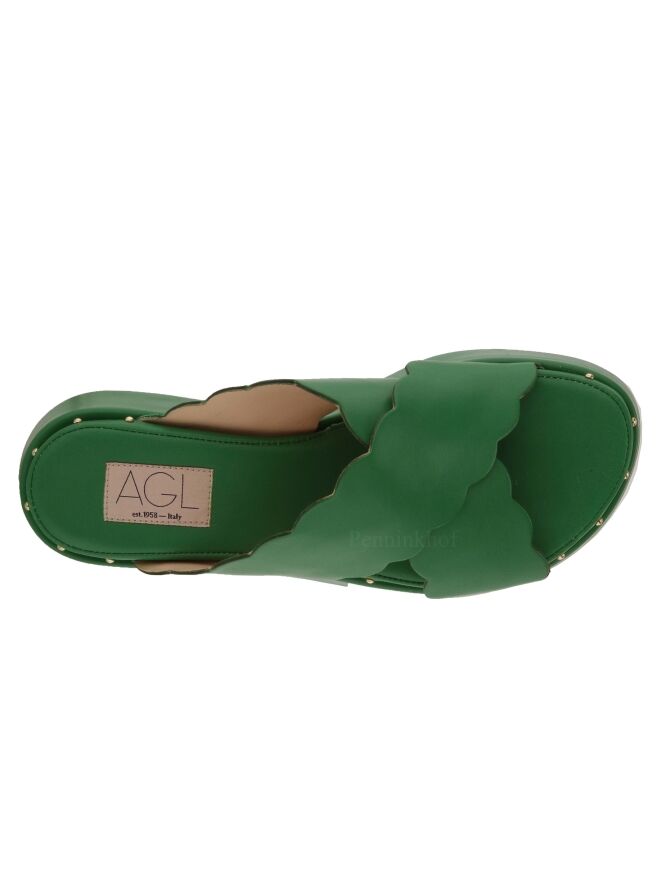 Eine grüne Sandalette der Damenschuhmarke AGL. Die Sandale hat gekreuzte Lederriemen, die an den Rändern ein Schuppenmuster haben. Am Rand des Fußbetts befinden sich kleine runde messingfarbige Nieten.