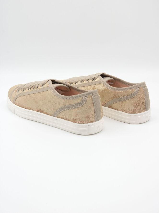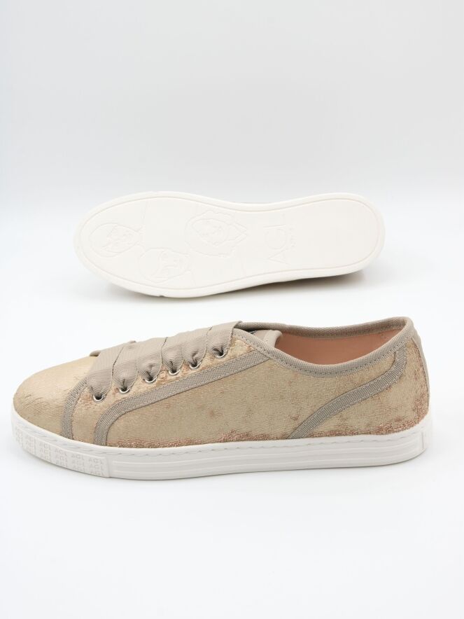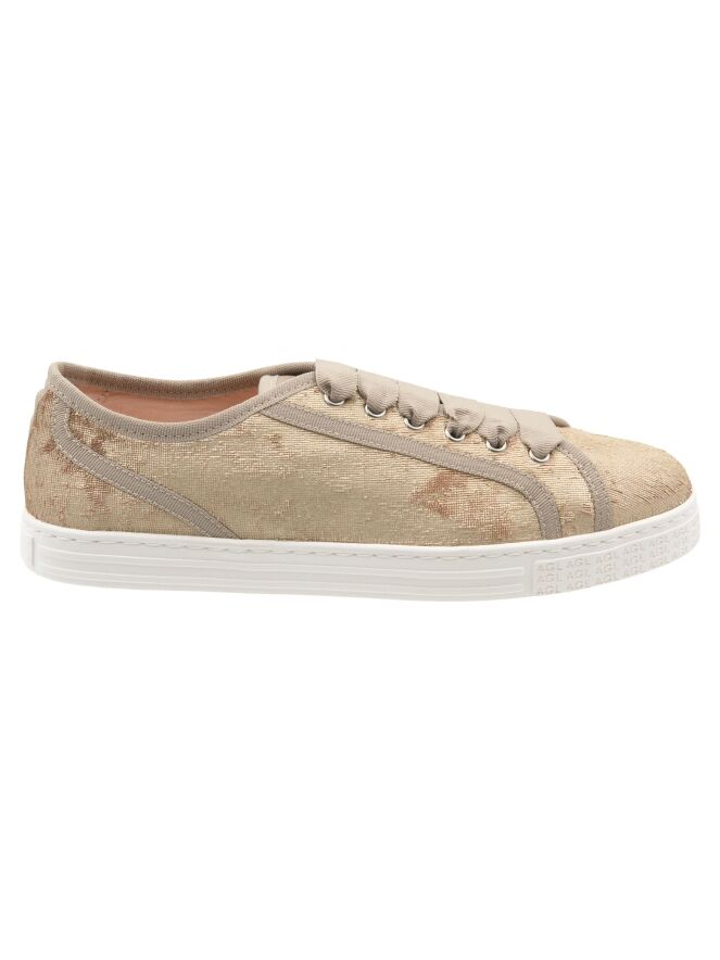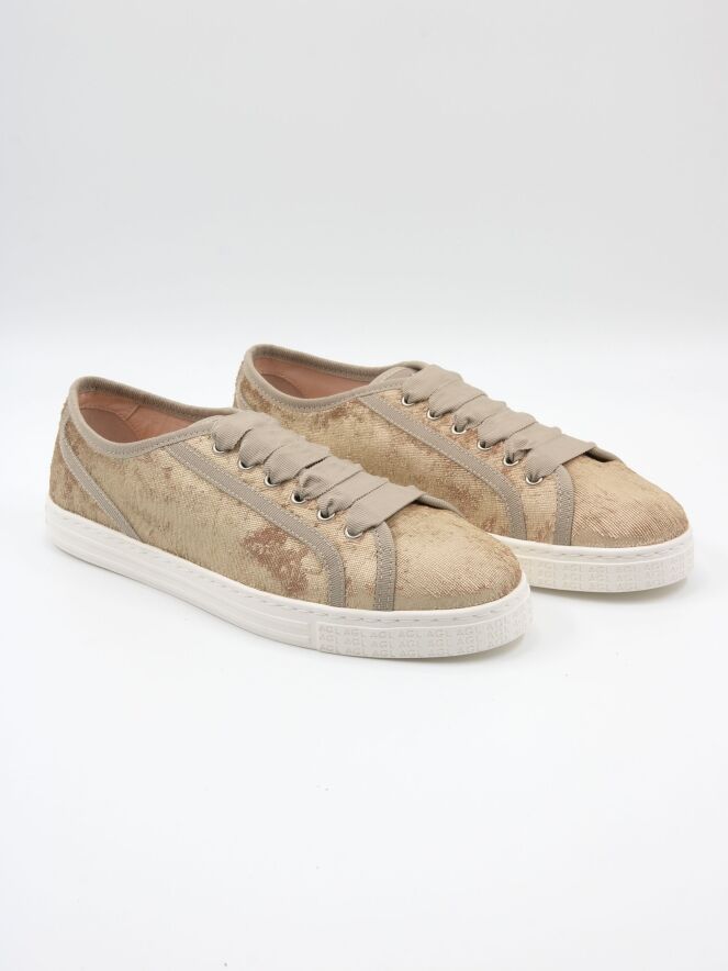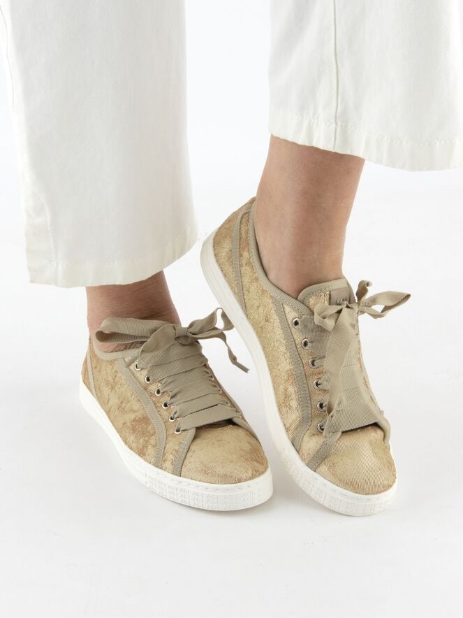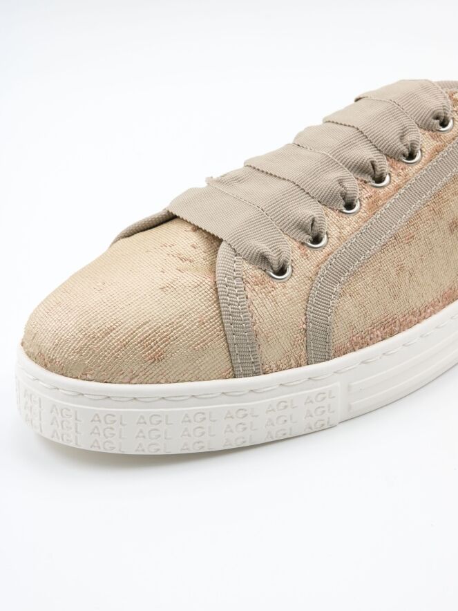Ein niedriger Sneaker von AGL aus Samtstoff in Gold. Der Sneaker ist mit beigen Paspeln versehen und hat eine cremeweiße Sohle. Das Innere ist mit Leder gefüttert.