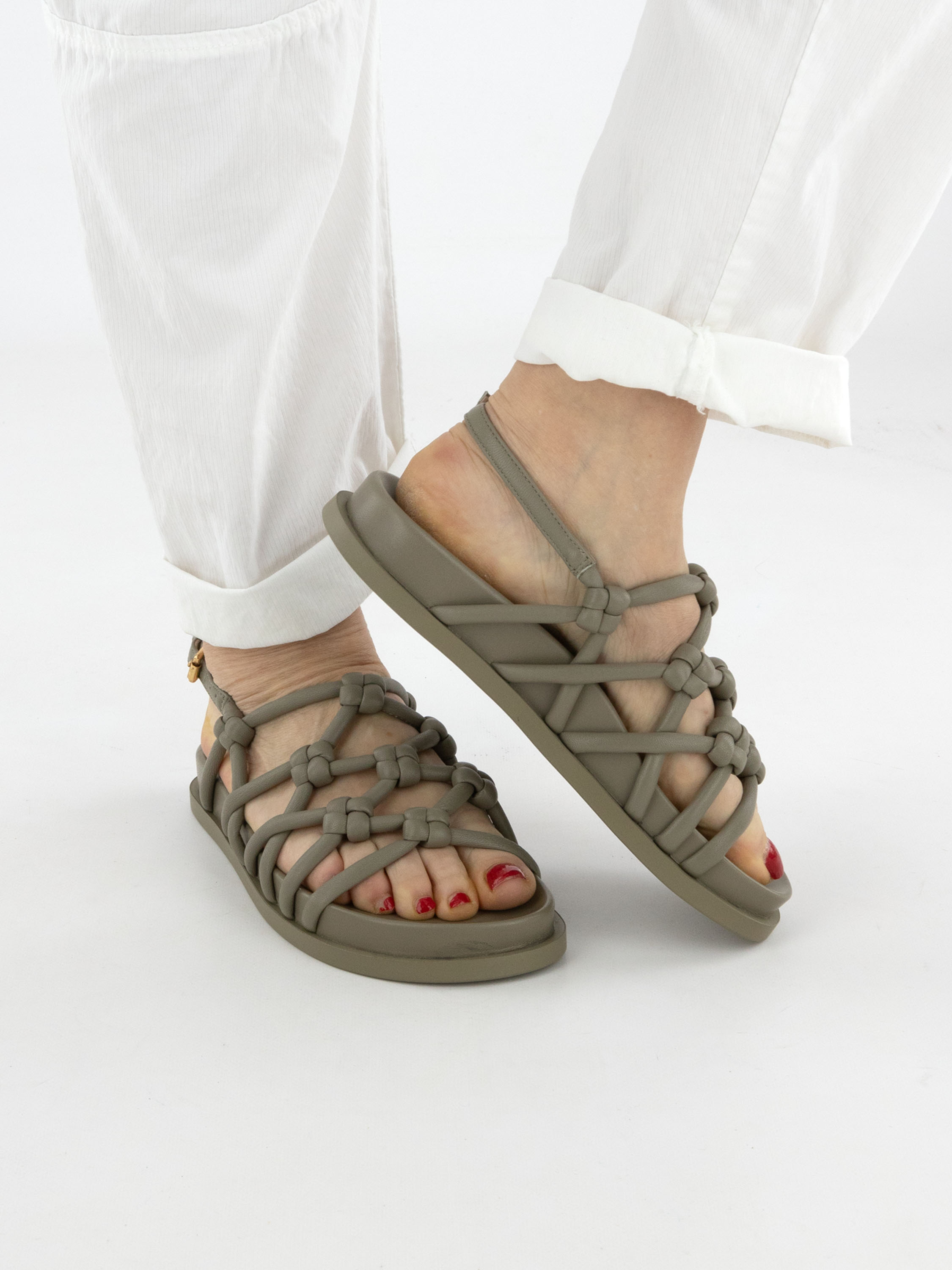 Sandale von AGL aus kreuzweise geflochtenem Leder in einem edlen Olivgrün. Das verstellbare Fersenriemchen sorgt für eine bequeme und optimale Passform.