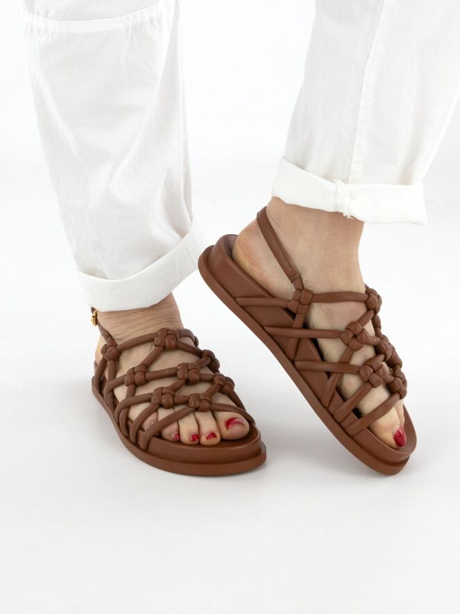 Eine Sandale von AGL aus kreuzweise geflochtenem Leder in einem eleganten Cognacton. Das verstellbare Fersenriemchen sorgt für eine komfortable und perfekte Passform.