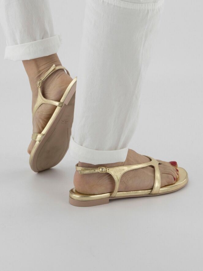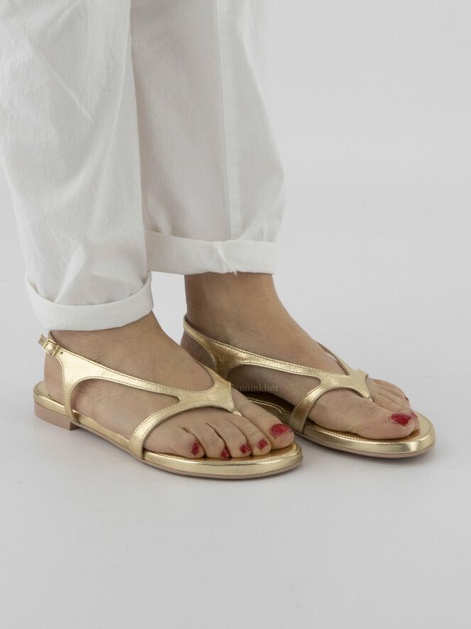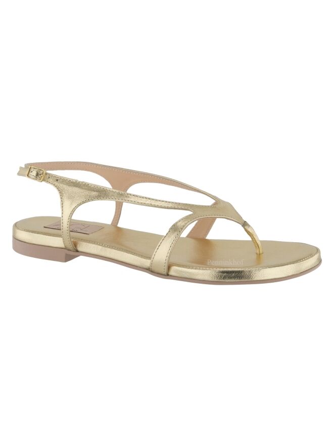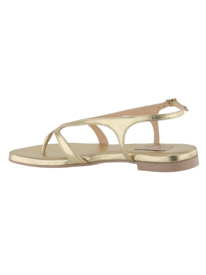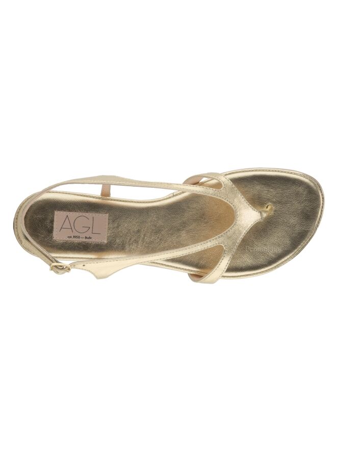 Flip-Flops der Designerschuhmarke AGL in Platin. Von der Befestigung an der Zehe verläuft eine Paspel zu den Seiten über den Spann um die Ferse herum. Diese Paspel ist verstellbar.
