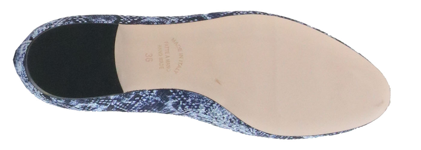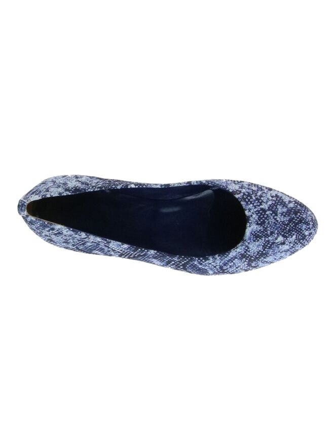 Ballerina der Designerschuhmarke Alba Teci mit Print in verschiedenen Blautönen. Der vorn abgerundete Ballerina ist mit einem kleinen Holzabsatz versehen. Der Ballerina hat ein Innenfutter aus Leder.