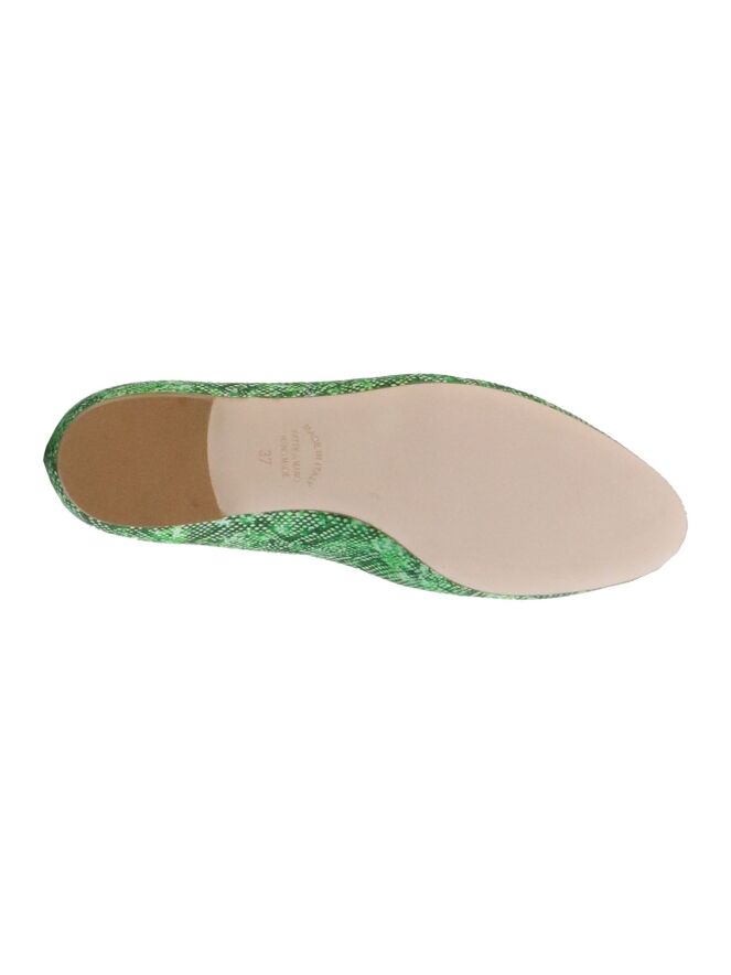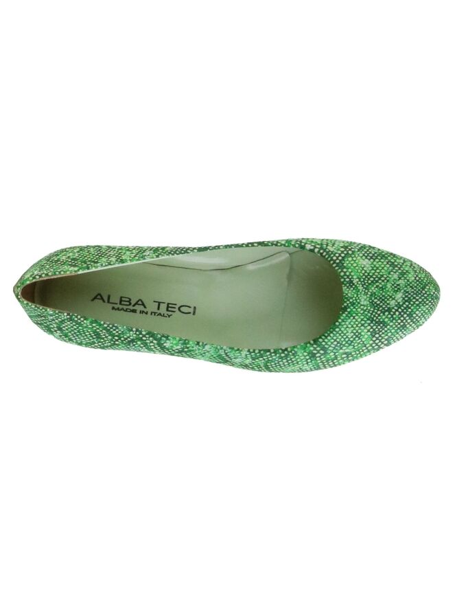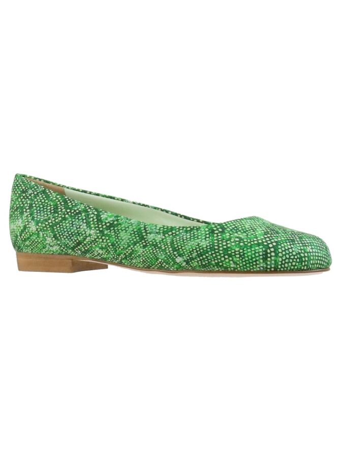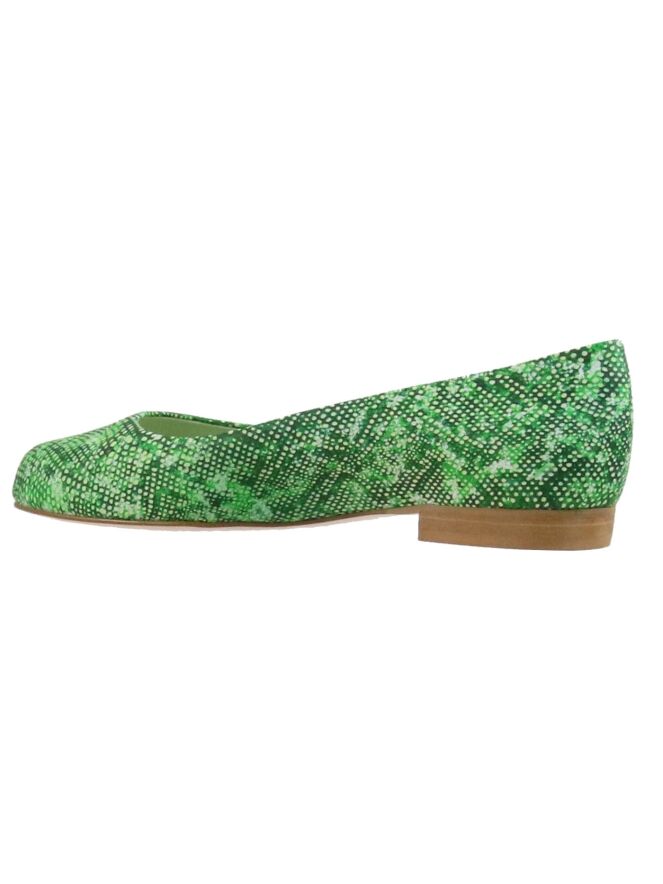 Ballerina der Designerschuhmarke Alba Teci mit Print in verschiedenen Grüntönen. Der vorn abgerundete Ballerina ist mit einem kleinen Holzabsatz versehen. Der Ballerina hat ein Innenfutter aus Leder.