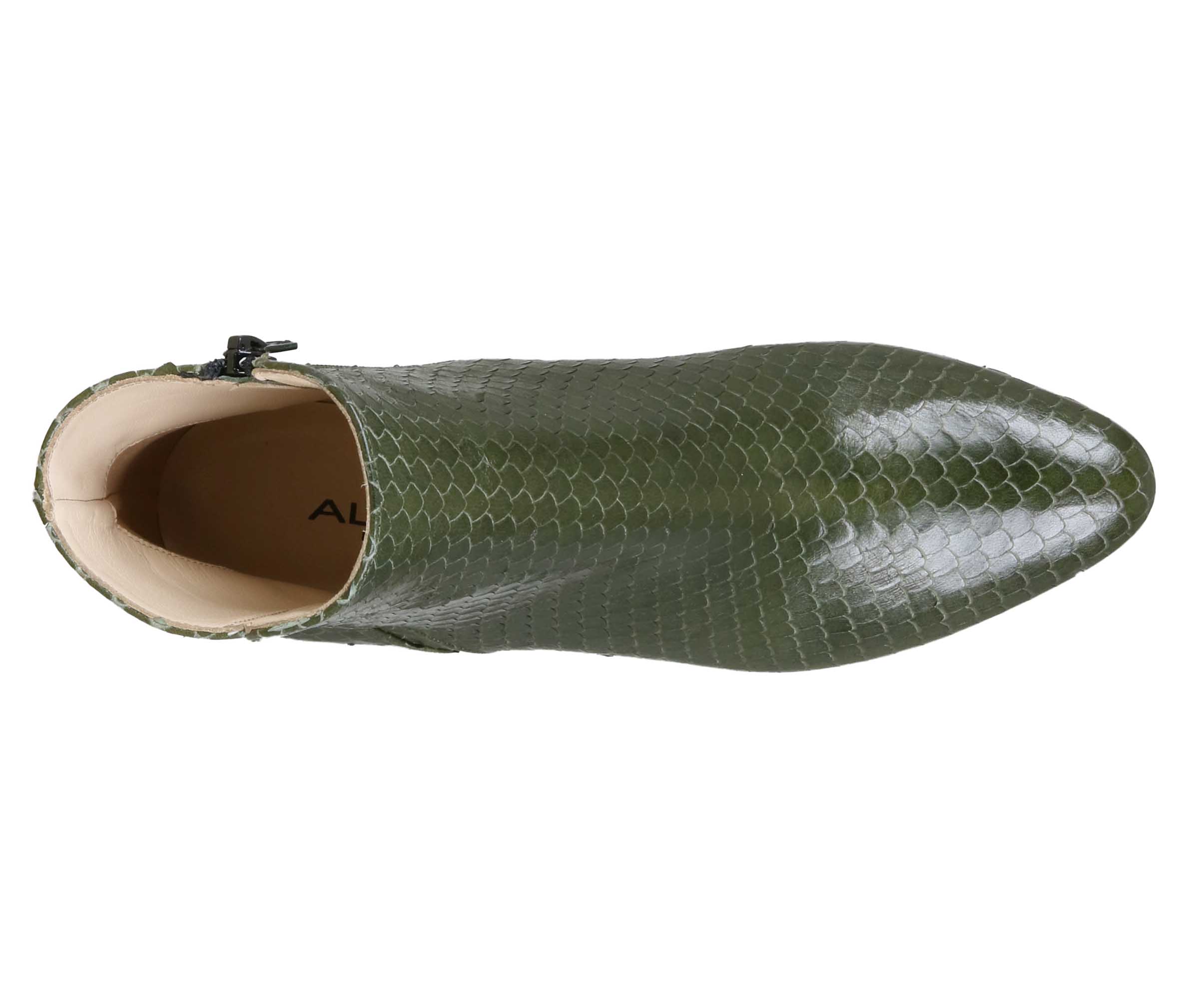 Khakifarbene Stiefelette der Designerschuhmarke Alba Teci mit Reptilmuster. Der elegante Blockabsatz ist mit demselben Material wie die Stiefelette versehen. An der Innenseite ist ein Reißverschluss. Die Stiefelette hat ein Innenfutter aus Leder.