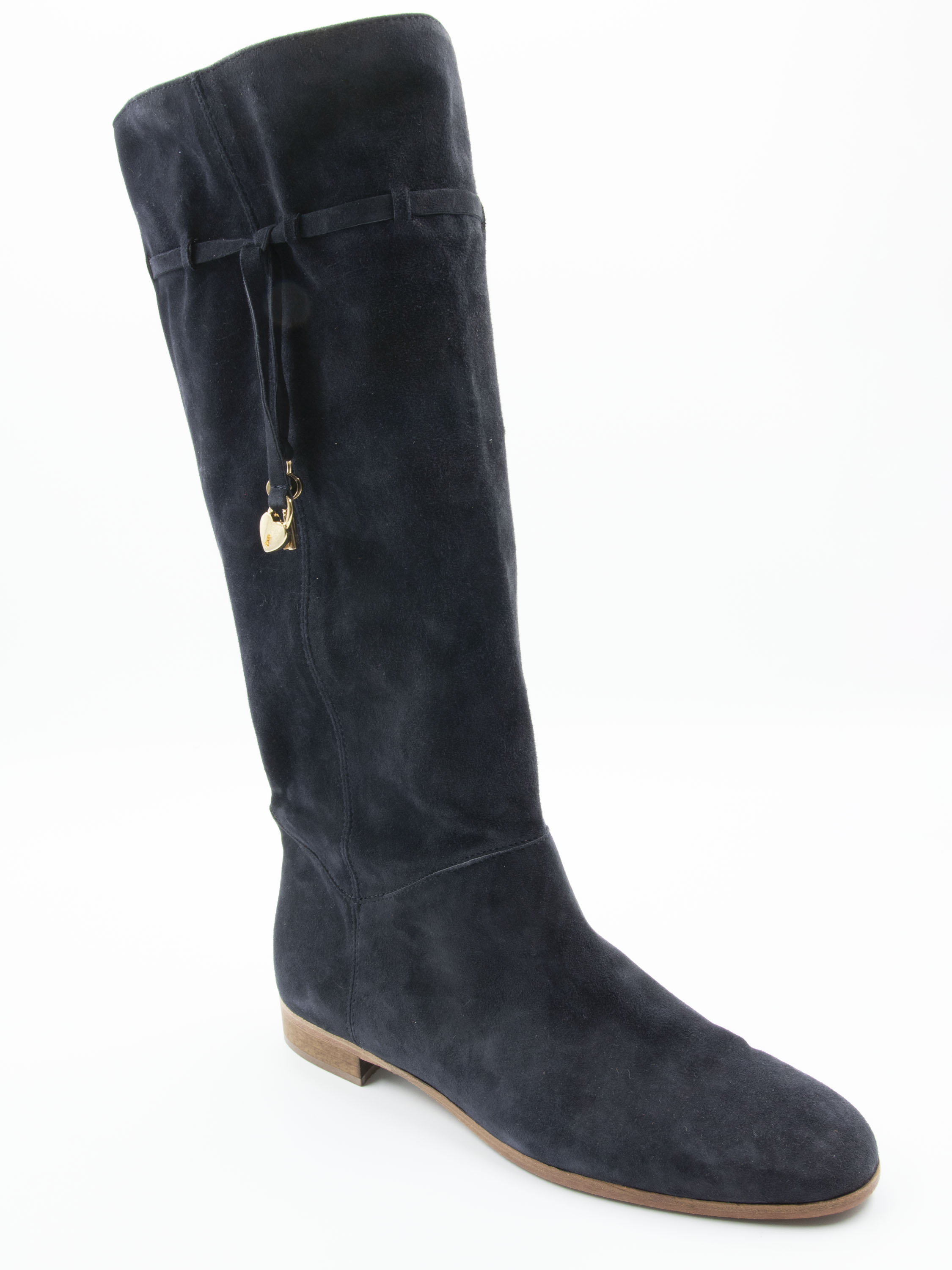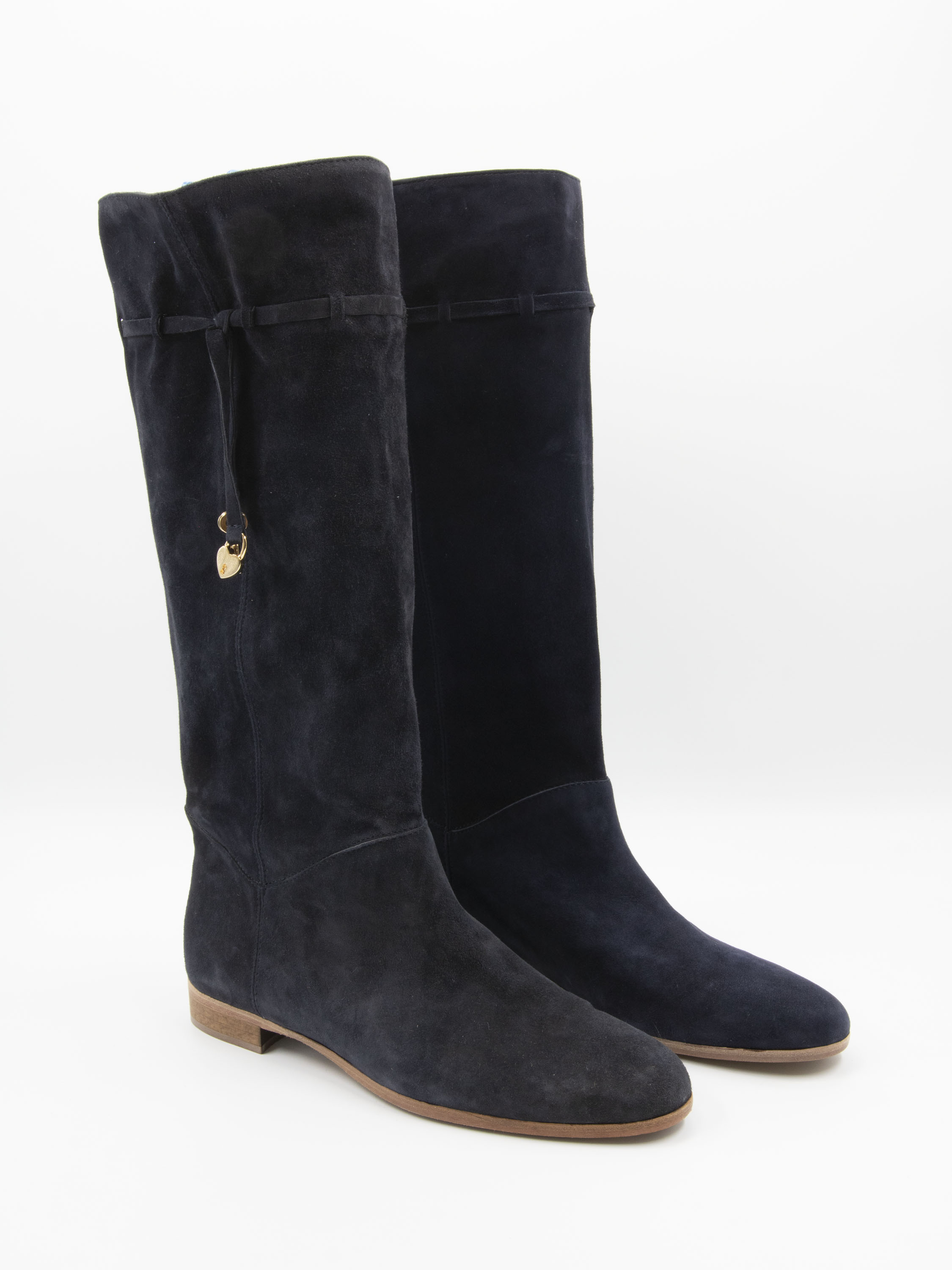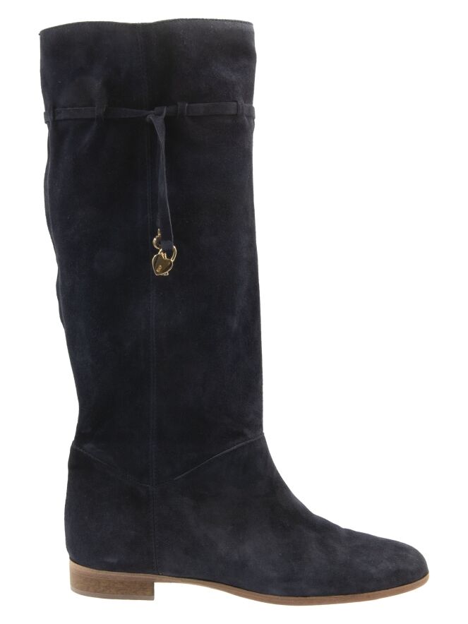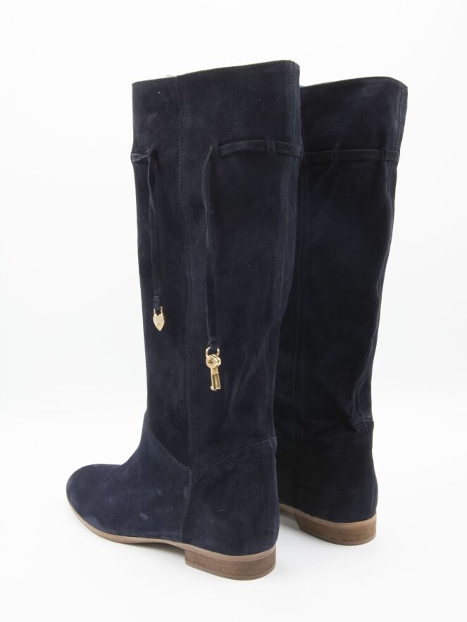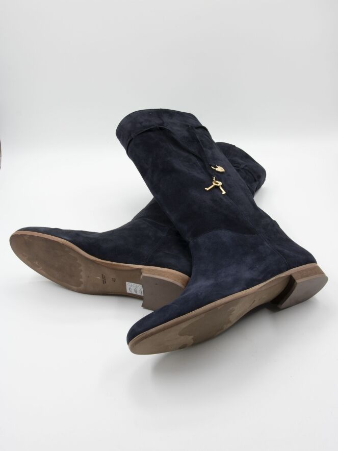 Ein Stiefel der Marke Angelo Bervicato in Marineblau. Der Schaft ist weich und fällt leicht nach unten. Am oberen Rand des Schafts befindet sich eine schmale Biese mit zwei goldfarbenen Schlüsselanhängern und einem dekorativen Schloss. Die Schafthöhe beträgt 38 cm, der Umfang 40 cm.