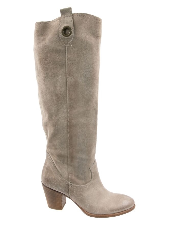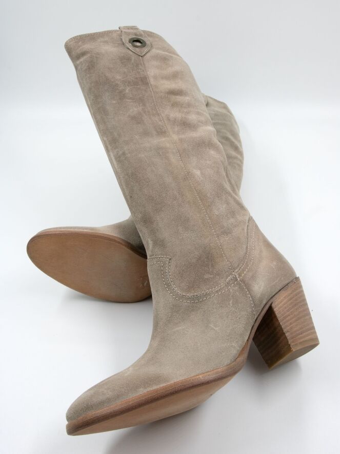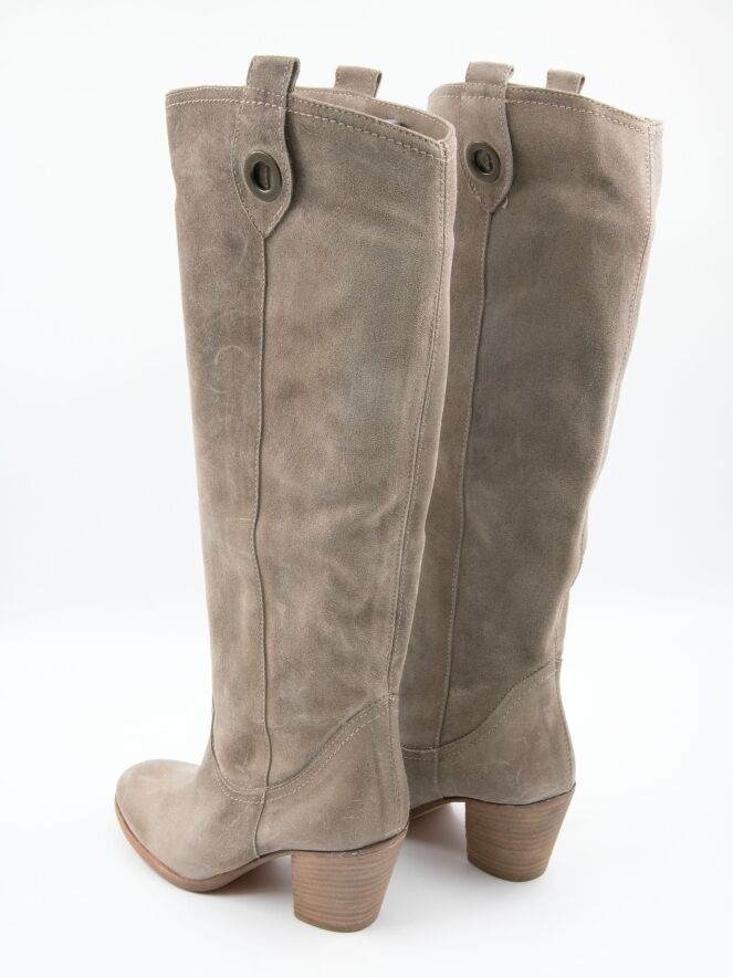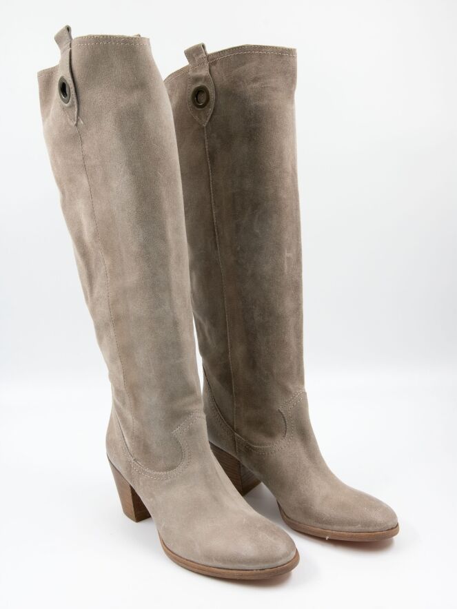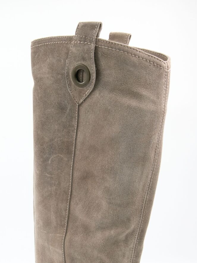 Ein Stiefel von Angelo Bervicato in Sandfarbe. Der Schaft ist weich und fällt leicht nach unten. Am oberen Rand des Schafts befinden sich zwei Schnallen mit einem messingfarbenen Ring. Der Schaft hat keinen Reißverschluss.