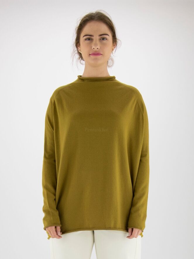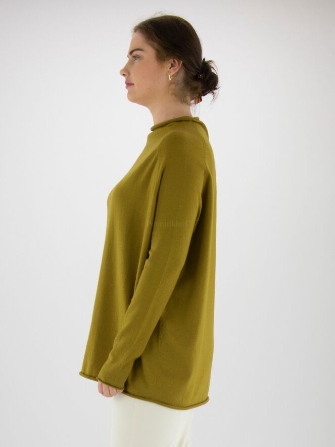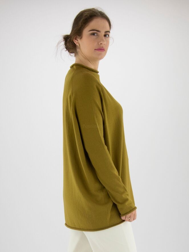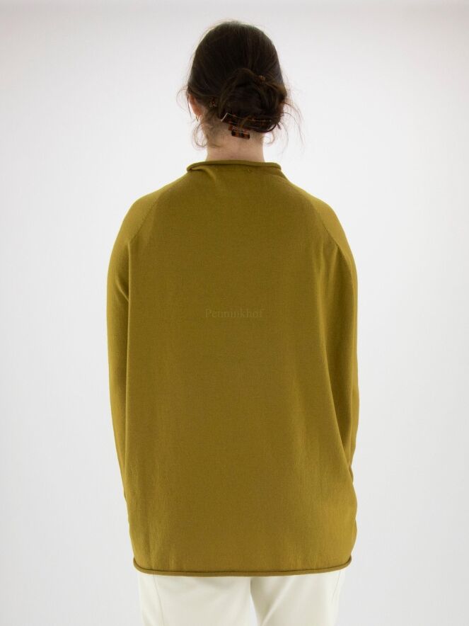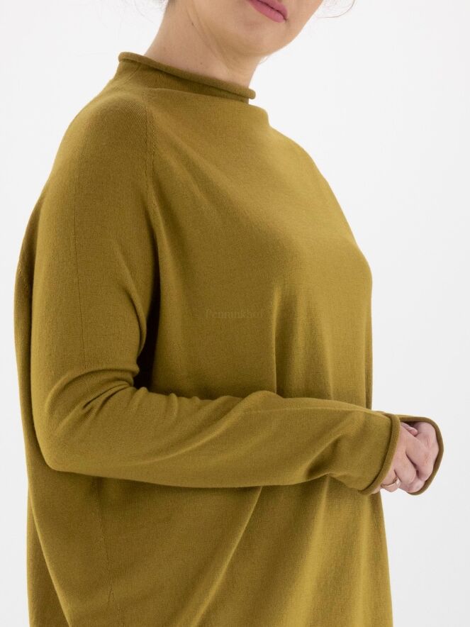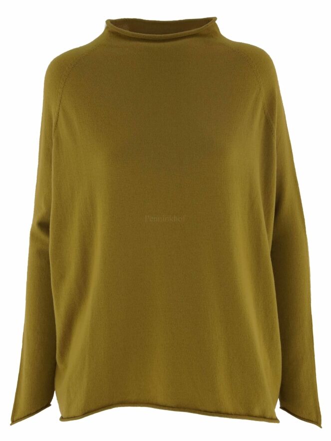 Ein luxuriöser, geräumiger Pullover von Annette Görtz in Ockergelb. Der Rand des Rundhalsausschnitts, das Ende der Ärmel und der Saum sind gerüscht. Dieser Pullover kann mit der Hand gewaschen werden.