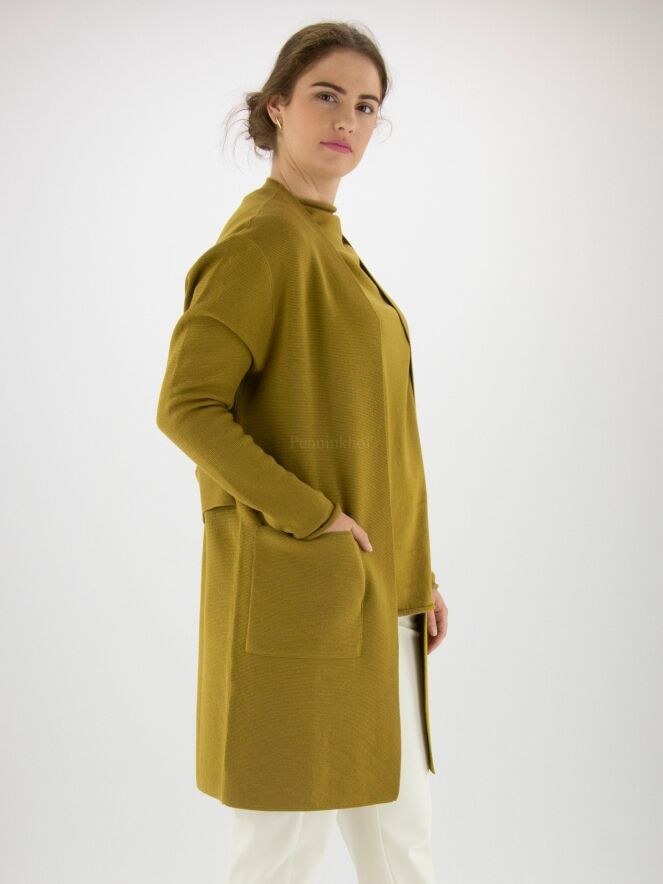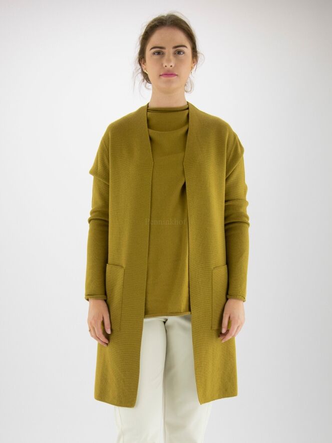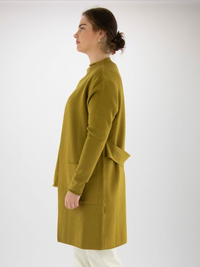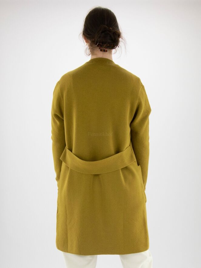 Eine luxuriöse Strickjacke von Annette Görtz in Ockergelb. An der Taille befindet sich ein Gürtel aus demselben Stoff wie die Strickjacke. Die Strickjacke hat keinen Verschluss und kann mit der Hand gewaschen werden.
