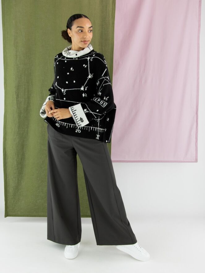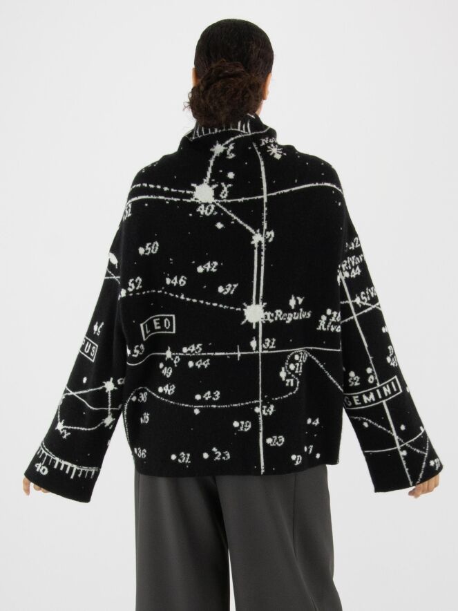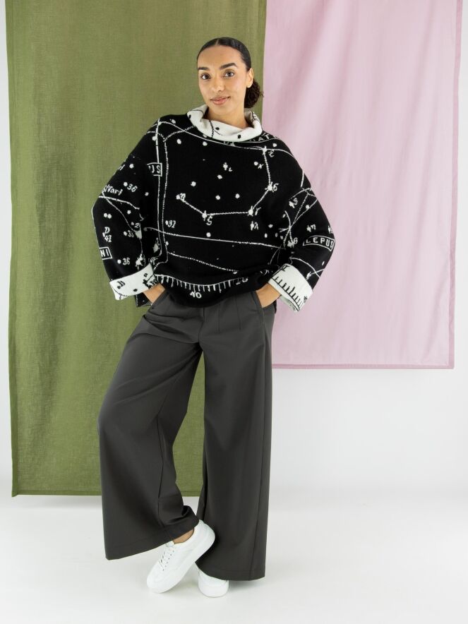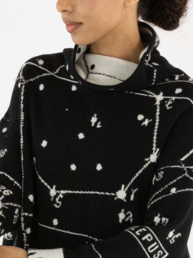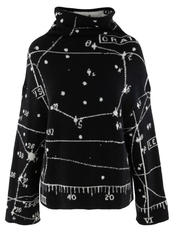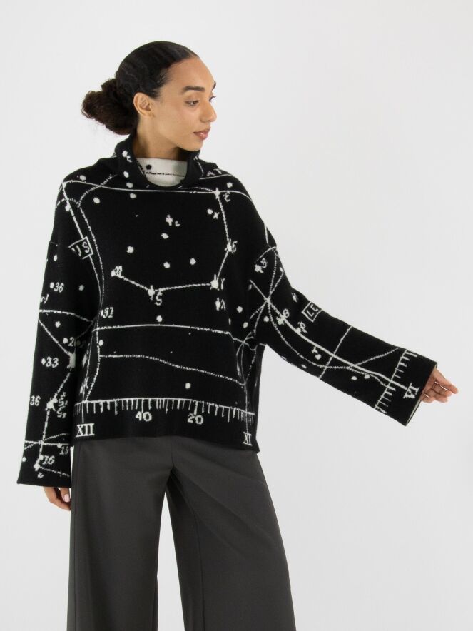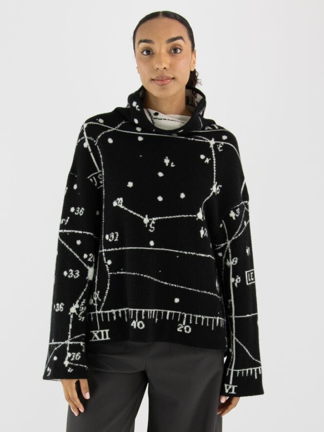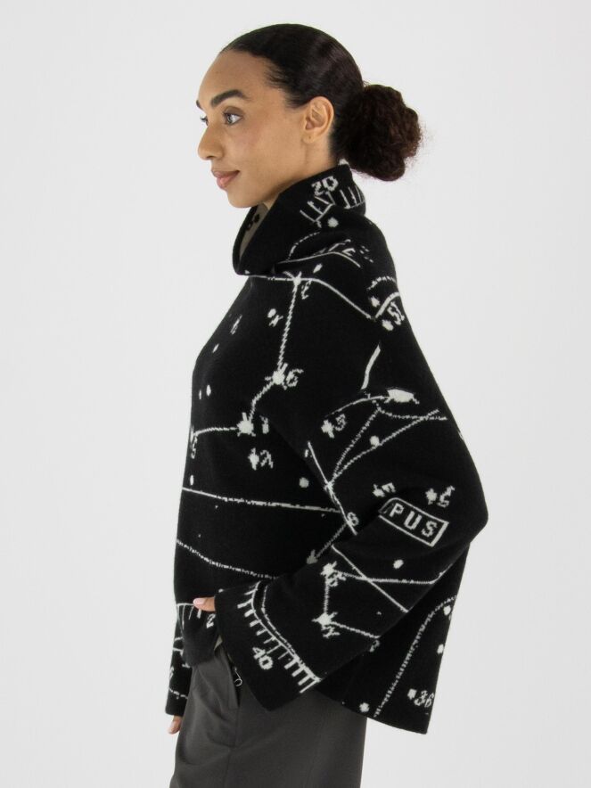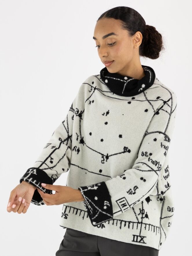 Ein luxuriöser, weiter, wendbarer Pullover von Annette Görtz mit einem grafischen Muster in Schwarz und Cremeweiß. Der Pullover hat einen weich fallenden Rollkragen. Die Wendeseite zeigt das Muster in Weiß mit Schwarz. Dieser Pullover sollte von Hand gewaschen werden.
