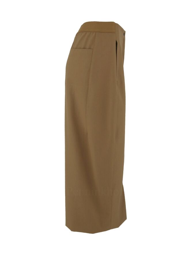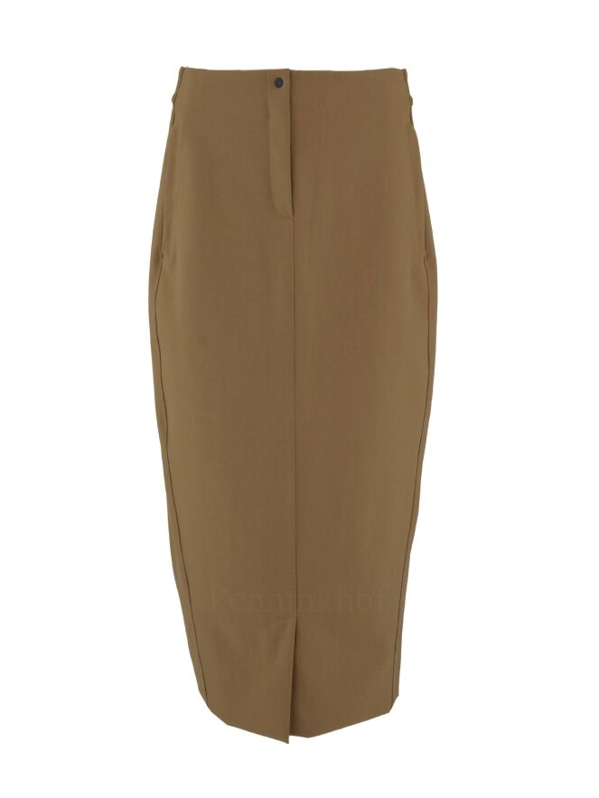 Ein Rock der Designermode von Annette Görtz in Camel. Von der Taille ausgehend befindet sich seitlich und hinten ein camelfarbenes Gummiband. Der Rock ist vorne und hinten mit einem kleinen Schlitz versehen. Dieser Rock kann bei 30 Grad gewaschen werden.