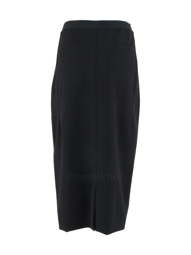 Ein hochwertiger schwarzer Rock der Designermode von Annette Görtz. Das Gewebe ist angenehm dehnbar. Die Eingriffstaschen sind mit einem verdeckten Reißverschluss versehen. In der Mitte der Vorder- und Rückseite befindet sich ein kleiner Schlitz am Saum. Dieser Rock kann bei 30 Grad in der Waschmaschine gewaschen werden.