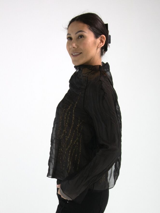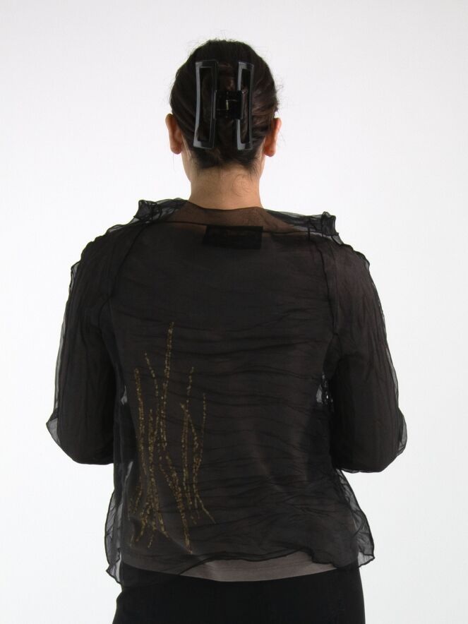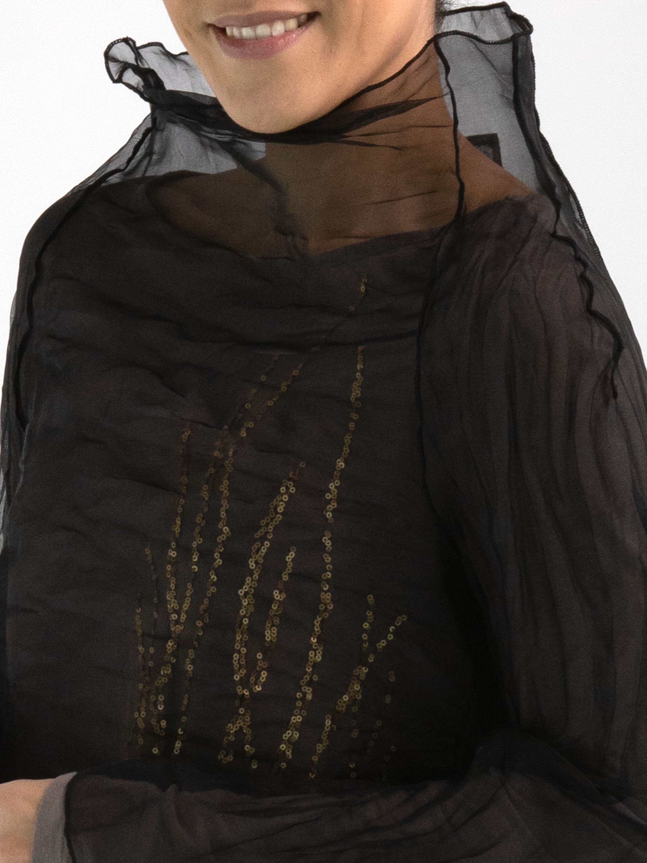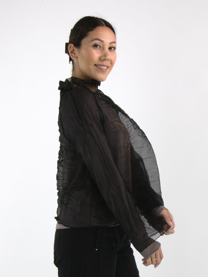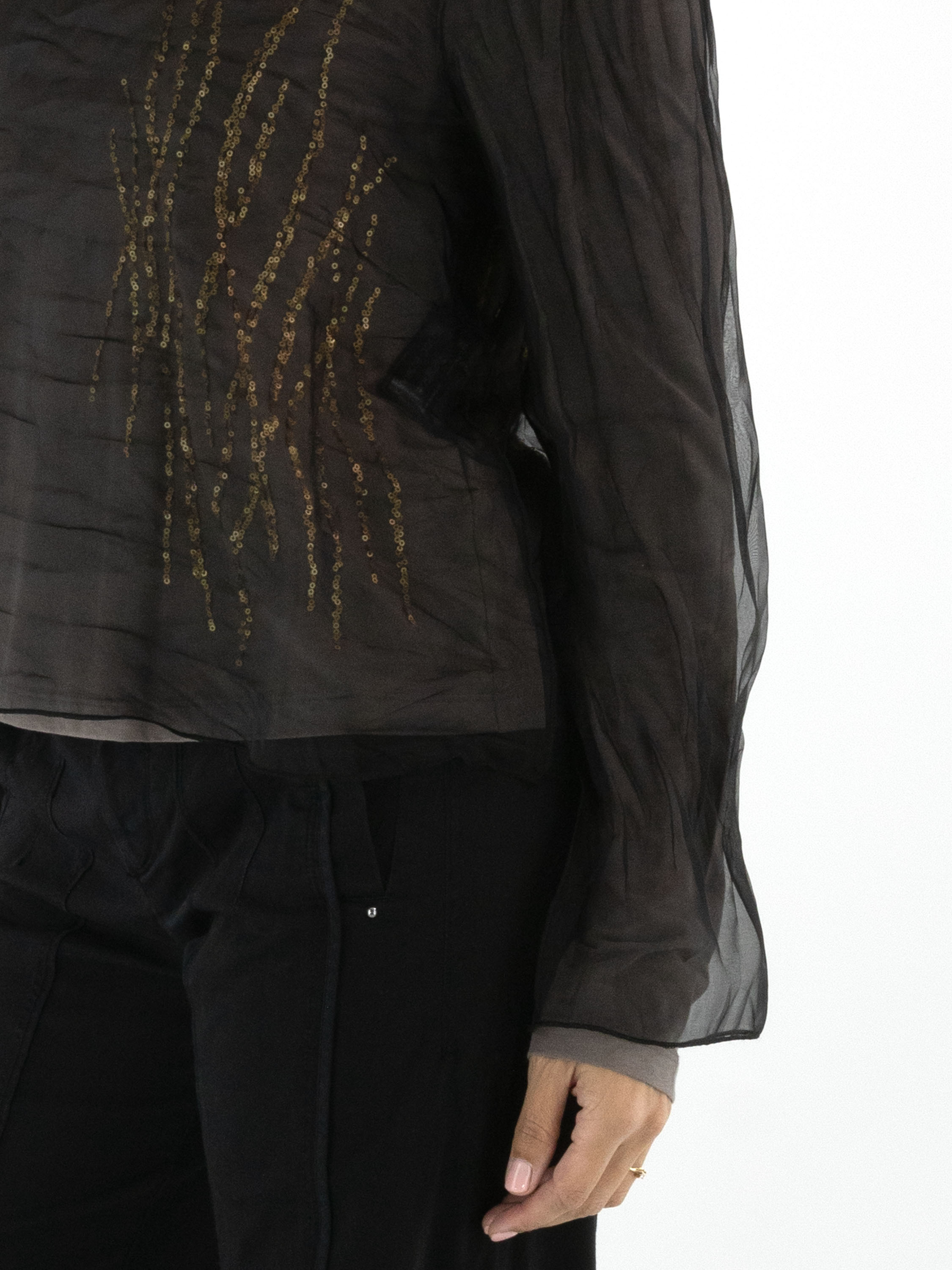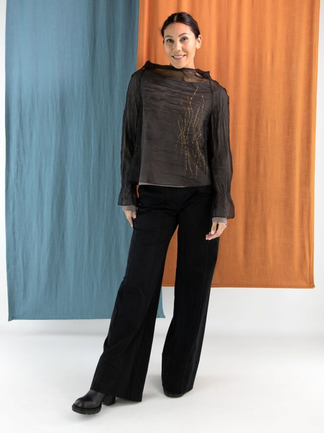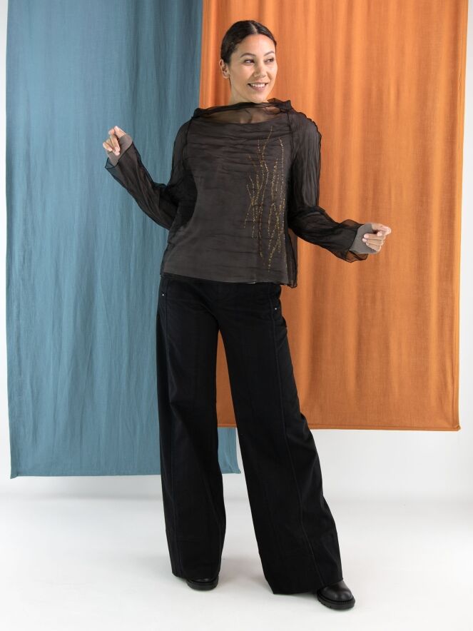 Ein Shirt von Annette Görtz in Schokoladenbraun, verziert mit bronzefarbenen und kupferfarbenen Pailletten in wellenförmigen Bändern auf der Vorderseite. Über dem Basisshirt liegt ein zweites Voile-Shirt in Schwarz, das leicht geknittert ist. Das braune Shirt hat einen breiten Rundhalsausschnitt, während das Voile-Shirt mit einem breiten, hohen Halsausschnitt gearbeitet ist. Dieses Ensemble kann von Hand gewaschen werden.