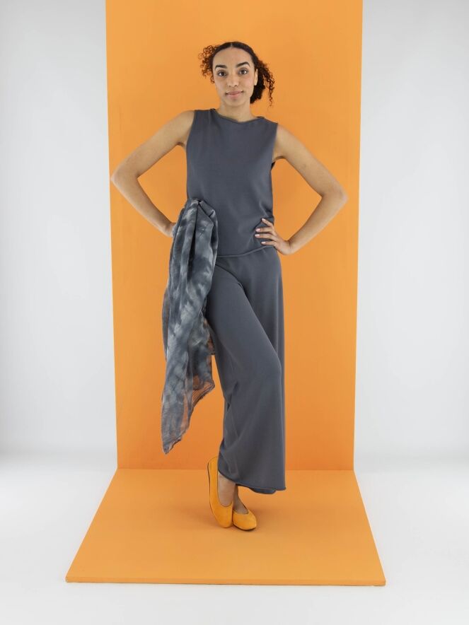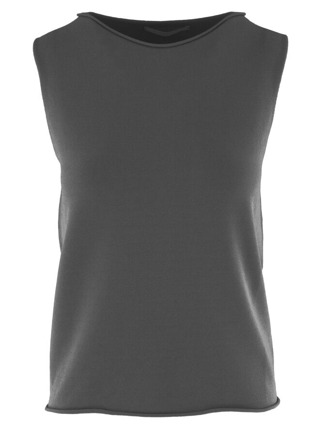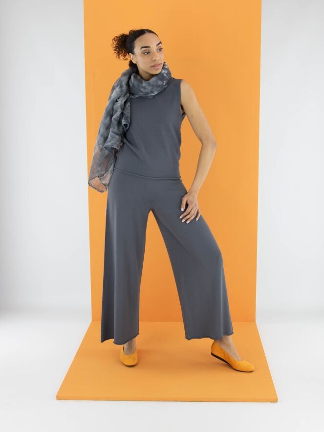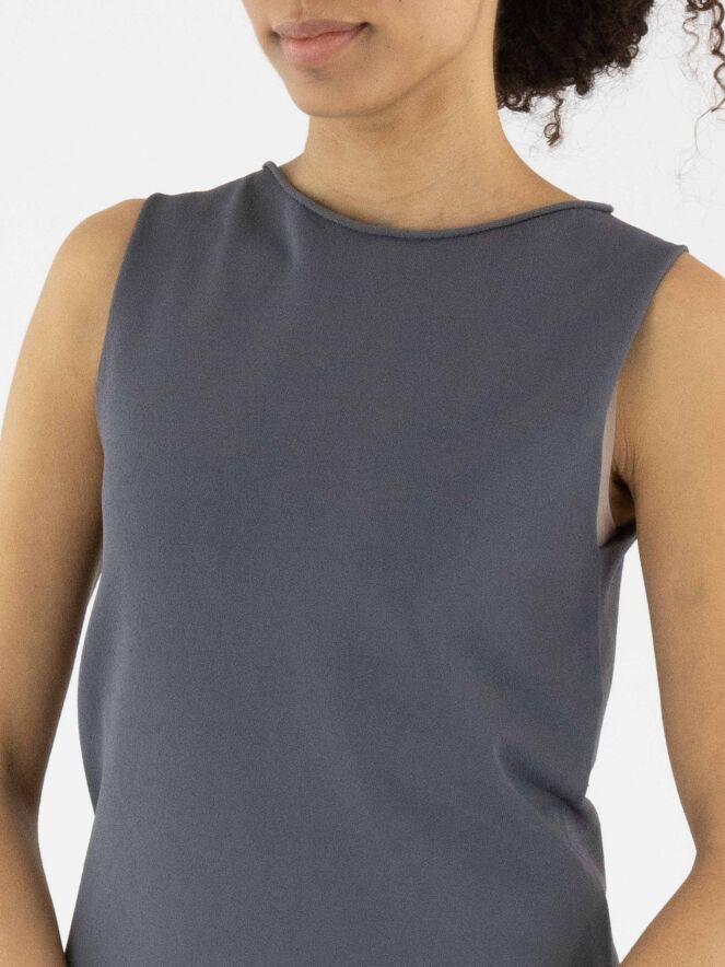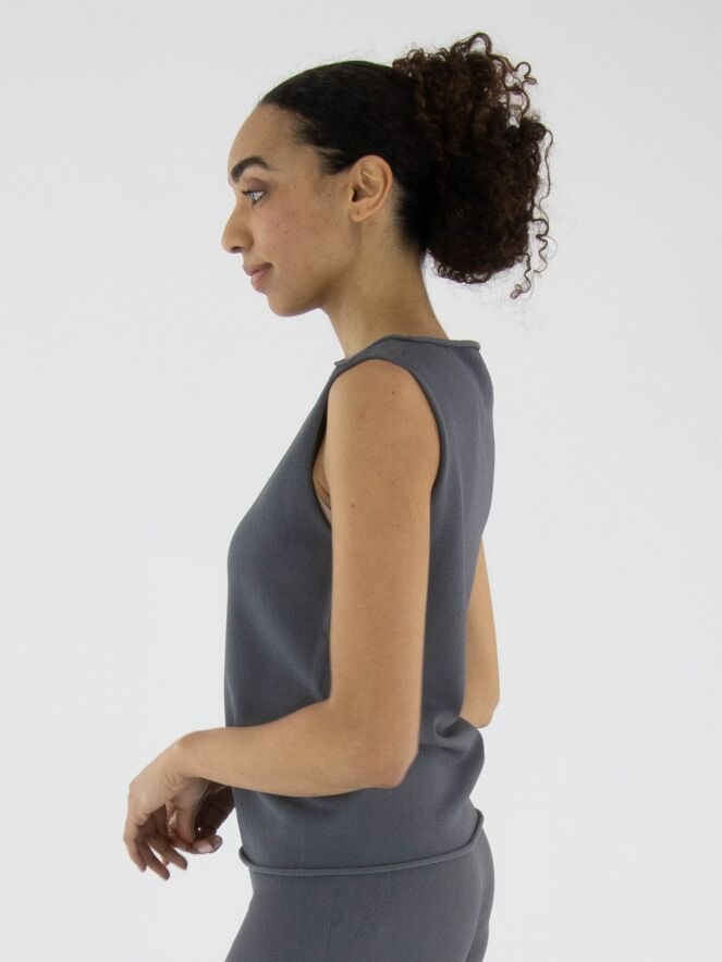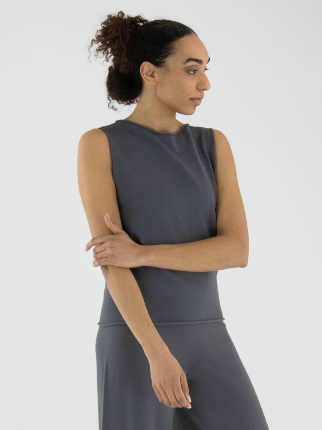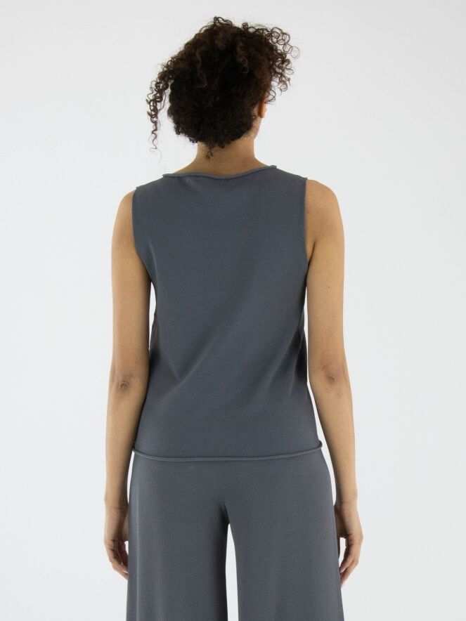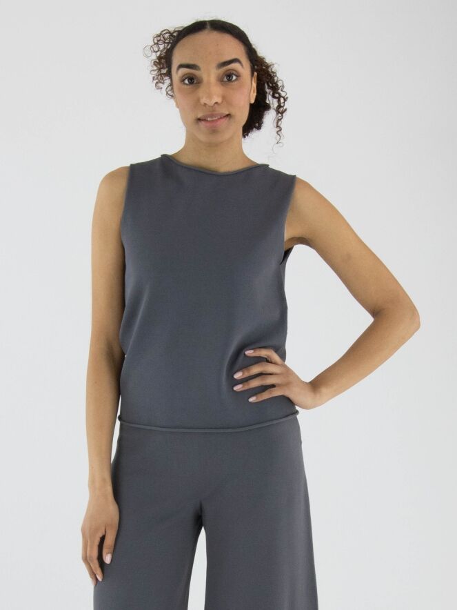 Ein Top von Annette Görtz in Grau. Der Rundhalsausschnitt und der untere Saum sind fein gerafft. Dieses Top kann bei 30 Grad gewaschen werden.