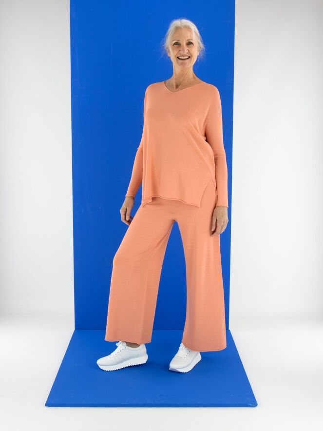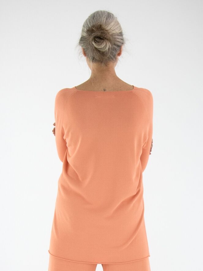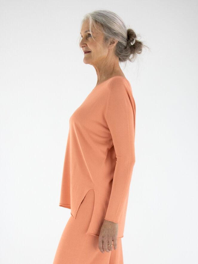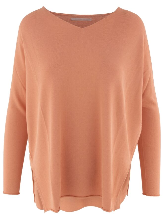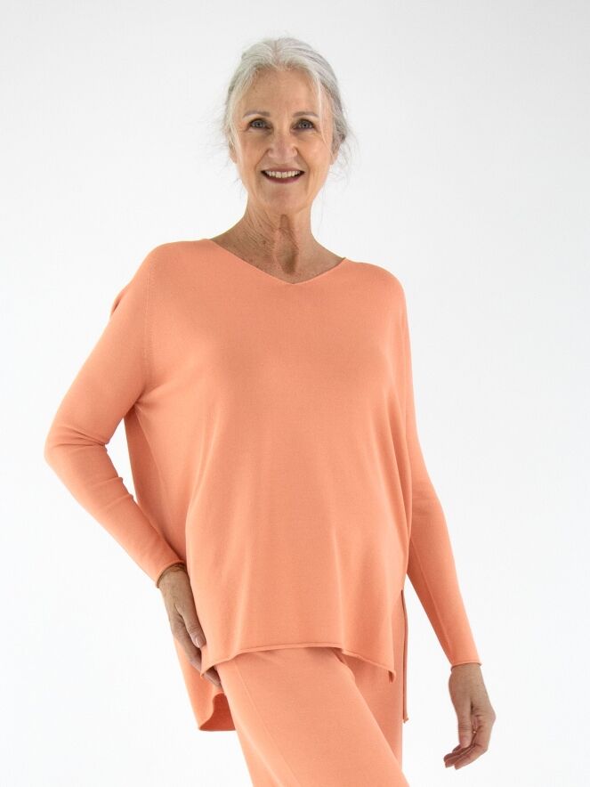 Ein luxuriöser, fein gestrickter Pullover von Annette Görtz in Pastellorange. Der Pullover hat einen V-Ausschnitt und tiefe Seitenschlitze am Saum. Dieser Pullover sollte von Hand gewaschen werden.