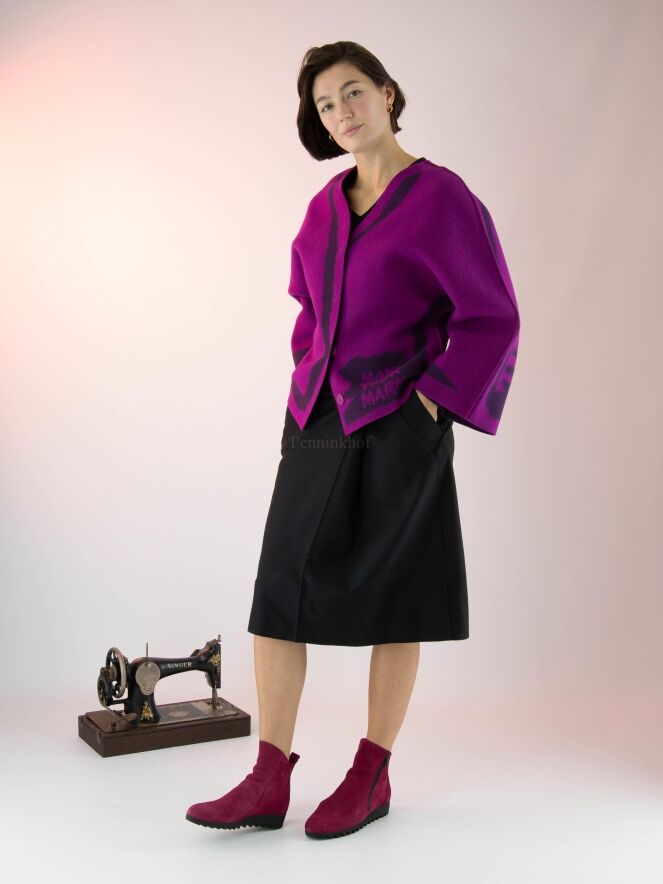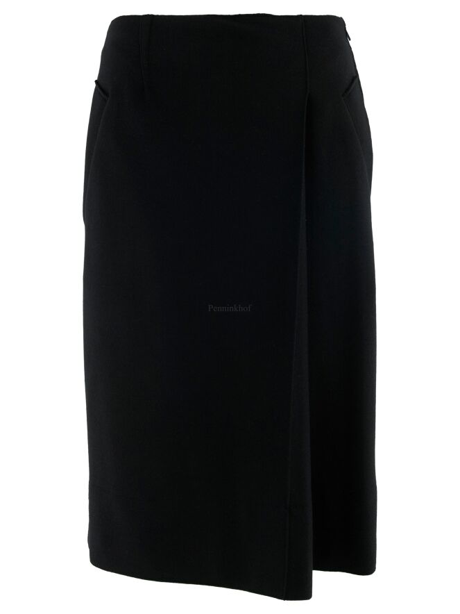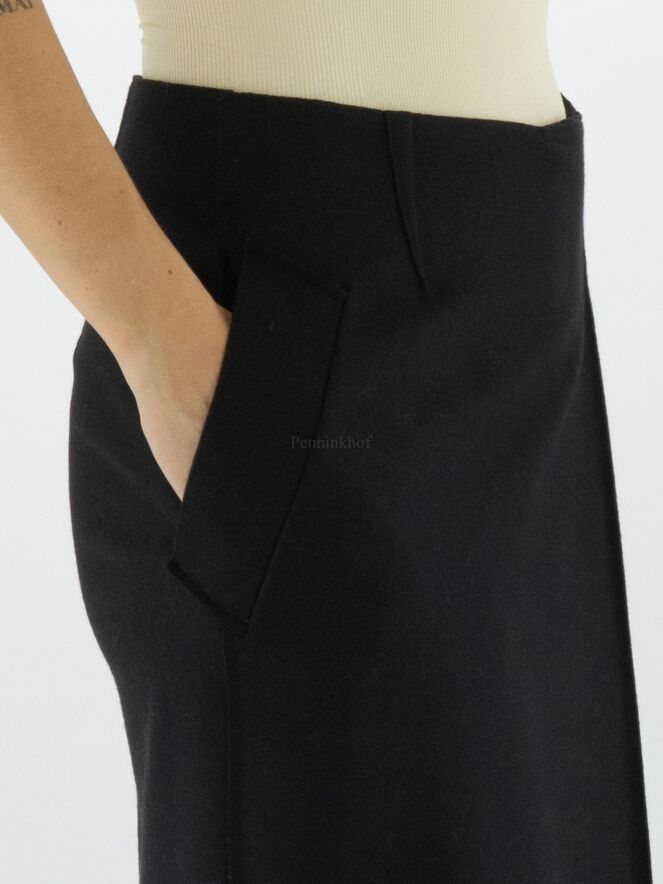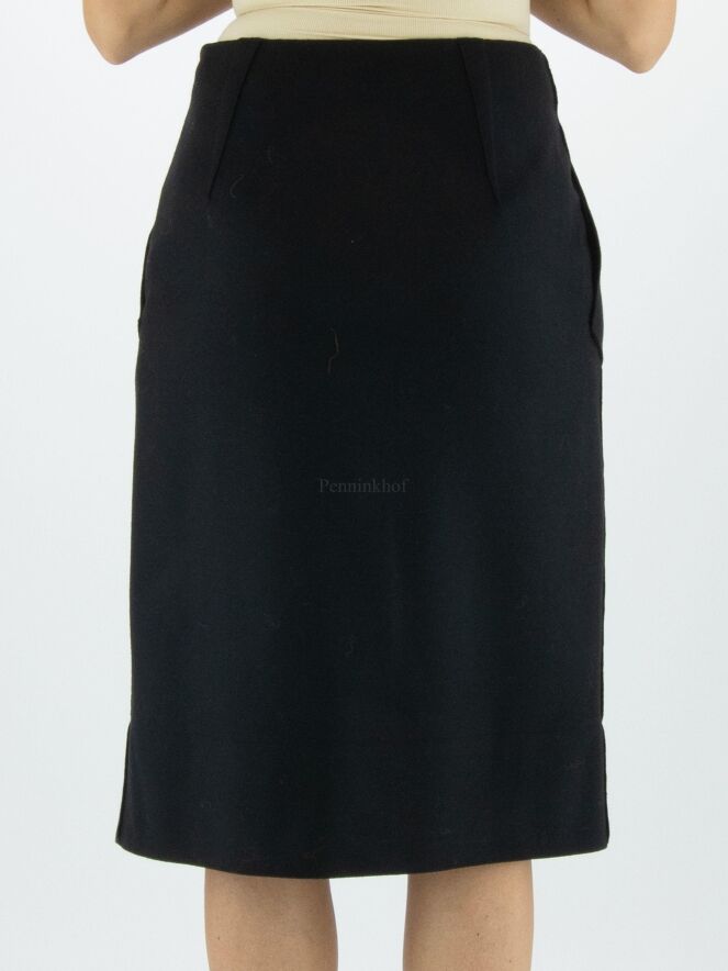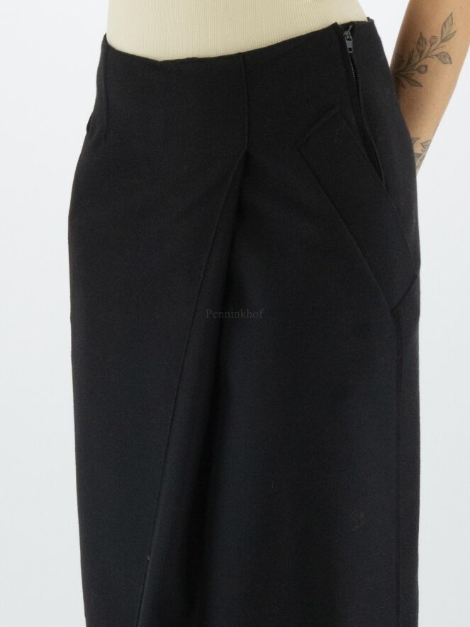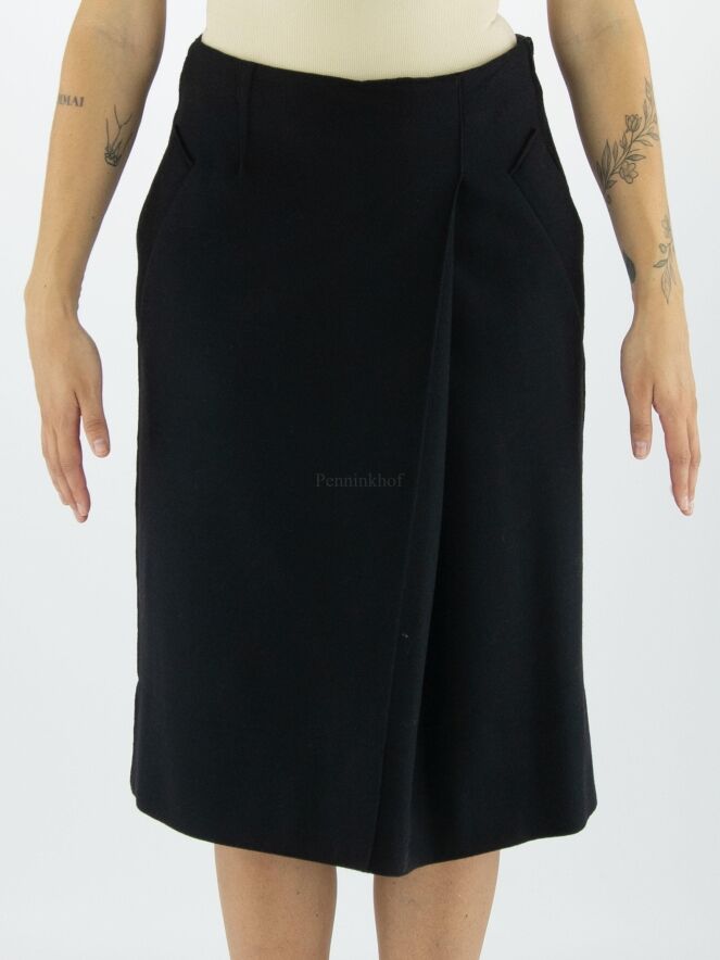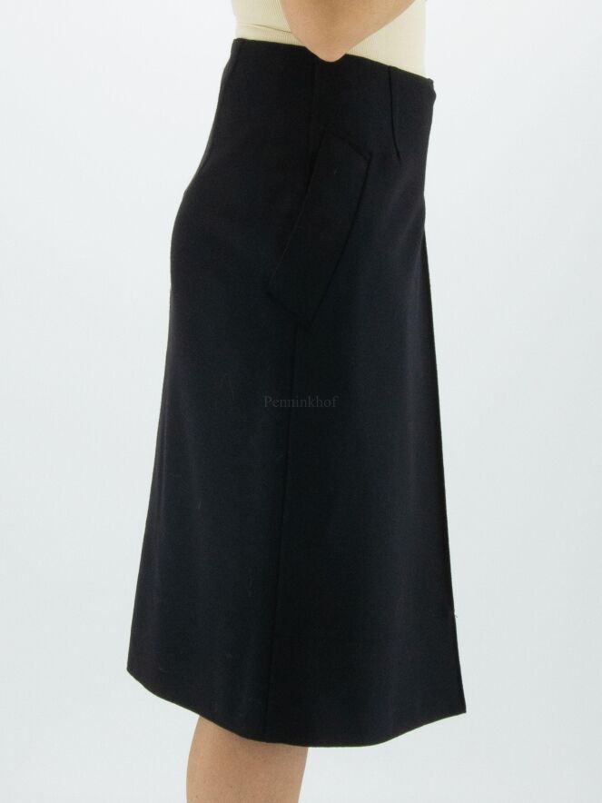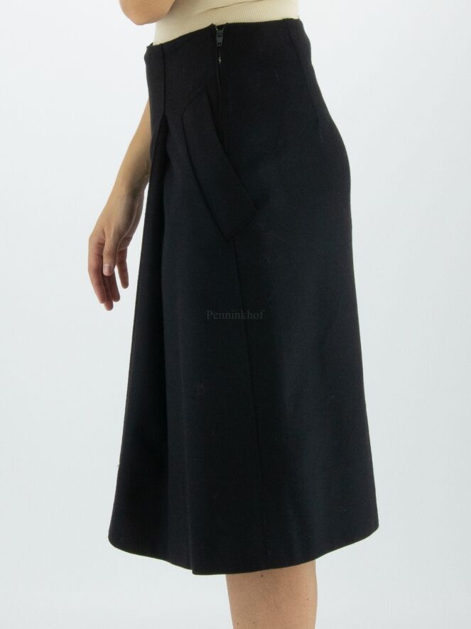 Ein Rock von Annette Görtz in einer gekochten Wollqualität in der Farbe schwarz. Auf der Vorderseite befindet sich links der Mitte eine Kellerfalte. Der Rock hat Eingrifftaschen und sollte nicht gewaschen werden.