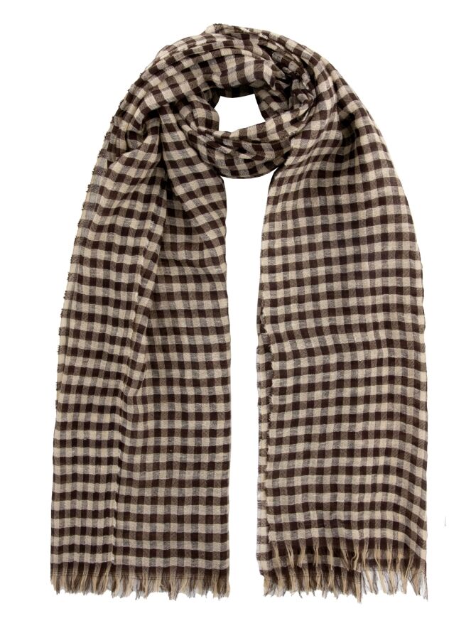 Ein luxuriöser, leicht transparenter Schal von Annette Görtz mit einem Karomuster in Mokabraun und Beige. Die Kanten des Schals sind fein ausgefranst. Dieser Schal kann von Hand gewaschen werden.