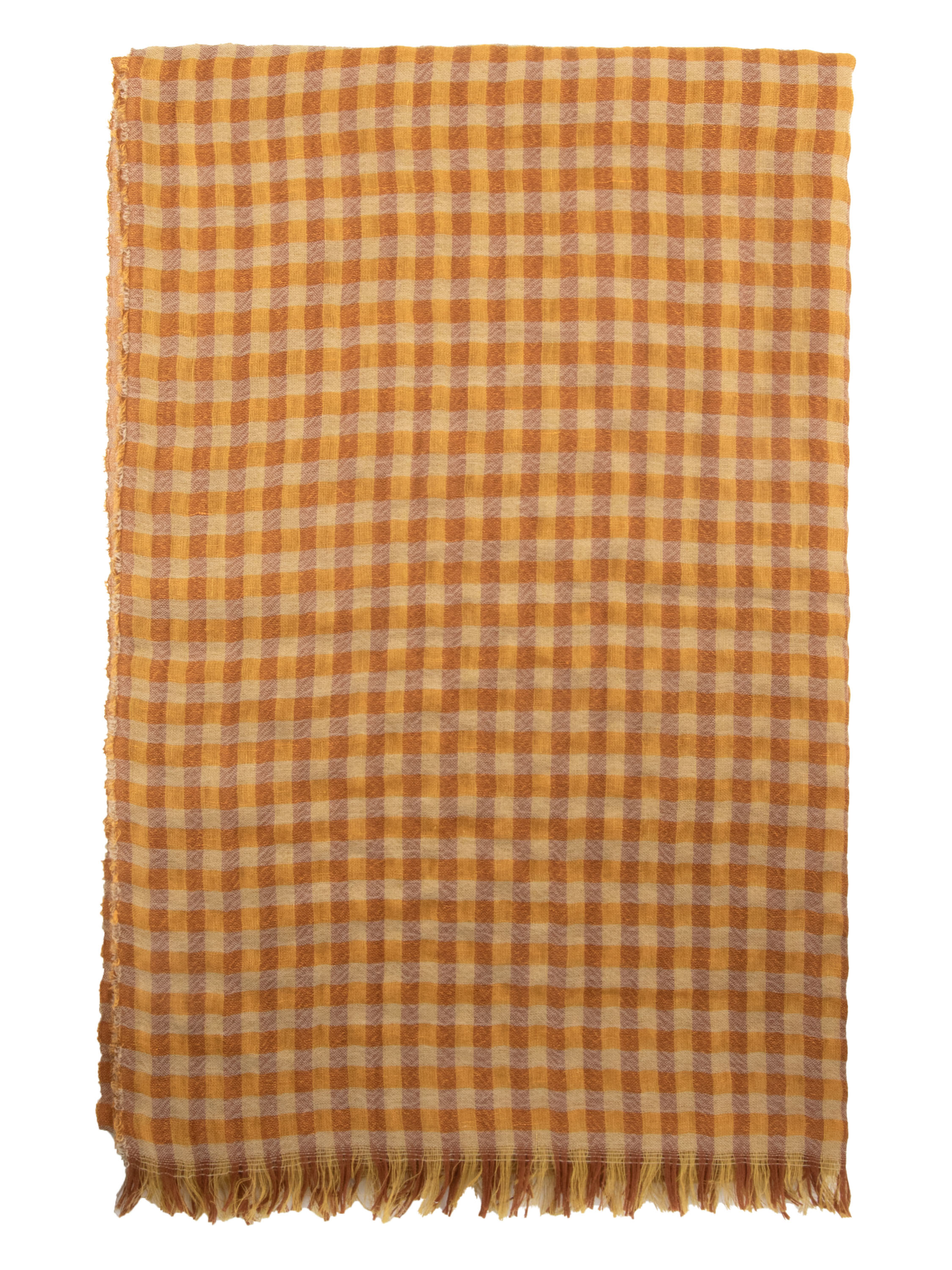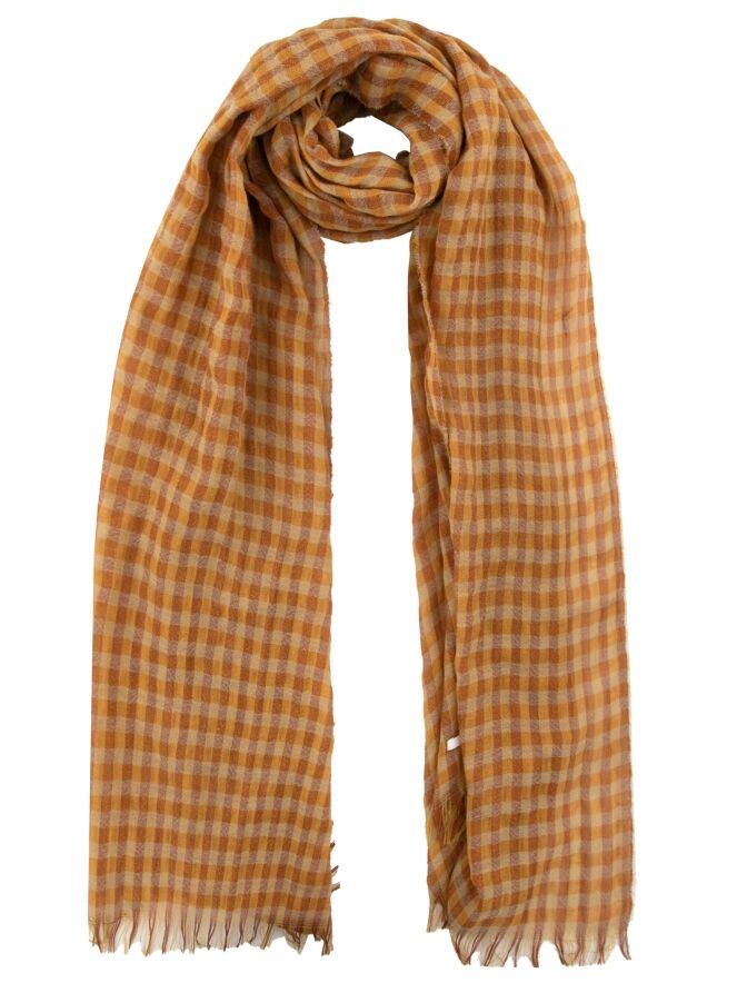Ein luxuriöser, leicht transparenter Schal von Annette Görtz mit einem Karomuster in mehreren Orange- und Beigetönen. Die Kanten des Schals sind fein ausgefranst. Dieser Schal kann von Hand gewaschen werden.
