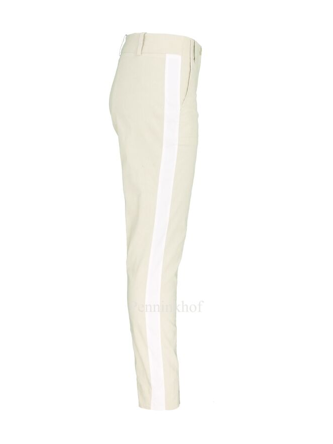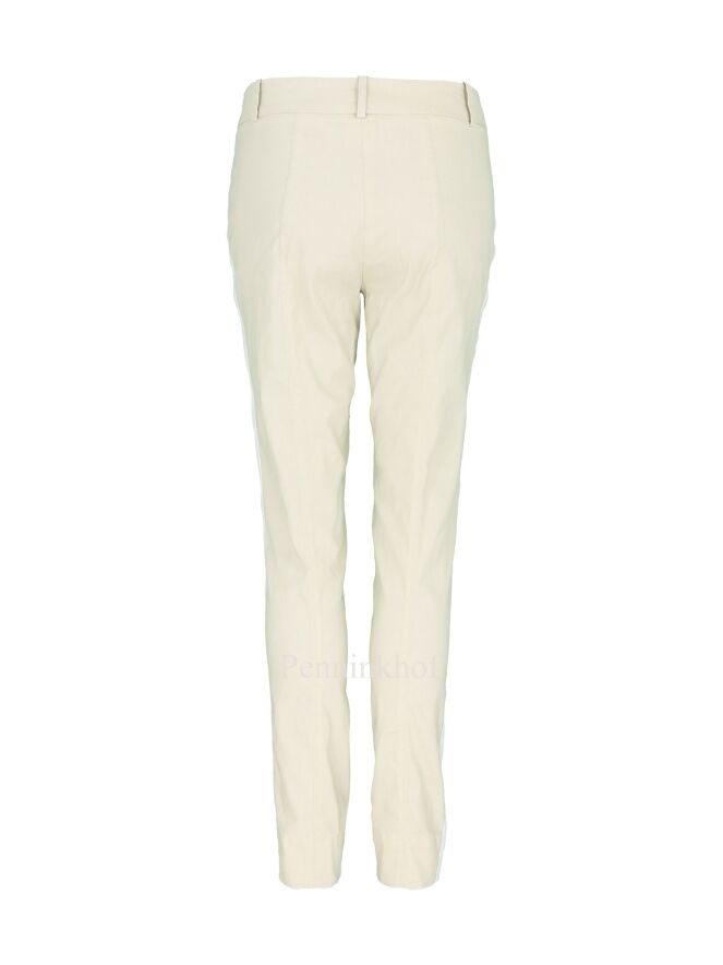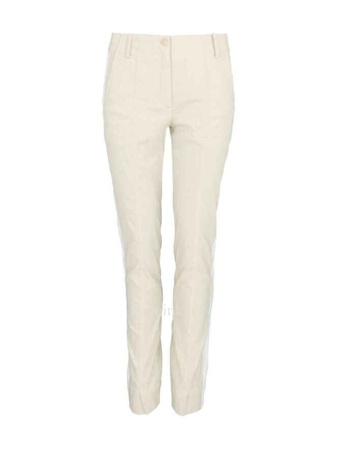 Eine beige Stoffhose der Designermode von Annette Görtz. An den Seiten befindet sich ein breiter weißer Streifen. Der untere Saum der Hosenbeine wird seitlich durch einen kleinen Schlitz akzentuiert. Die Hose kommt mit Eingriffstaschen und kann bei 30 Grad gewaschen werden.
