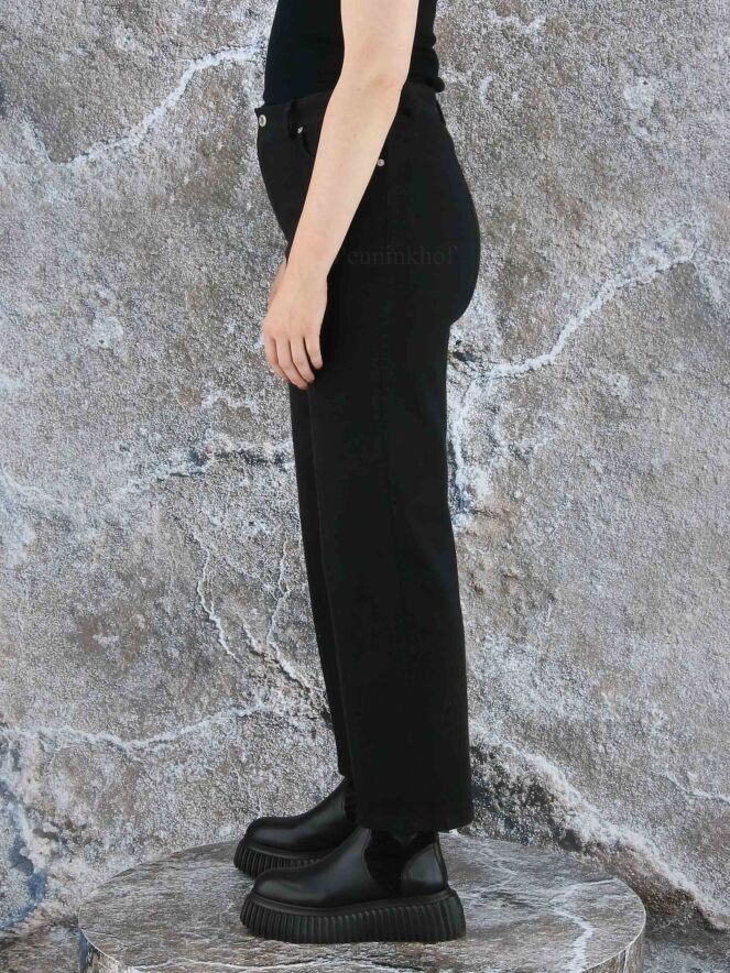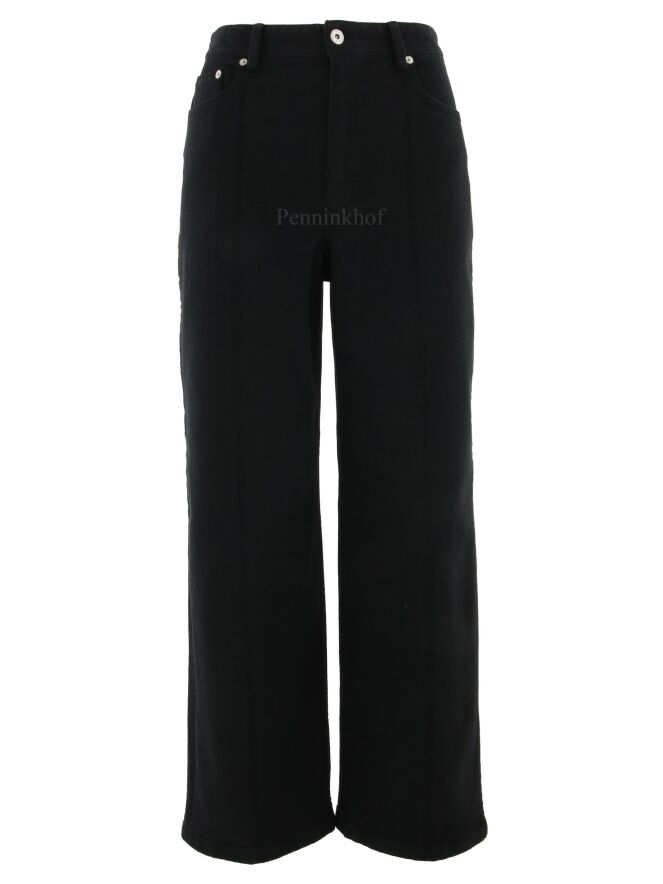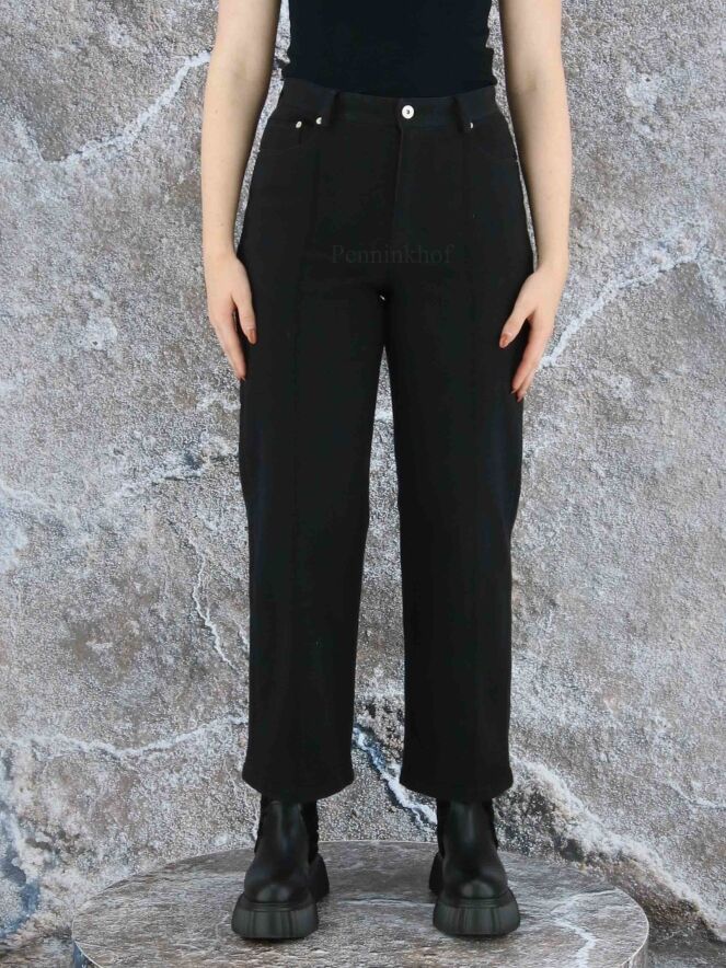 Eine schwarze Jeans der Designermode von Annette Görtz. Die Jeans kommt als 5-Pocket-Modell. Eine dekorative Steppnaht akzentuiert die Mitte der geraden Hosenbeine. Diese Jeans kann bei 30 Grad gewaschen werden.