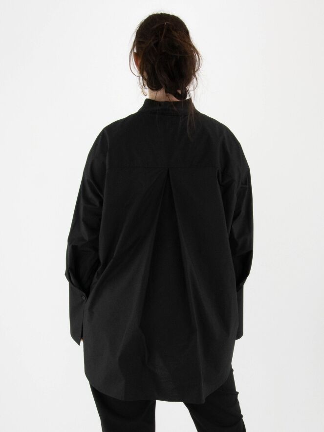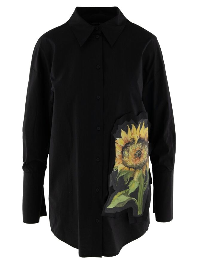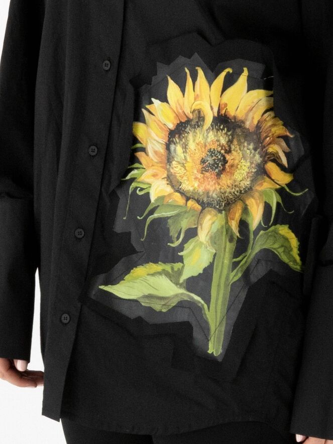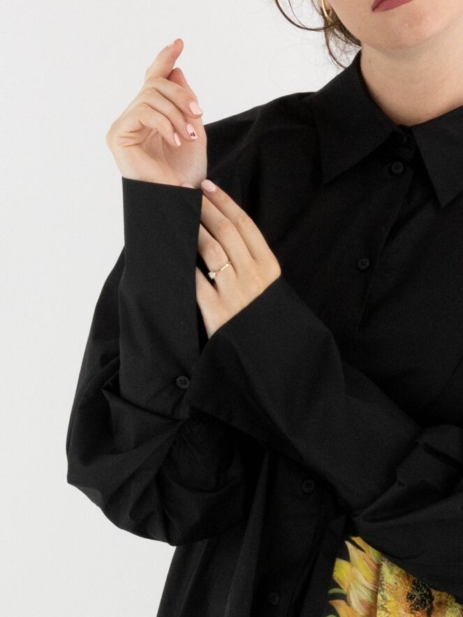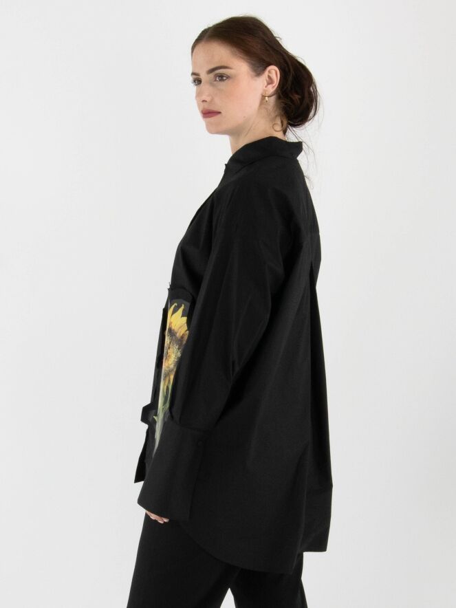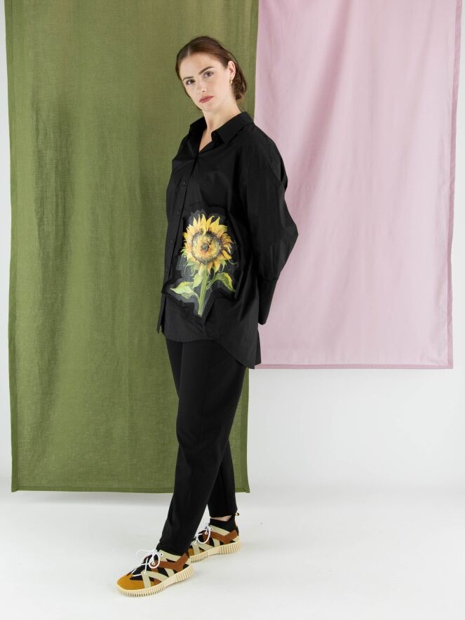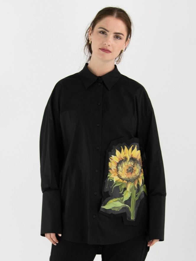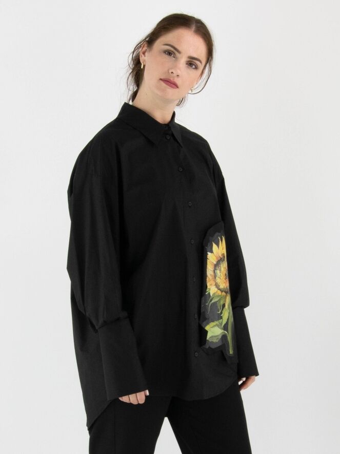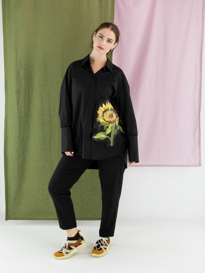 Weit geschnittene Bluse von Annette Görtz in Schwarz. Auf der linken Vorderseite befindet sich ein kontrastierender Stoffeinsatz mit einem ausdrucksstarken Sonnenblumenprint. Die langen Manschetten sind mit feinen Falten verziert. Diese Bluse kann bei 30 Grad gewaschen werden.