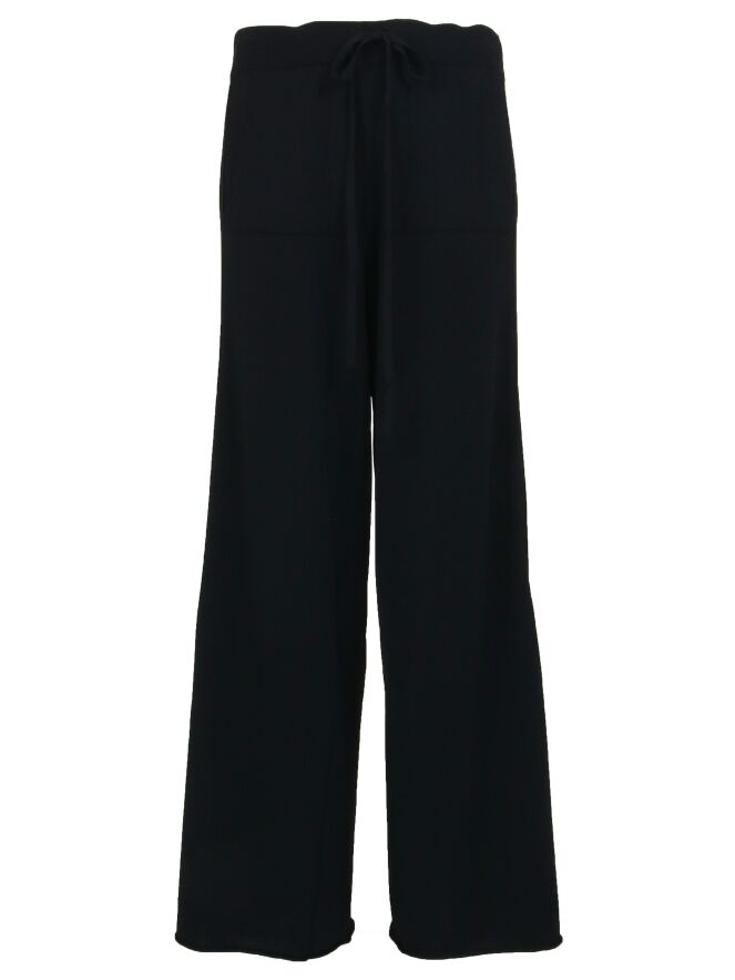 Besonders weite, hochwertige Hose der Designermode von Annette Görtz in Schwarz. Die Taille ist mit einem breiten, elastischen Bund versehen. Unterhalb der Taille befinden sich zwei Taschen. Ein breiter, gerippter Streifen akzentuiert die Längsseiten. Diese Hose kann bei 30 Grad in der Waschmaschine gewaschen werden.
