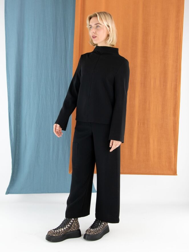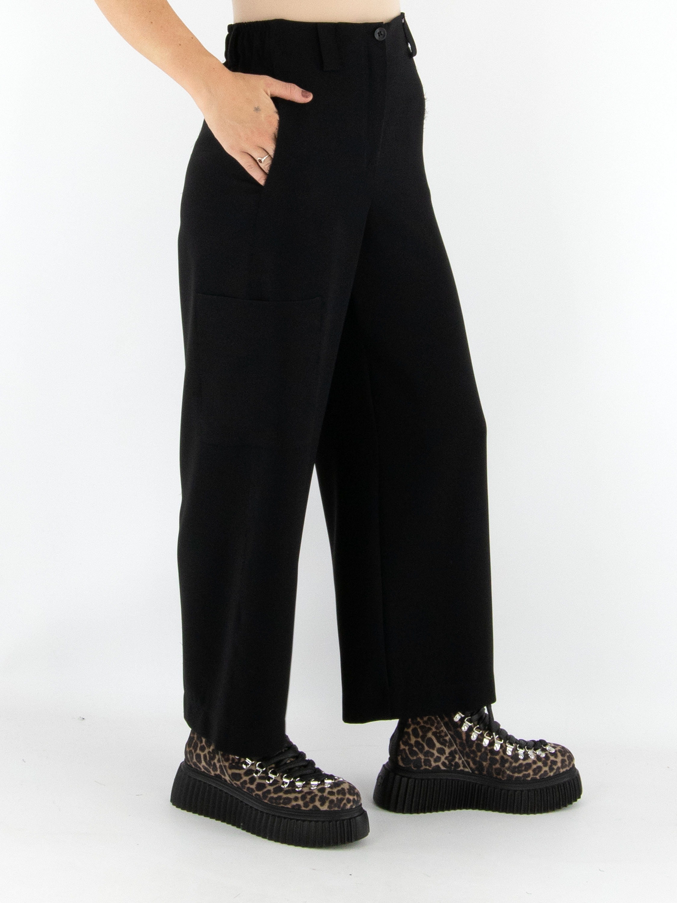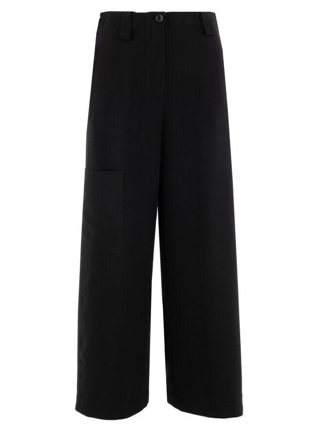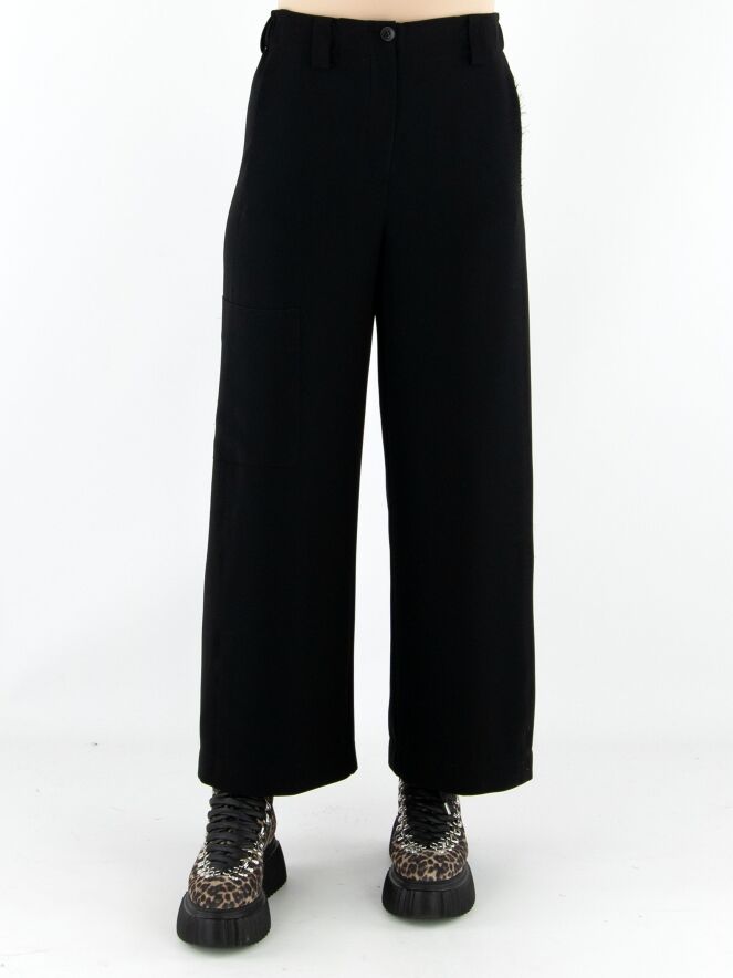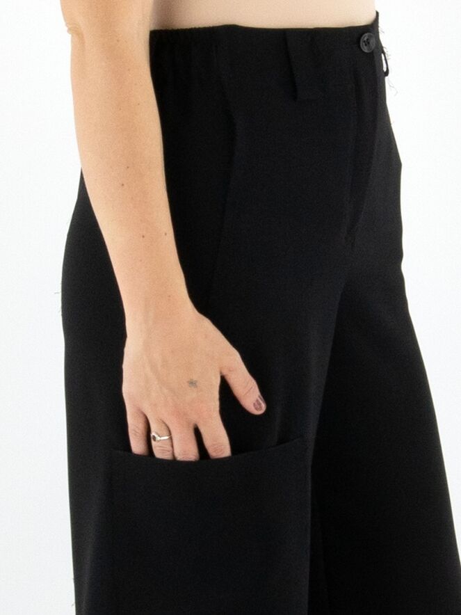 Eine Design-Cargohose von Annette Görtz in einem edlen Schwarztton. In der Taille sind an den Seiten fein plissierte elastische Bänder eingearbeitet. Die Hose verfügt über Eingrifftaschen und eine zusätzliche Tasche am rechten Oberschenkel. Die leicht ausgefransten Seitennähte verleihen der Hose einen modernen und lässigen Look. Diese Hose kann von Hand gewaschen werden.