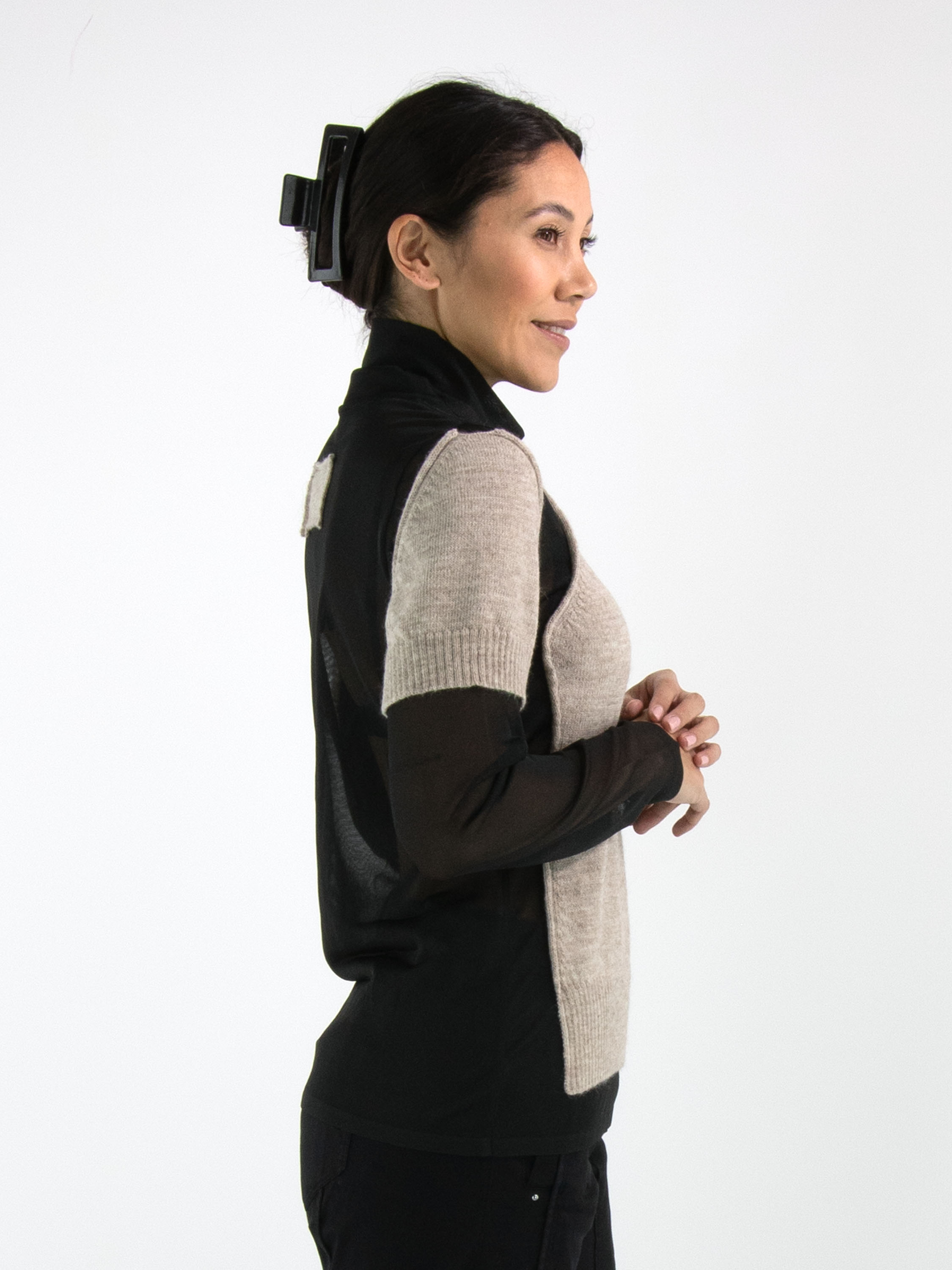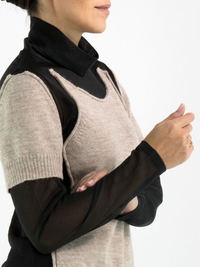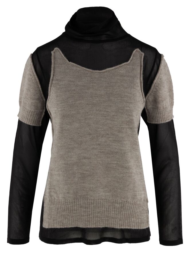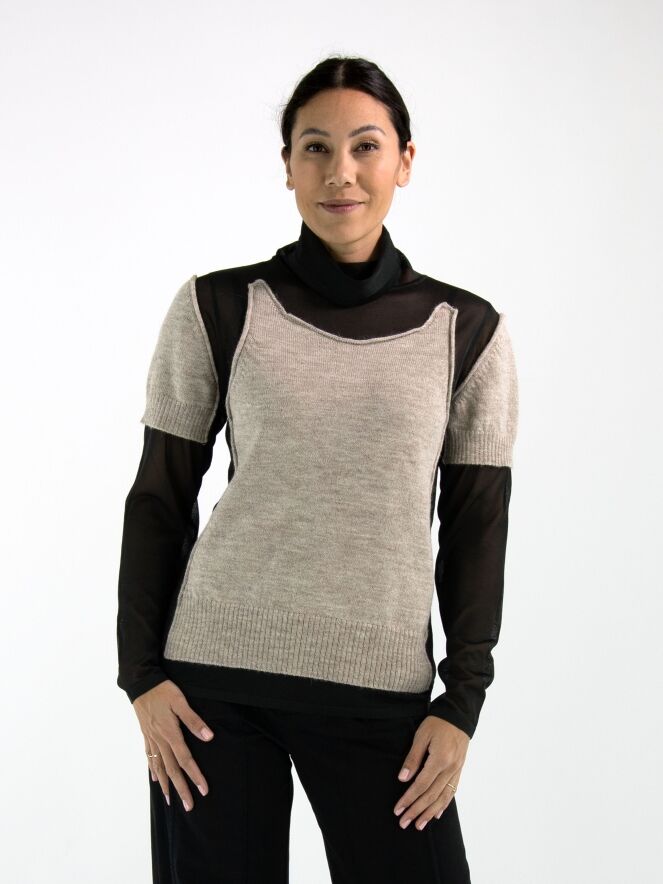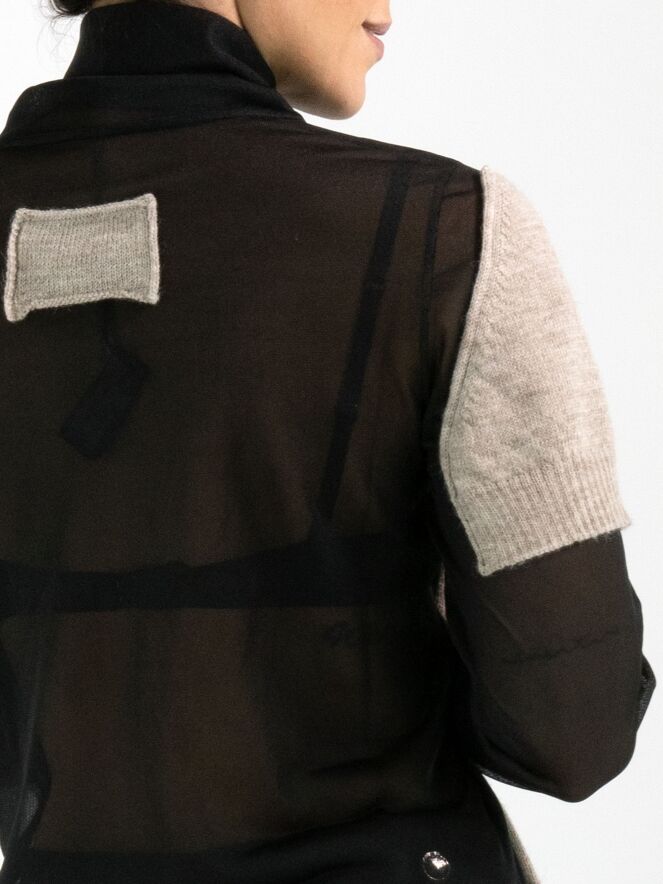 Ein transparentes Shirt von Annette Görtz in Schwarz mit aufgesetzten Strickstoff-Einsätzen in Beige auf der Vorderseite und an den Oberarmen auf Schulterhöhe. Die Einsätze sind lediglich an den Rändern auf dem Voile-Stoff befestigt, wodurch ein moderner, geschichteter Effekt entsteht. Das Shirt hat einen fallenden Kragen und kann per Hand gewaschen werden.