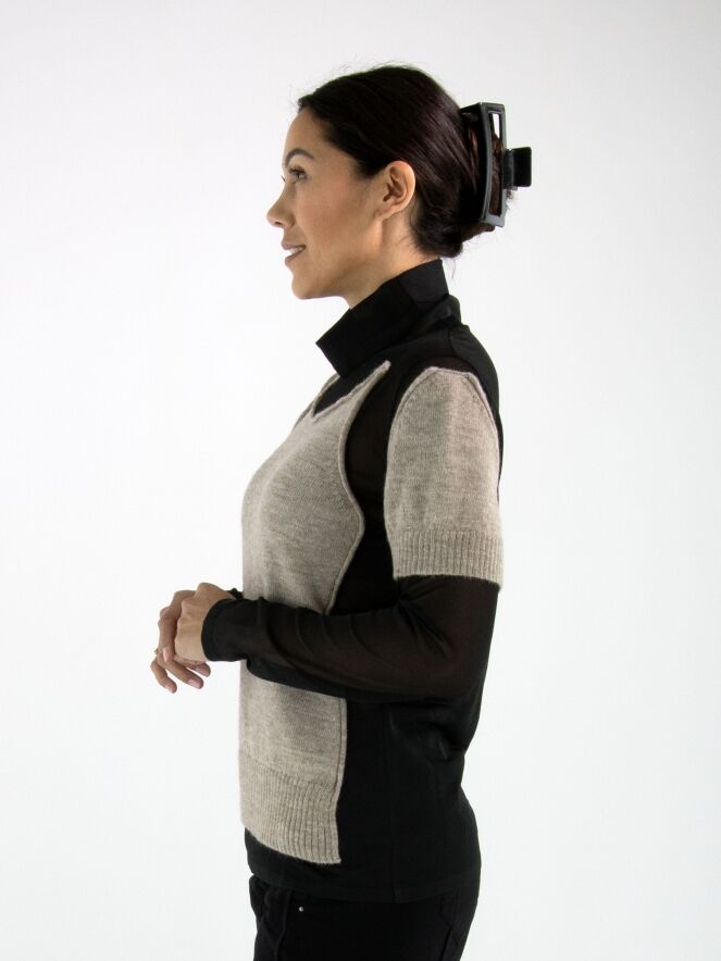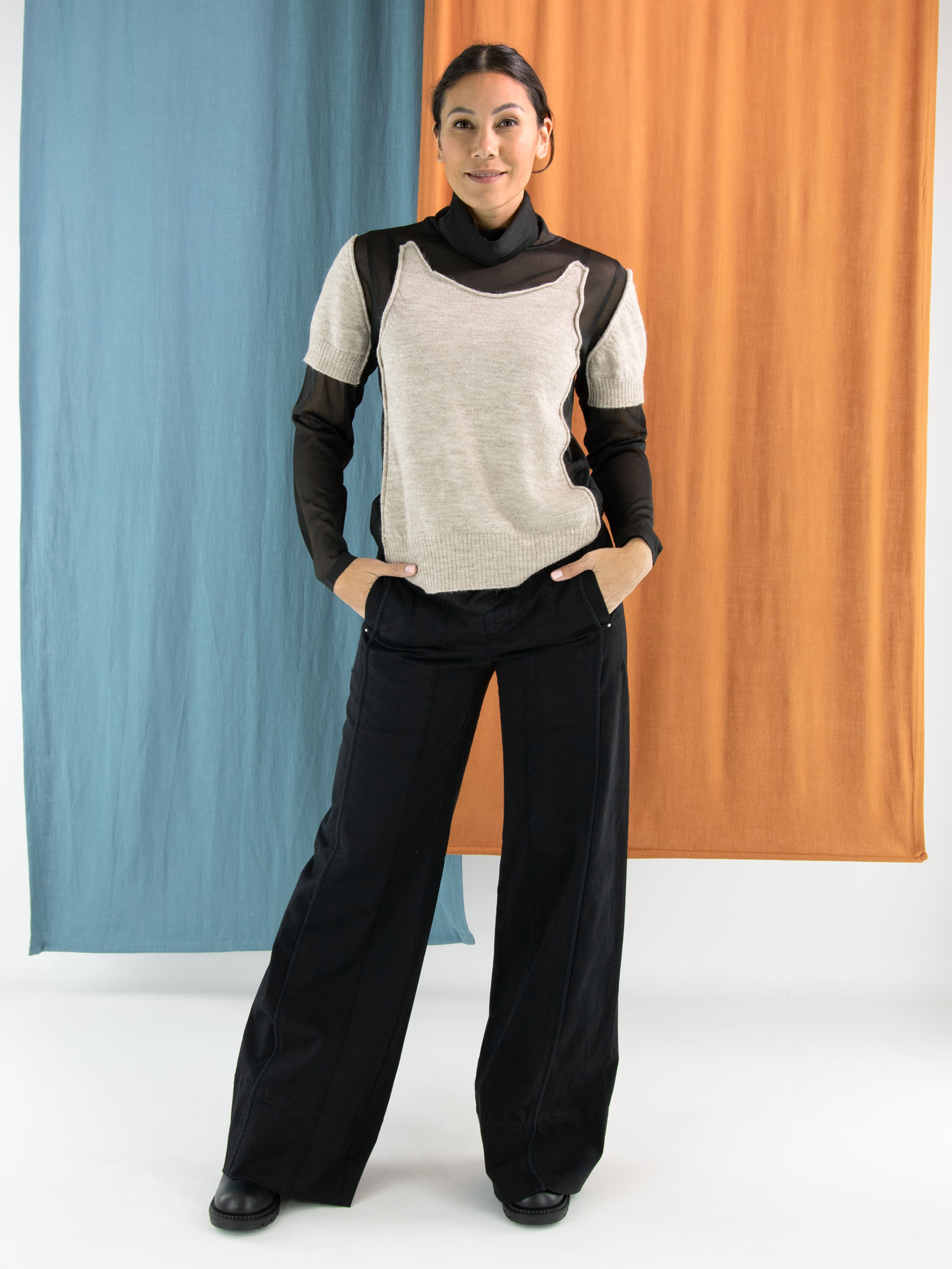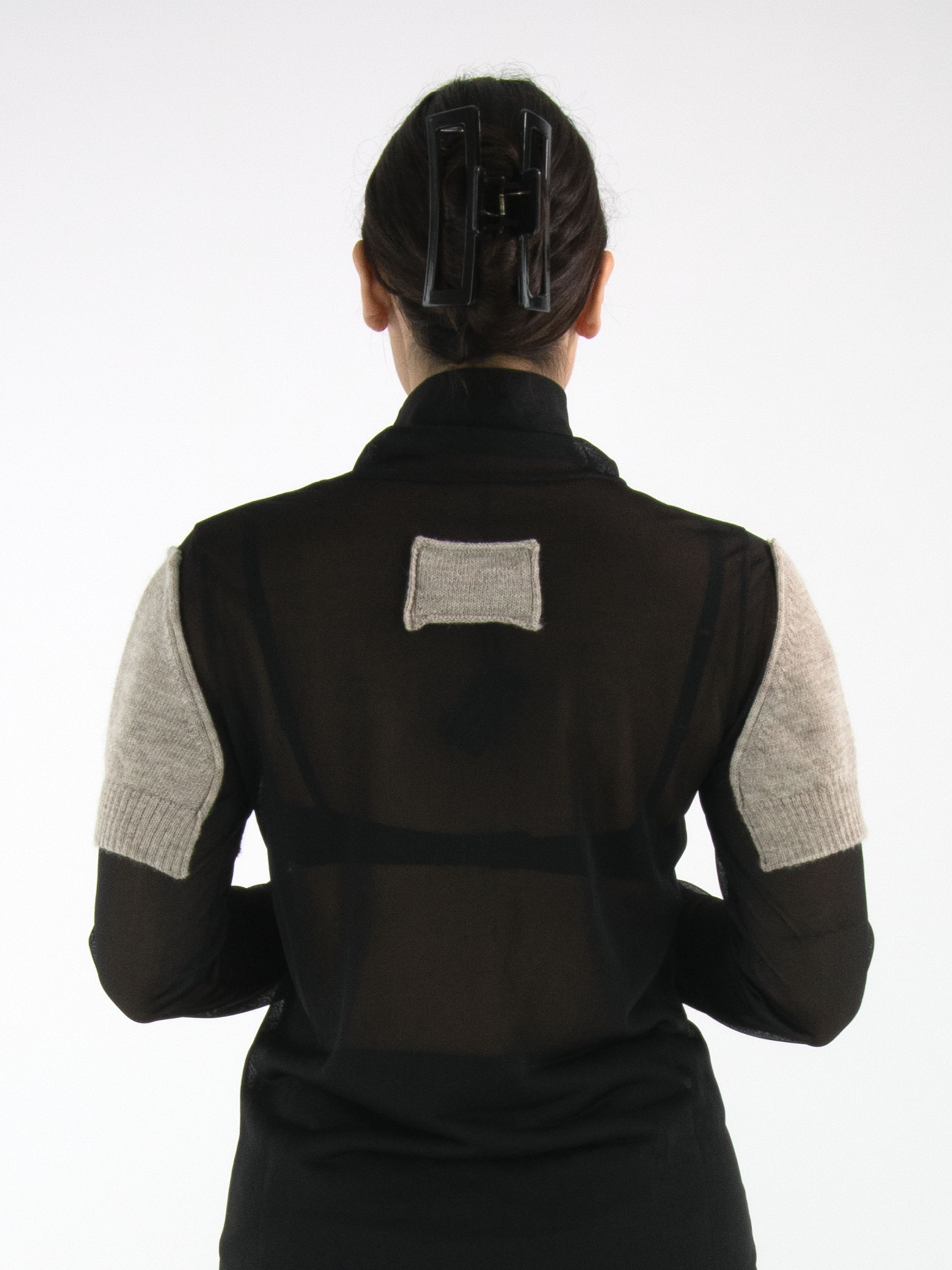 Ein transparentes Shirt von Annette Görtz in Schwarz mit aufgesetzten Strickstoff-Einsätzen in Beige auf der Vorderseite und an den Oberarmen auf Schulterhöhe. Die Einsätze sind lediglich an den Rändern auf dem Voile-Stoff befestigt, wodurch ein moderner, geschichteter Effekt entsteht. Das Shirt hat einen fallenden Kragen und kann per Hand gewaschen werden.